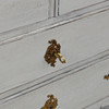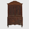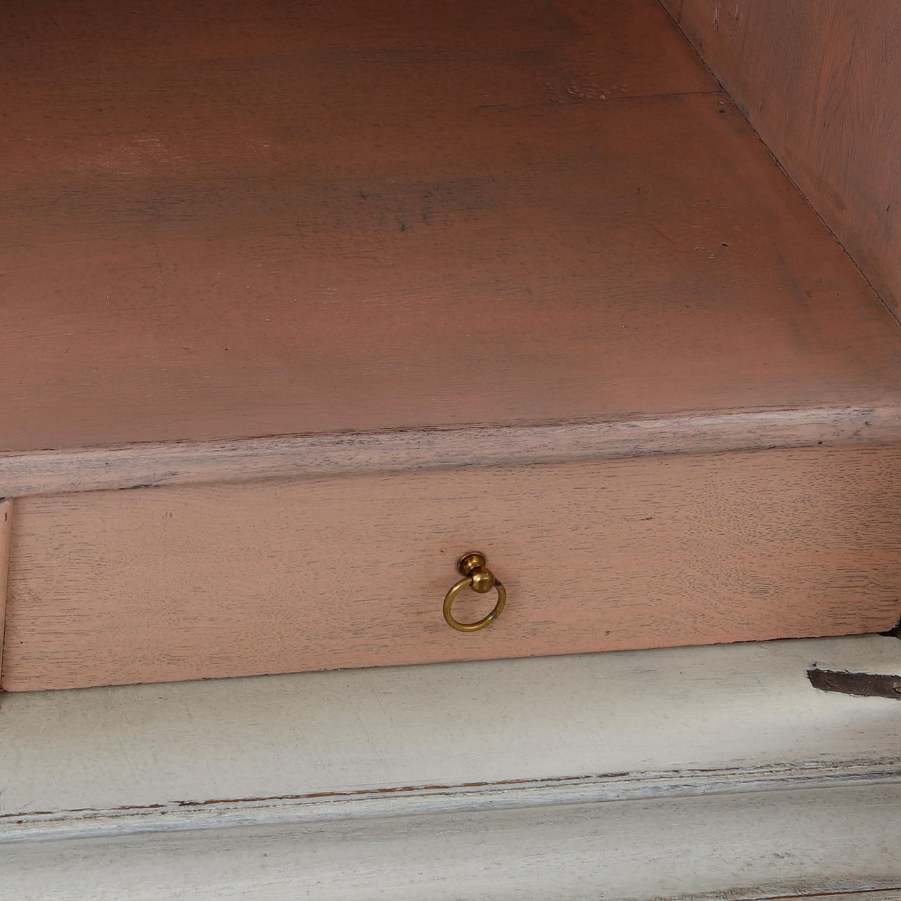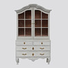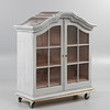 Two parted. Grey painted wood with brass fittings. Four pull-out drawers in three turns and a pair of glazed doors with a rear shelf and drawer interior. Interior lighting. Width about 133 cm, depth 57 cm, height ca 221 cm.