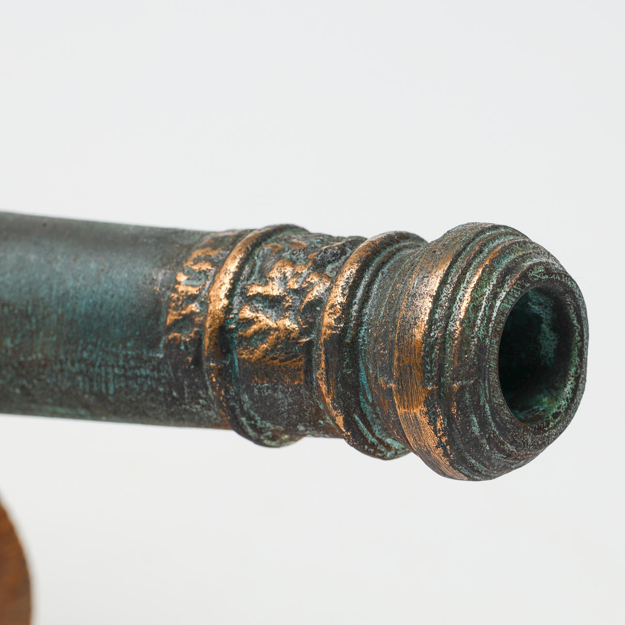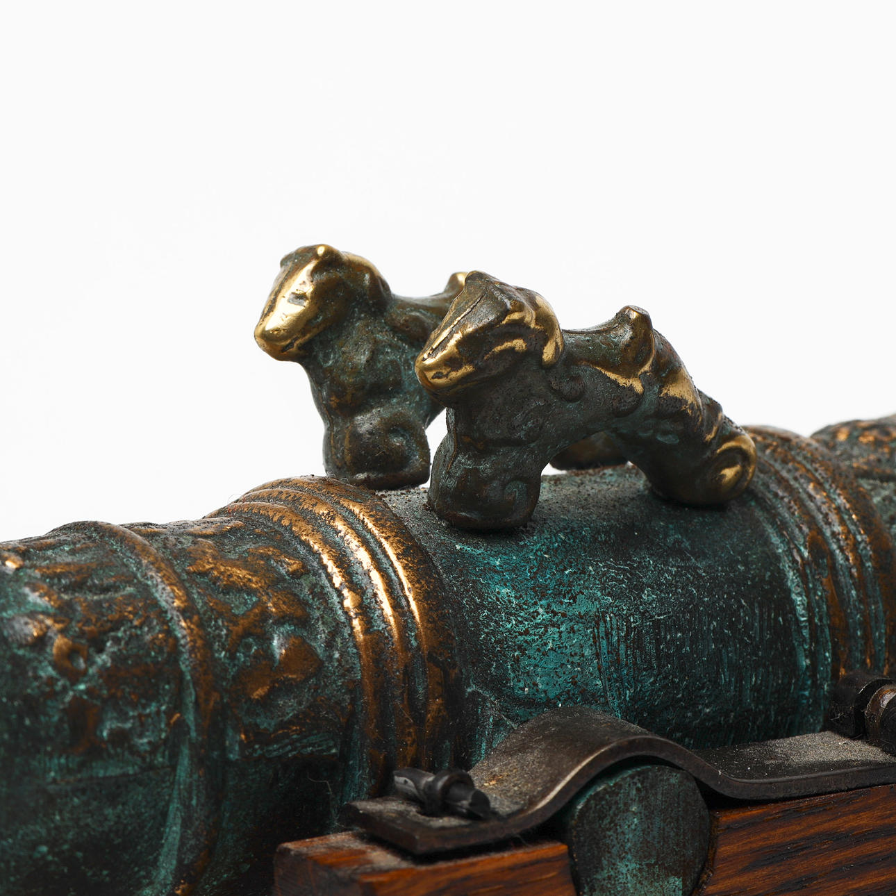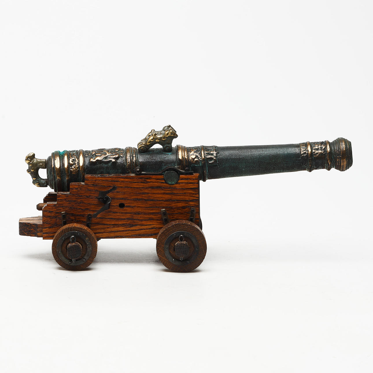 Table cannon on wooden board. Green patinated yellow metal with the coat of arms, second half of the 20th century.
