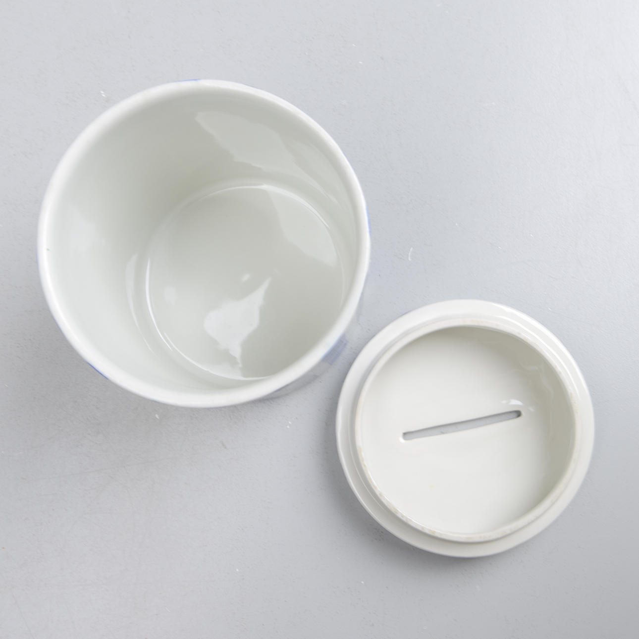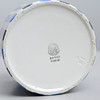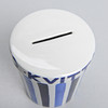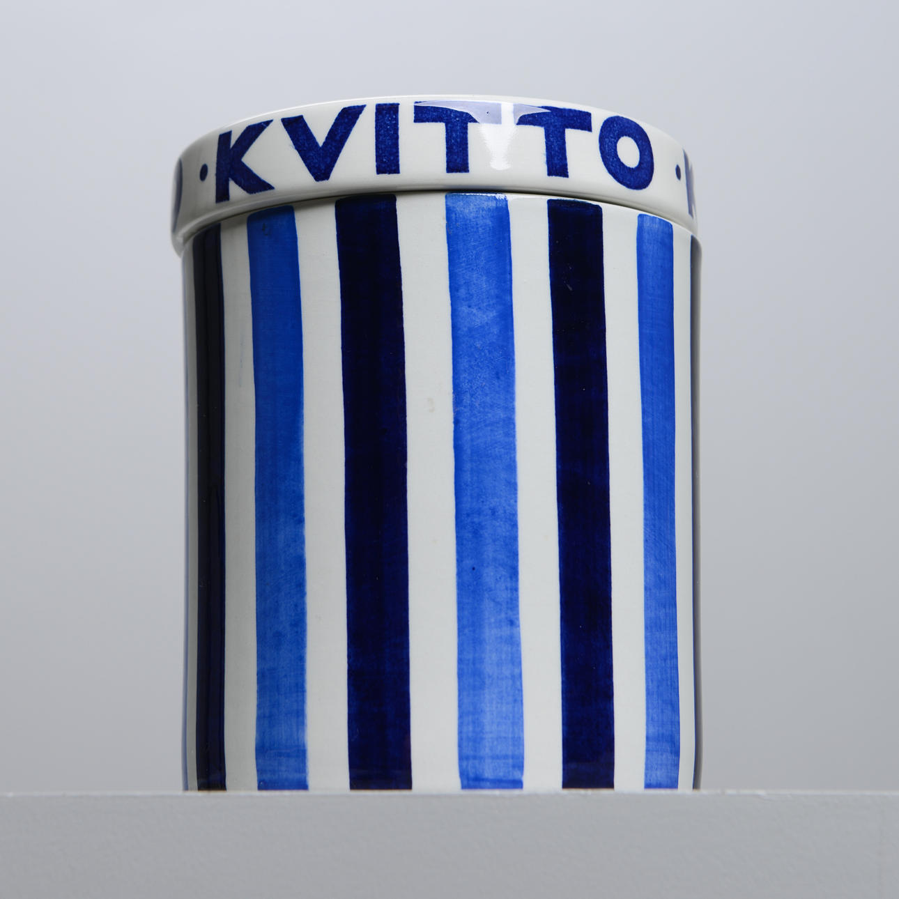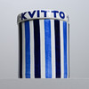 Receipt jar with striped decoration in blue, cover with text "Receipt". Height 15.5, diameter 12.5 cm.