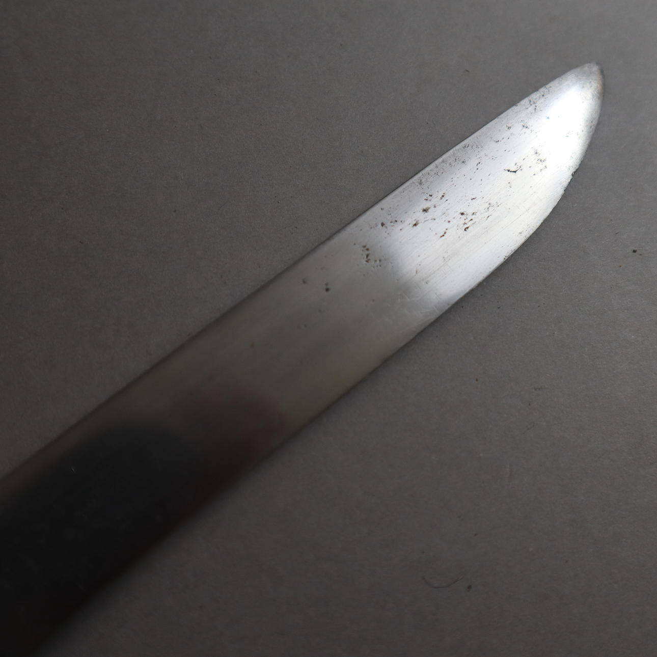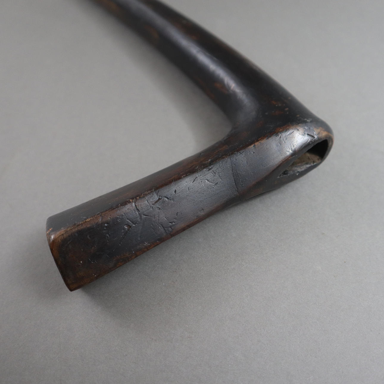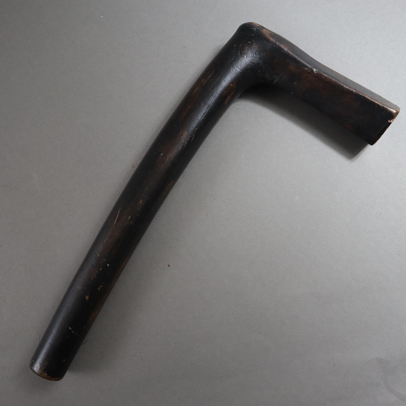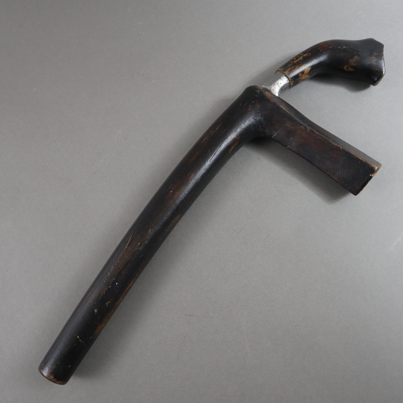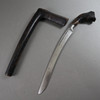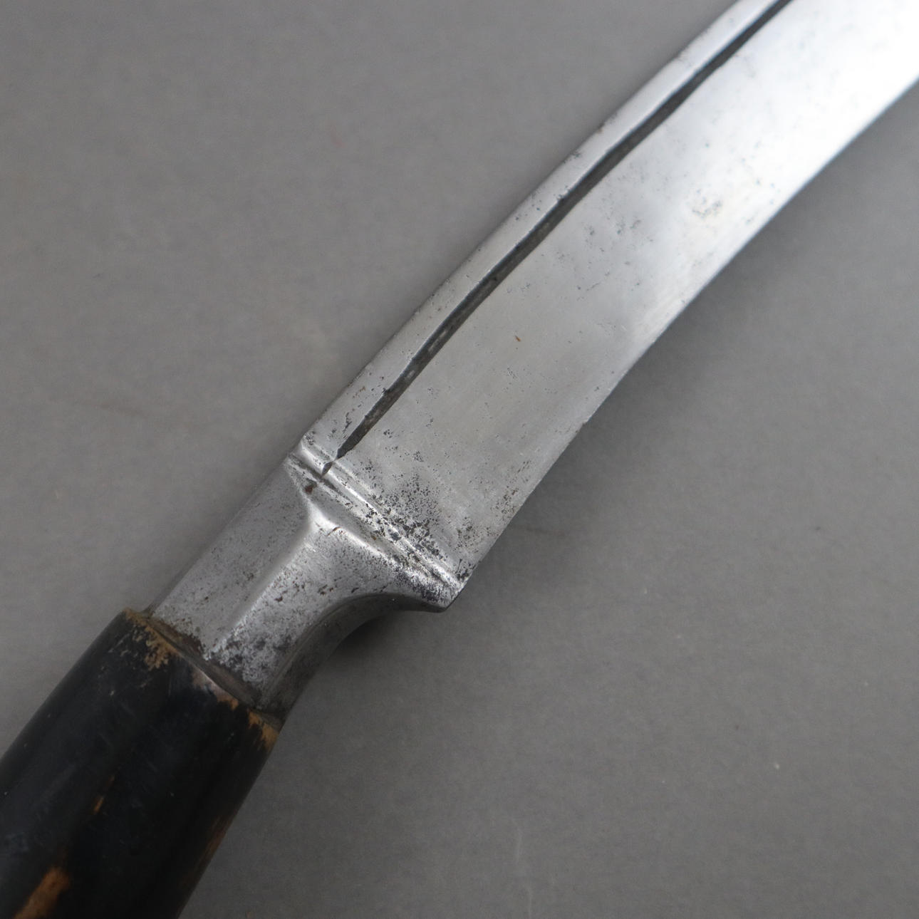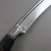massive, slightly curved steel blade with one-sided edge, wooden handle, characteristic wooden sheath, L. blade approx. 27.3 cm/ Total length: approx. 43 cm.