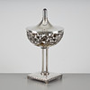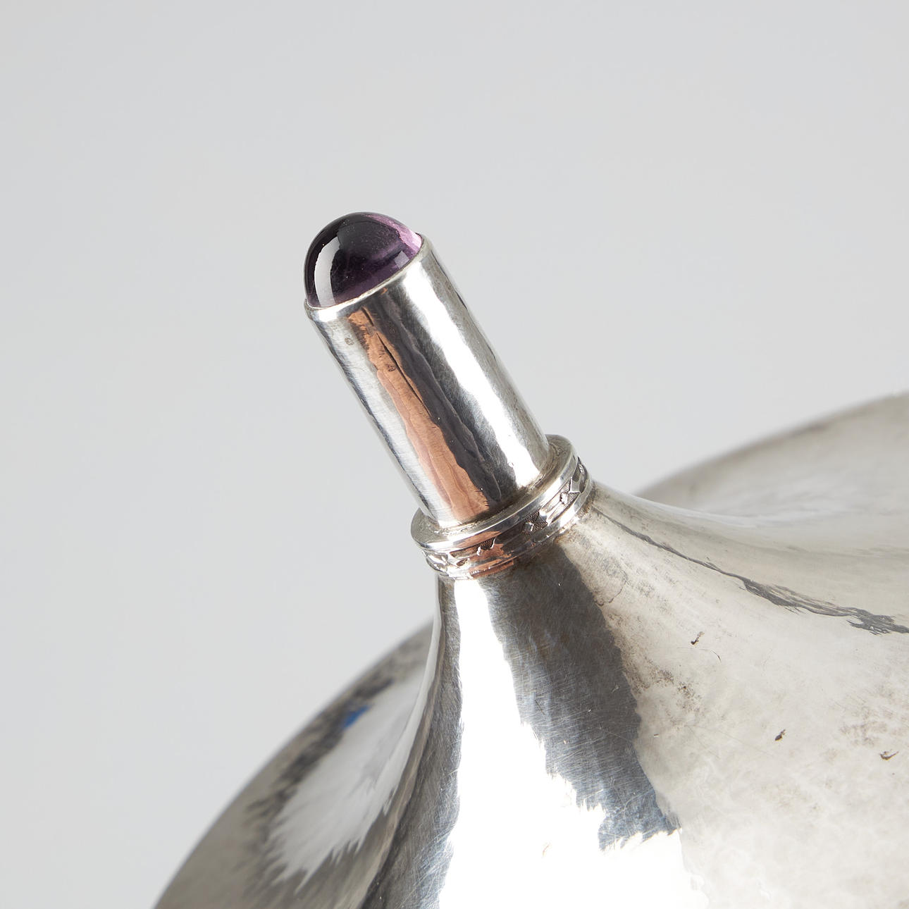 Diameter 13 cm, total height 24.5 cm. Lid with cabochon-cut amethyst. Manufactured by V. Lindman, Helsinki 1914.