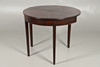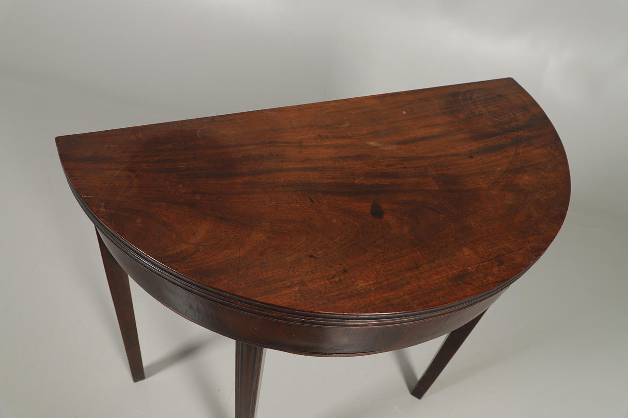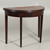 A bow front fold top tea table, the shaped top with a moulded edge, with gateleg support action and square slightly tapering legs. Height 75cm x Width 92cm x Depth 46cm. Open Diameter 92cm.