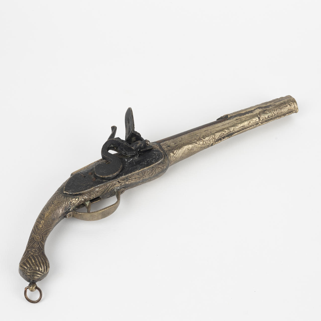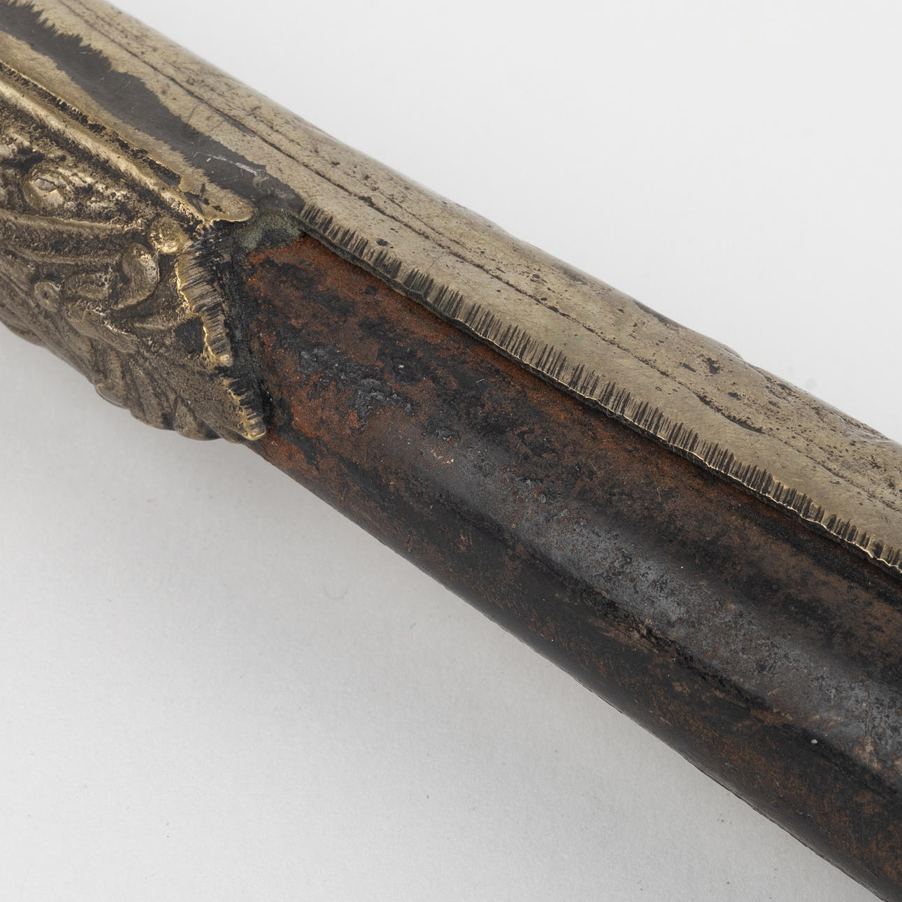 Pipe in metal and with rich white metal fittings decor. The length of the barrel is about 18.5 cm and the total length is about 40 cm.