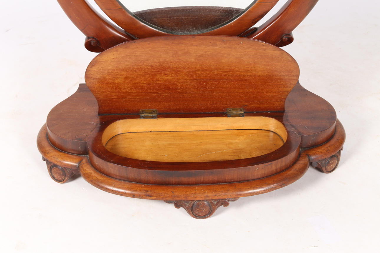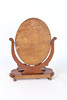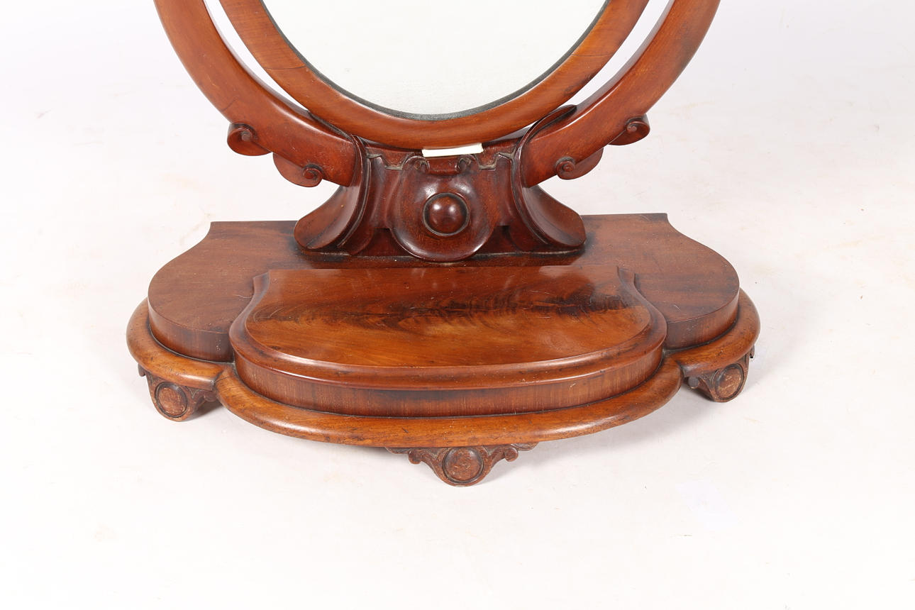 A Victorian mahogany oval dressing table mirror, having a oval glass plate above a serpentine base, 81cm high.