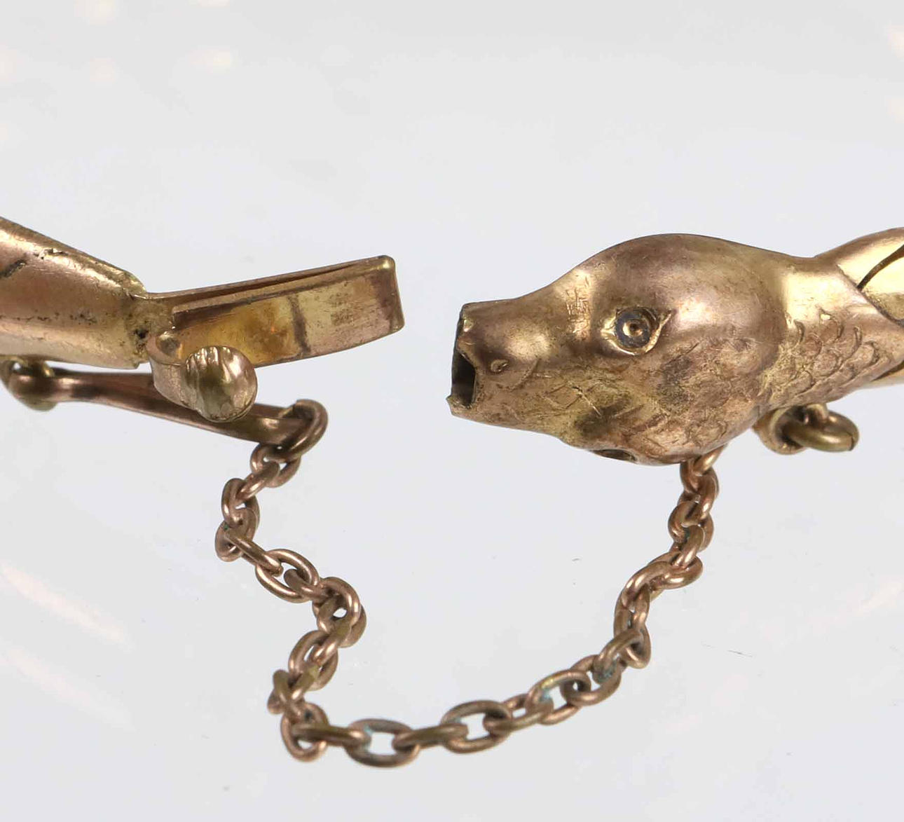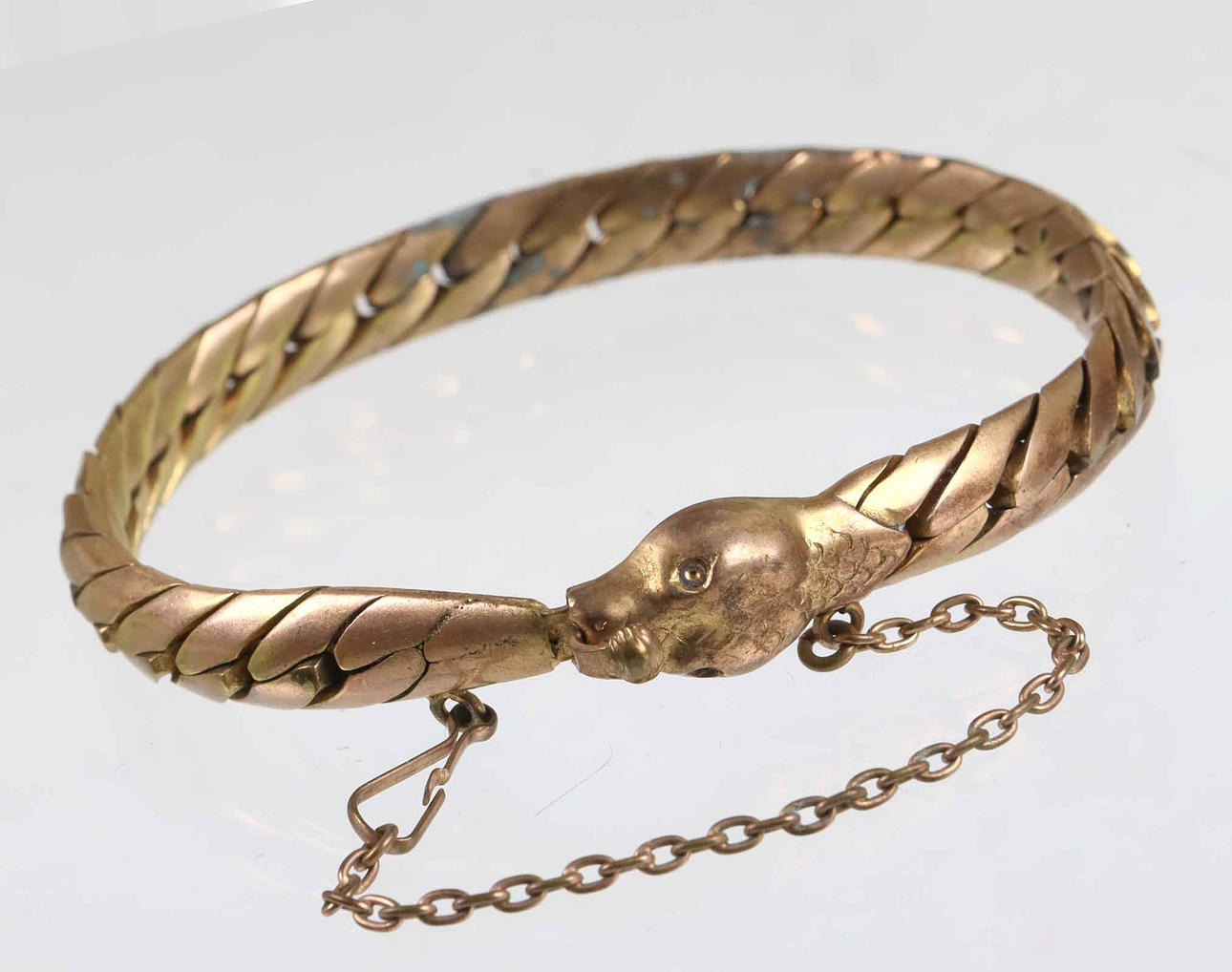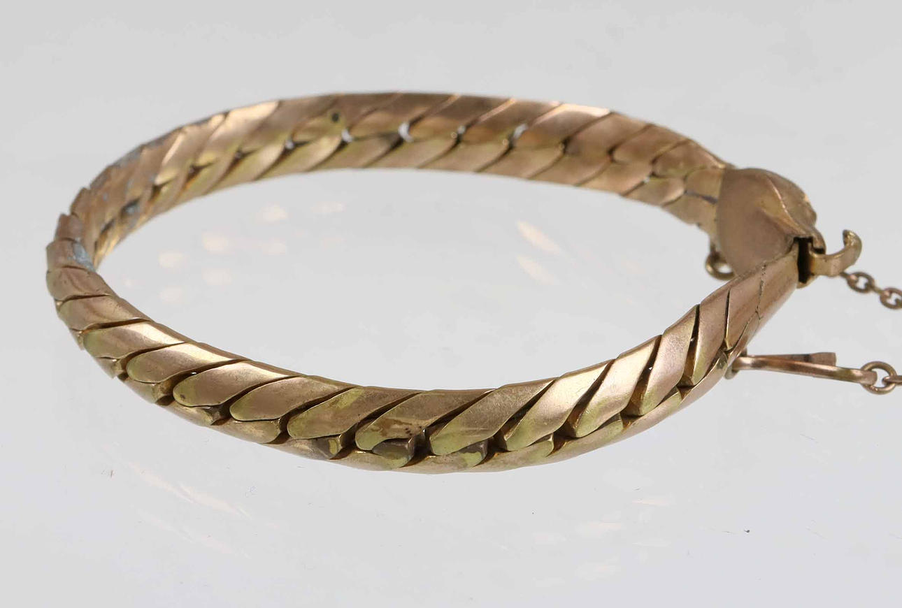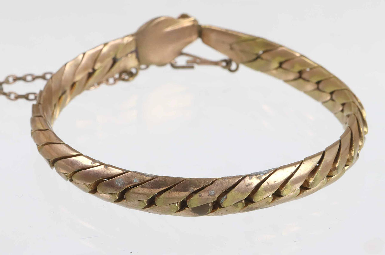 1920s snake bracelet. The piece of jewelry from the 1920s is completely gilded and smooth thanks to the mutually movable armored links in rounded shape. The buckle is shaped like a snake head and is secured by a chain. Width 8 mm, length 19.5 cm, weight 28.7 grams.