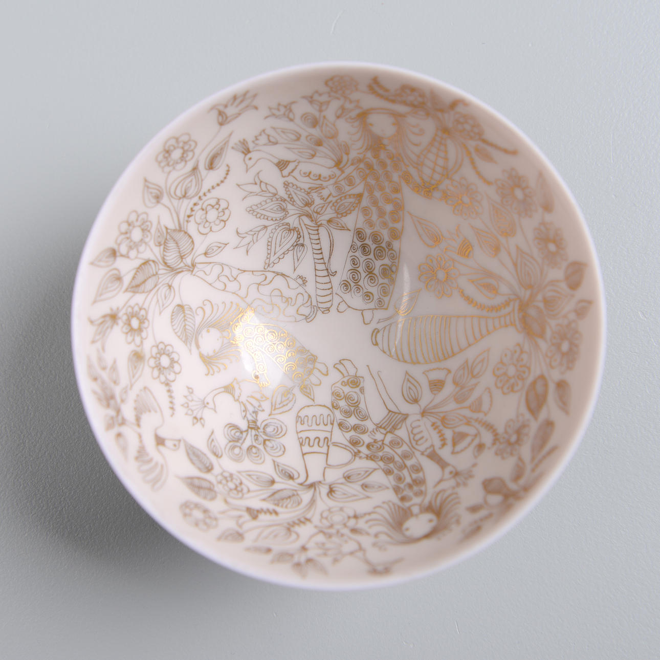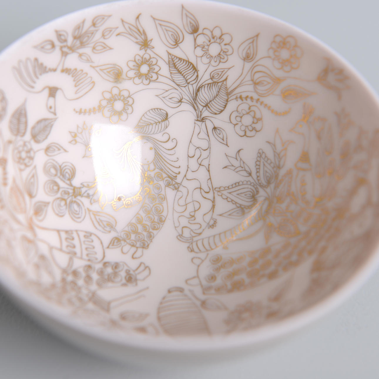 Porcelain. Gold painted decor of girls, peacocks, flowers and more against light glaze. Ø 10 cm. Height 5 cm.