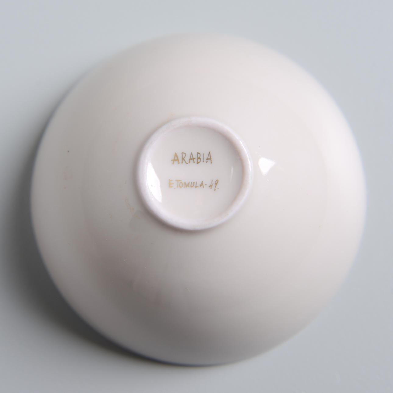Esteri Tomula is sadly unknown in Sweden. She joined Arabia in 1947, working first in the art industry department, then in the design department as a pattern designer on porcelain. Her decors are today among the most sought after in countries such as Japan, Taiwan and South Korea when it comes to Swedish and Finnish porcelain from the “golden years” 1950-80. This bowl is an early example of her decorative talent. Literature: Helena Leppänen, Esteri Tomula, 2013. /MP