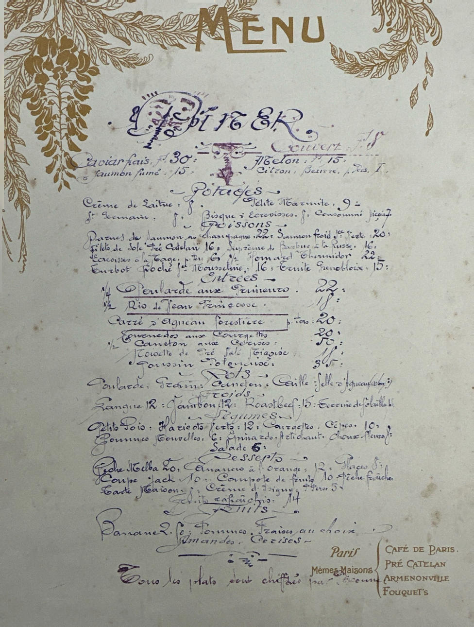 A Georges Redon lithograph menu for Cafe de Paris, 32.5 x 44cm.