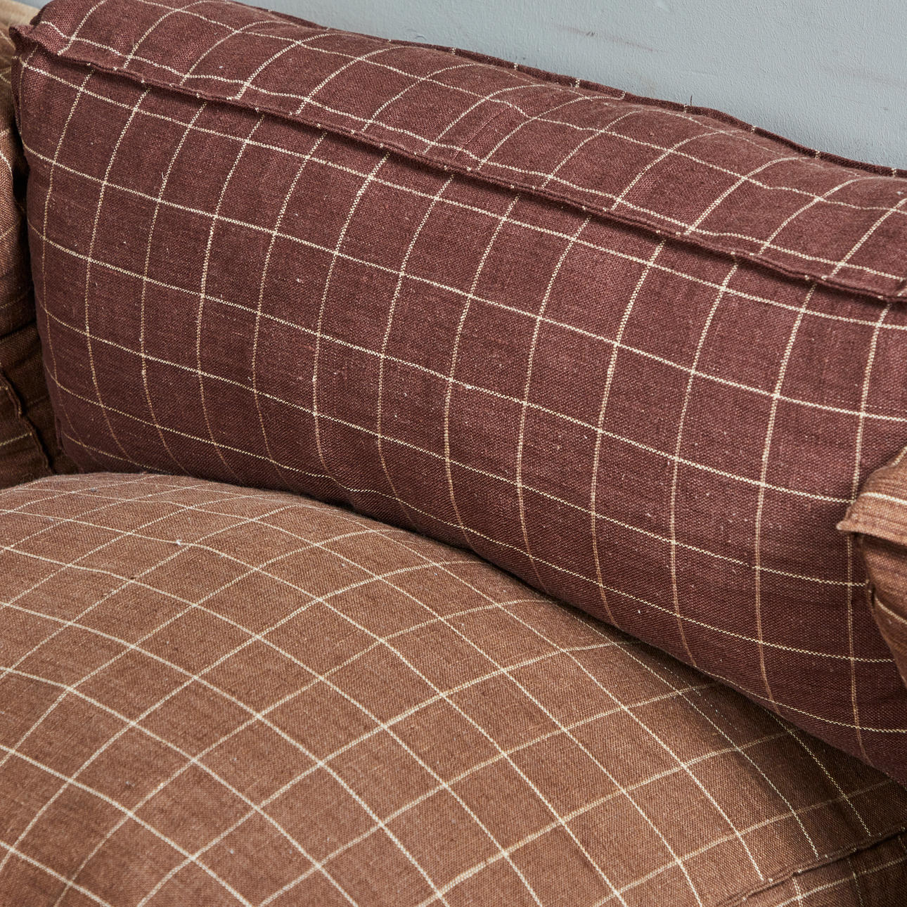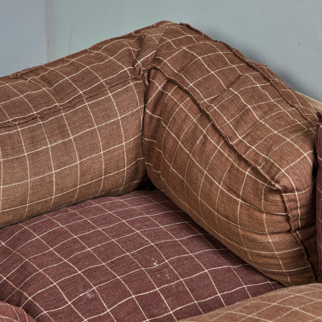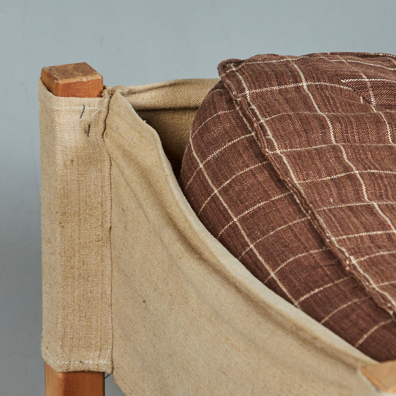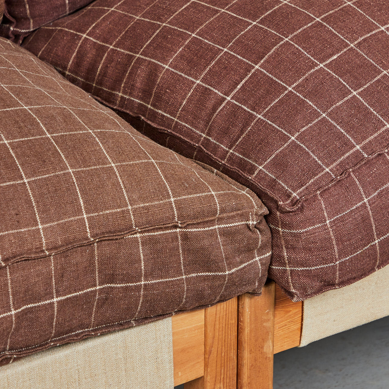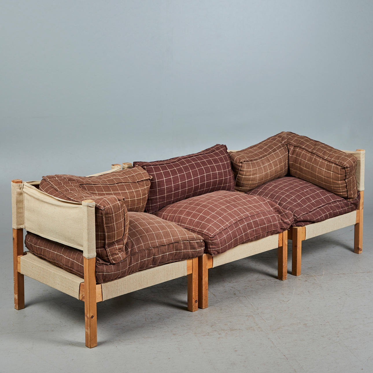 Ikea, five-piece modular sofa/sofa, pine, linen, 1970s, Germany. Ensemble consisting of five modules, including two corner modules, each with a pine wood frame, a beige-colored linen fabric covering and loosely placed seat and back upholstery made of brown linen fabric with beige squared, each: H.70cm, seat height: 45cm, W.70cm, D.70cm. (5).