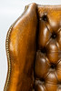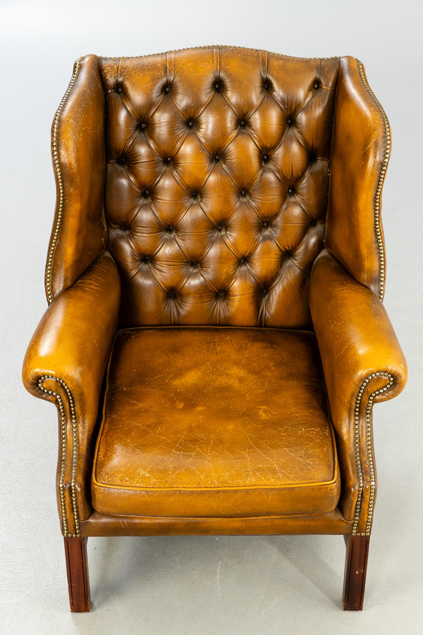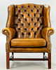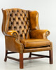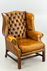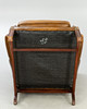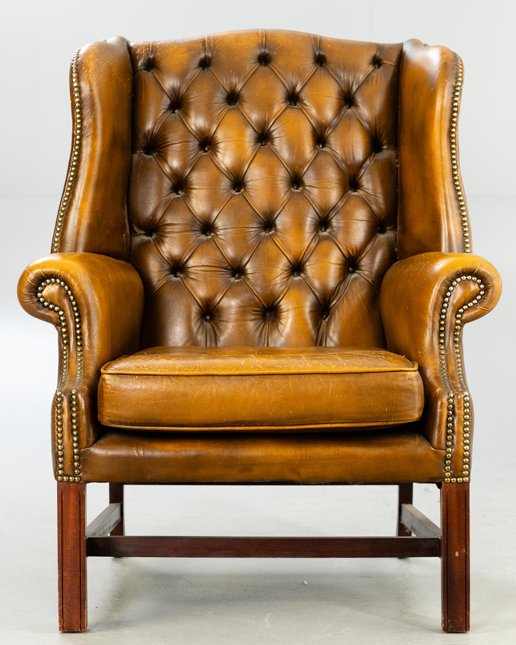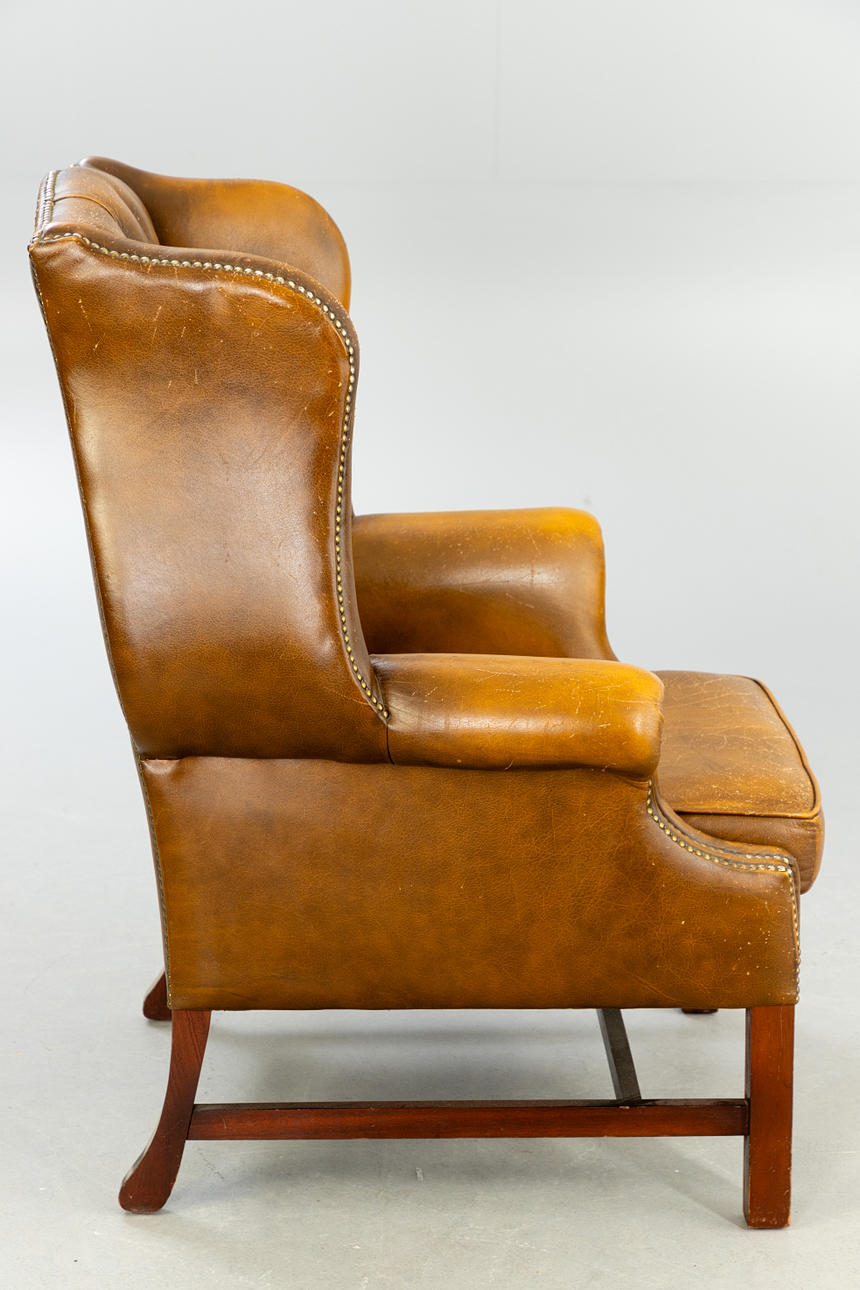 Wood, stained mahogany/leather, light brown. Wooden frame on braced square legs, grooved on the face. Loose cushion on rectangular seat and swinging armrests. The High Ridge is capitalising.