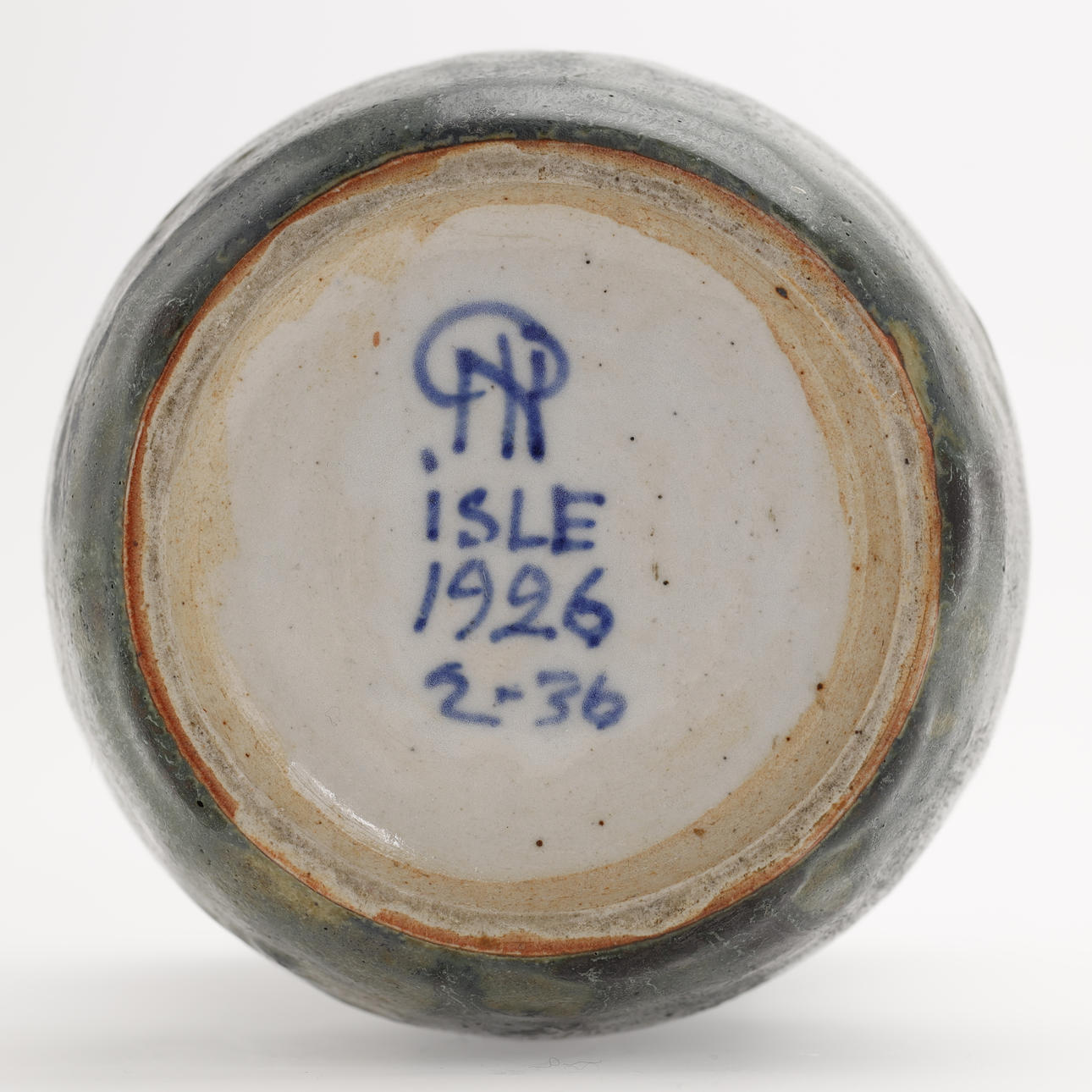 Vase by Patrick Nordström, own workshop, green glaze. Tagged with: Patrick Nordström's monogram, “ISLE”, “1926", “2-36".