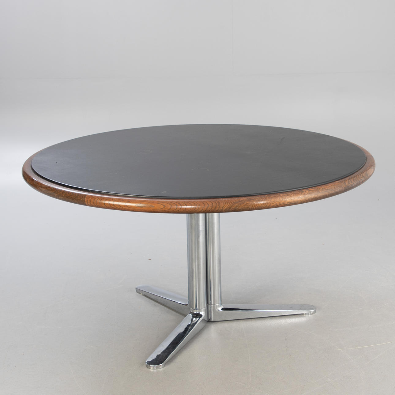 Design from the 1970s. Black leather-covered oak panel on a chrome-plated steel base.