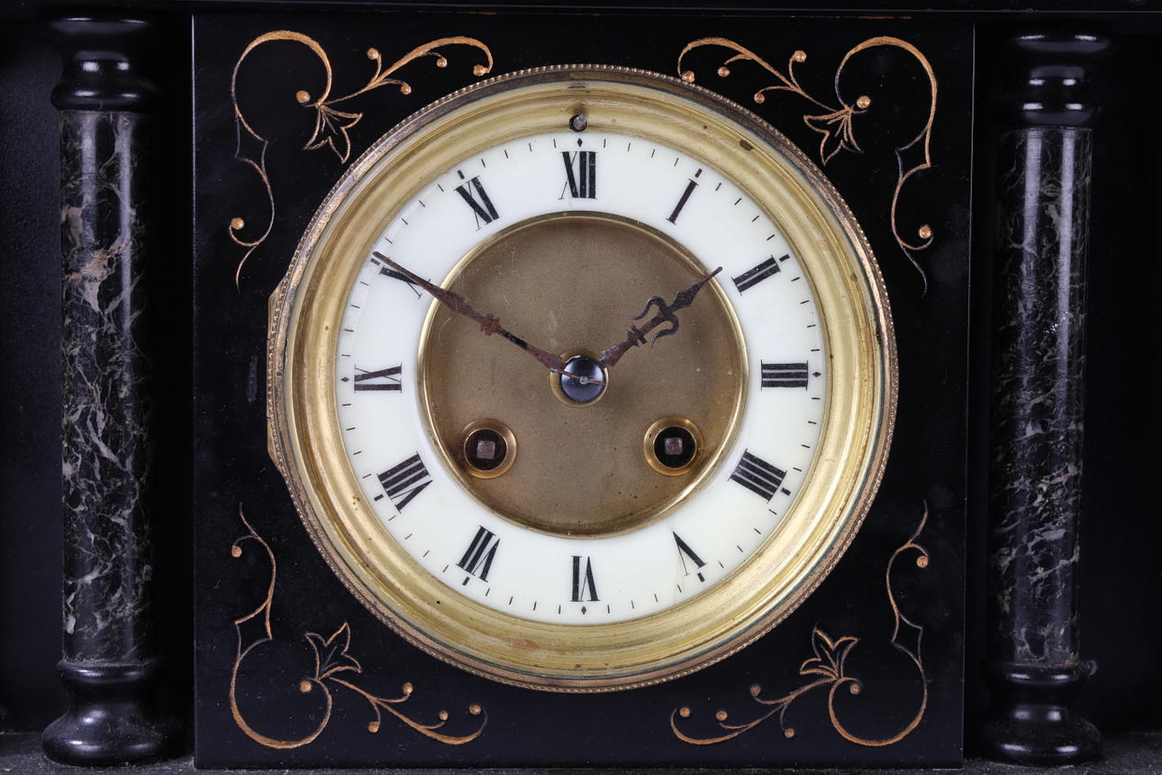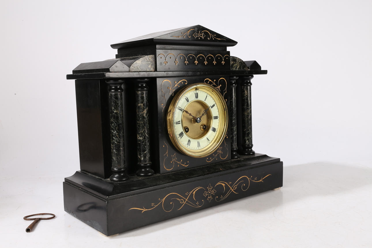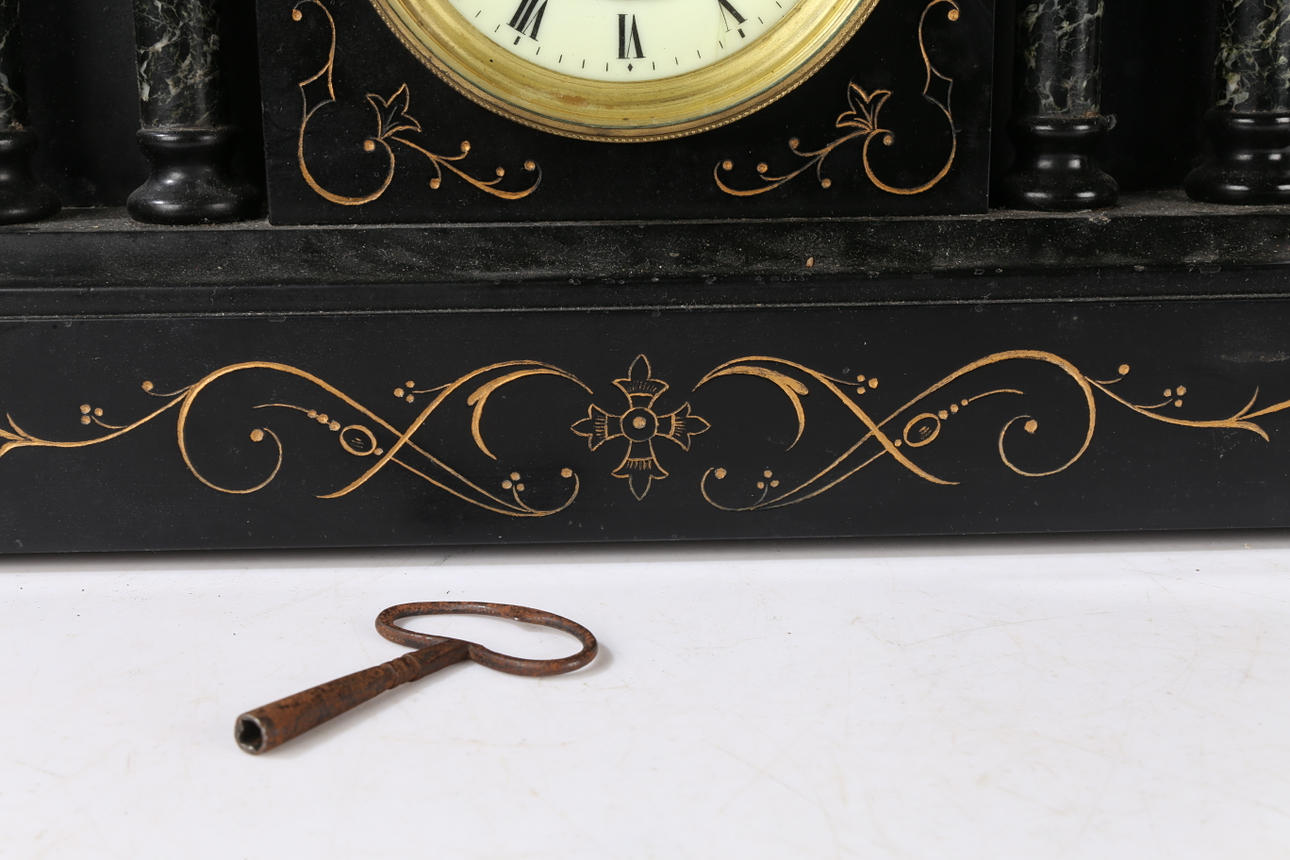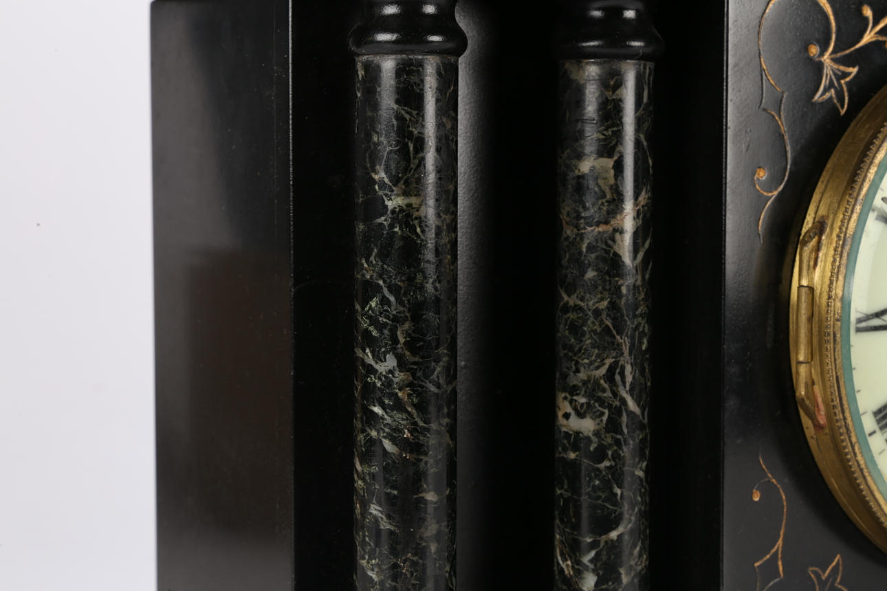 A Victorian black slate mantle clock, of architectural form and having black and grey veined marble columns, and a white dial with Roman numerals, 37cm wide.
