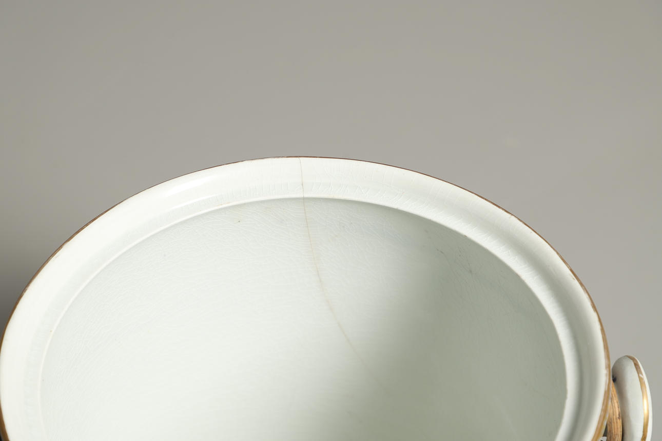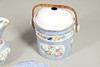 Crack to slop pail, riveted repair to jug, general surface wear.