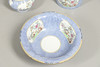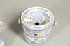 comprising a slop pail with drainer, 38cm high inc. handle, a wash jug, 28cm high and basin, 43cm diameter, decorated with panels of flowers and exotic birds to a blue flowerhead ground.