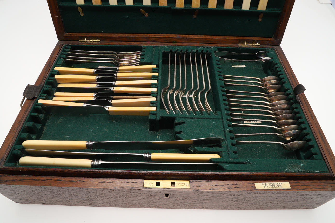 3232018. A TABLE TOP CANTEEN OF RAT TAIL PATTERN FLATWARE IN OAK CASE.