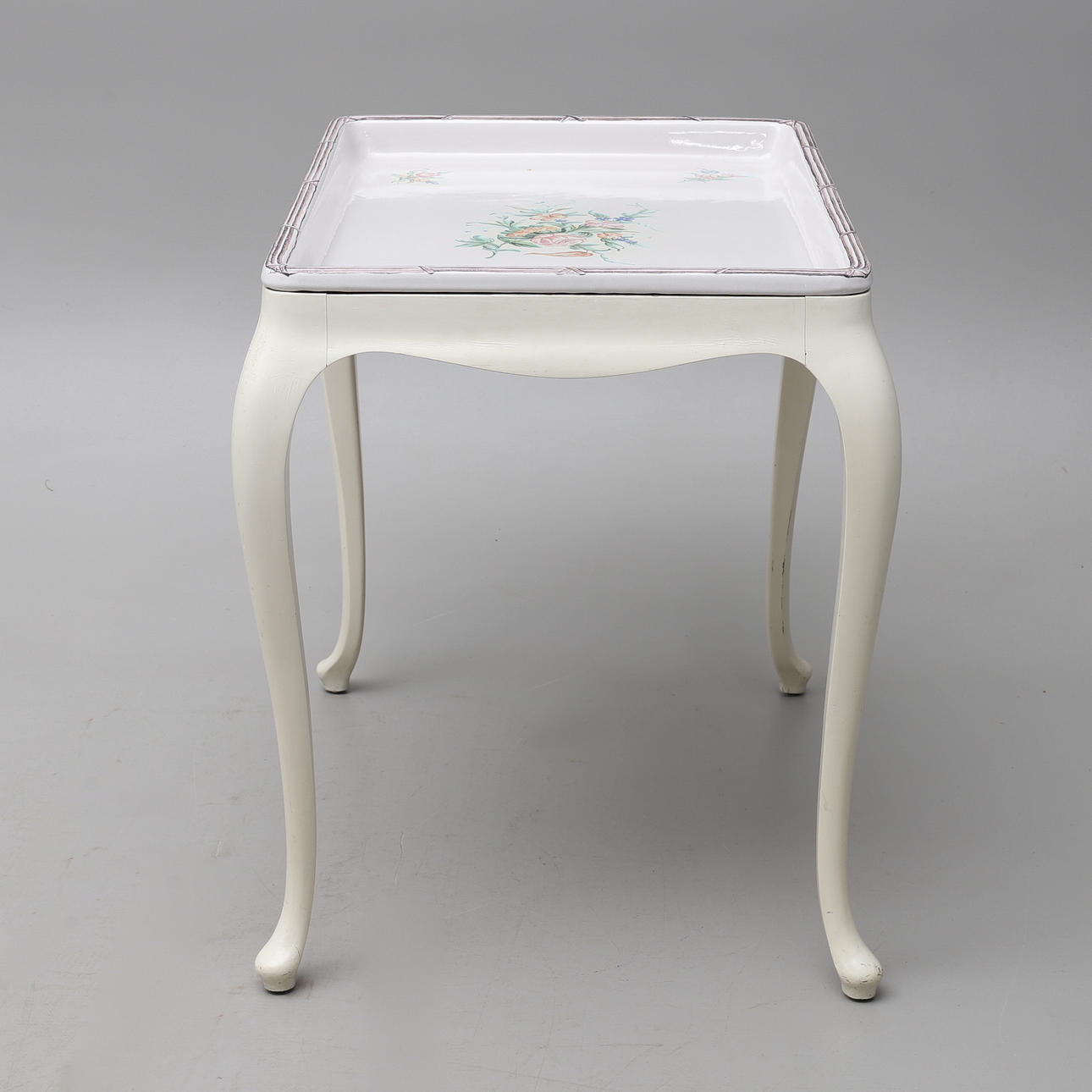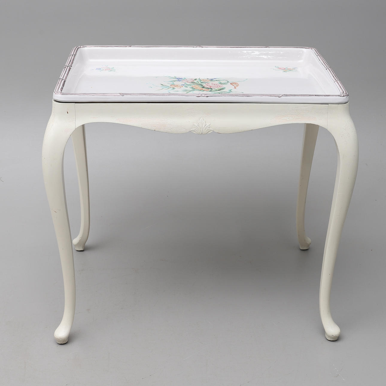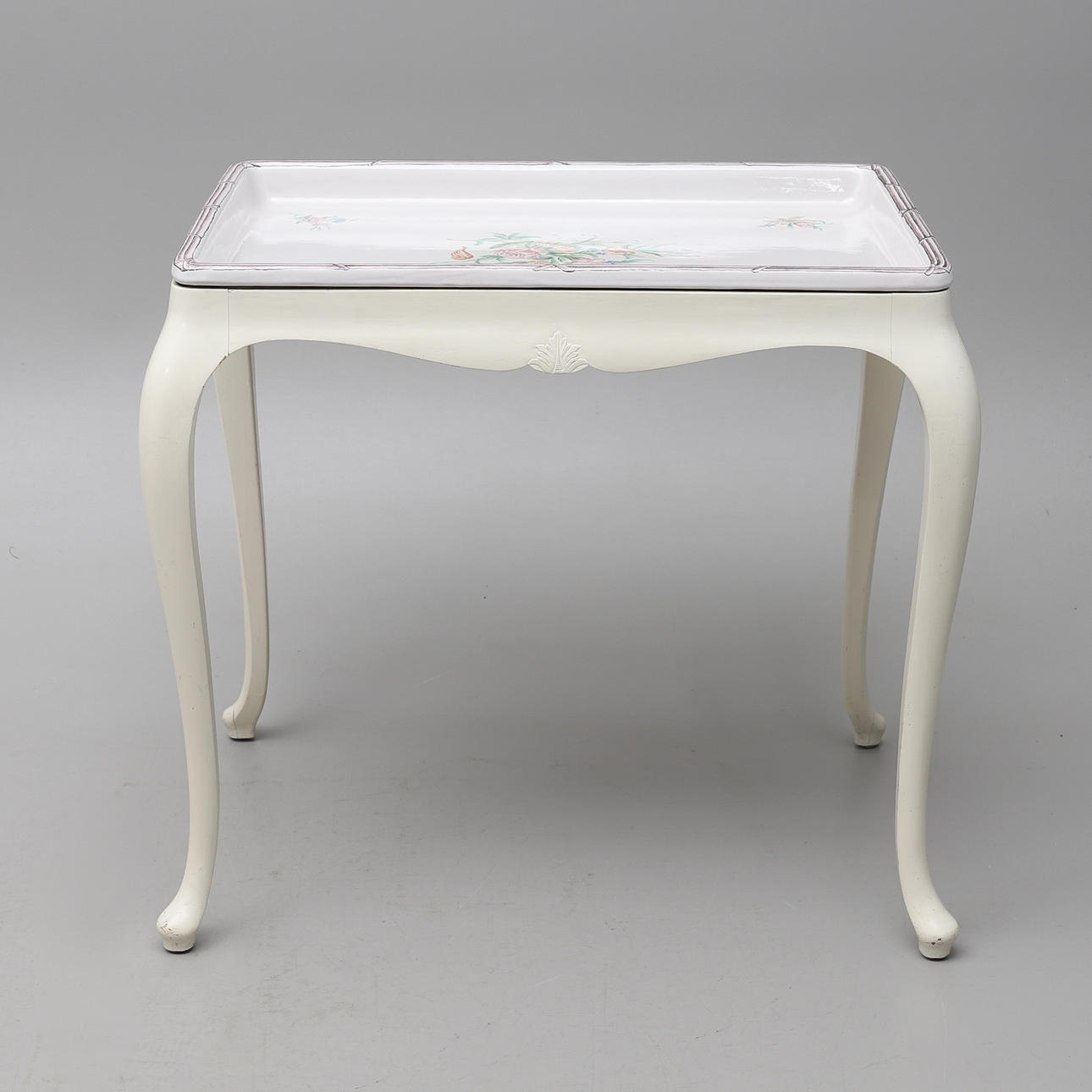 Rococo style, tray made of faience with flower painting in colors, base painted in white, height 77, 84x62 cm.