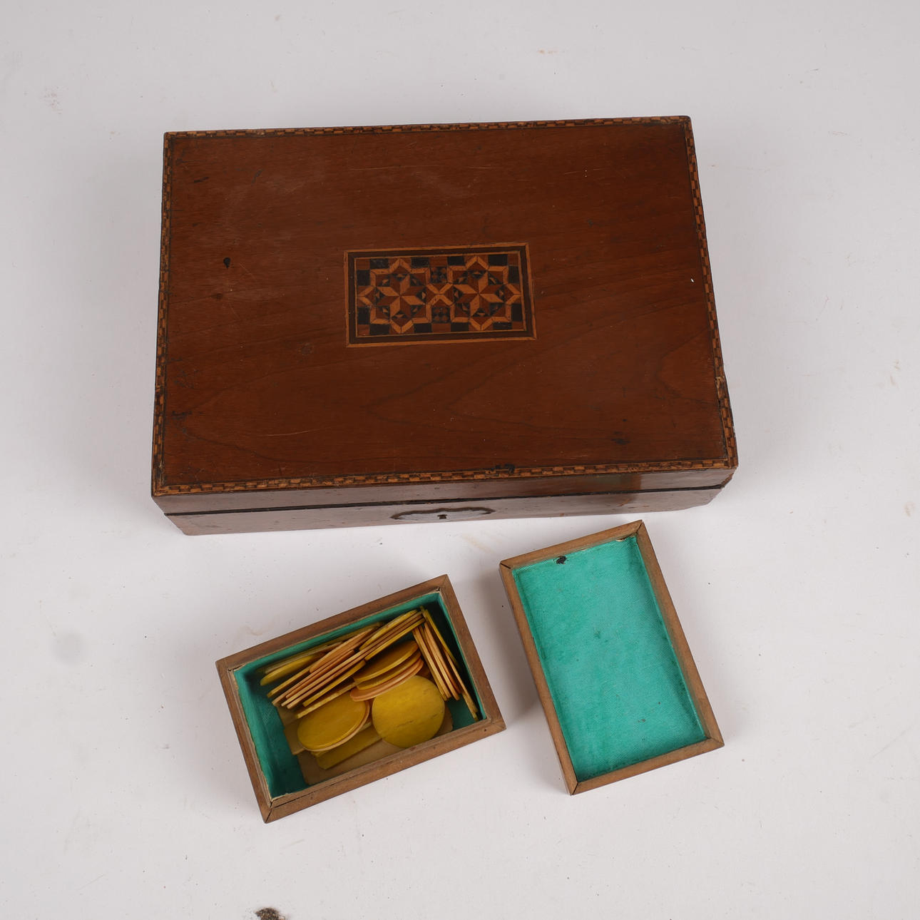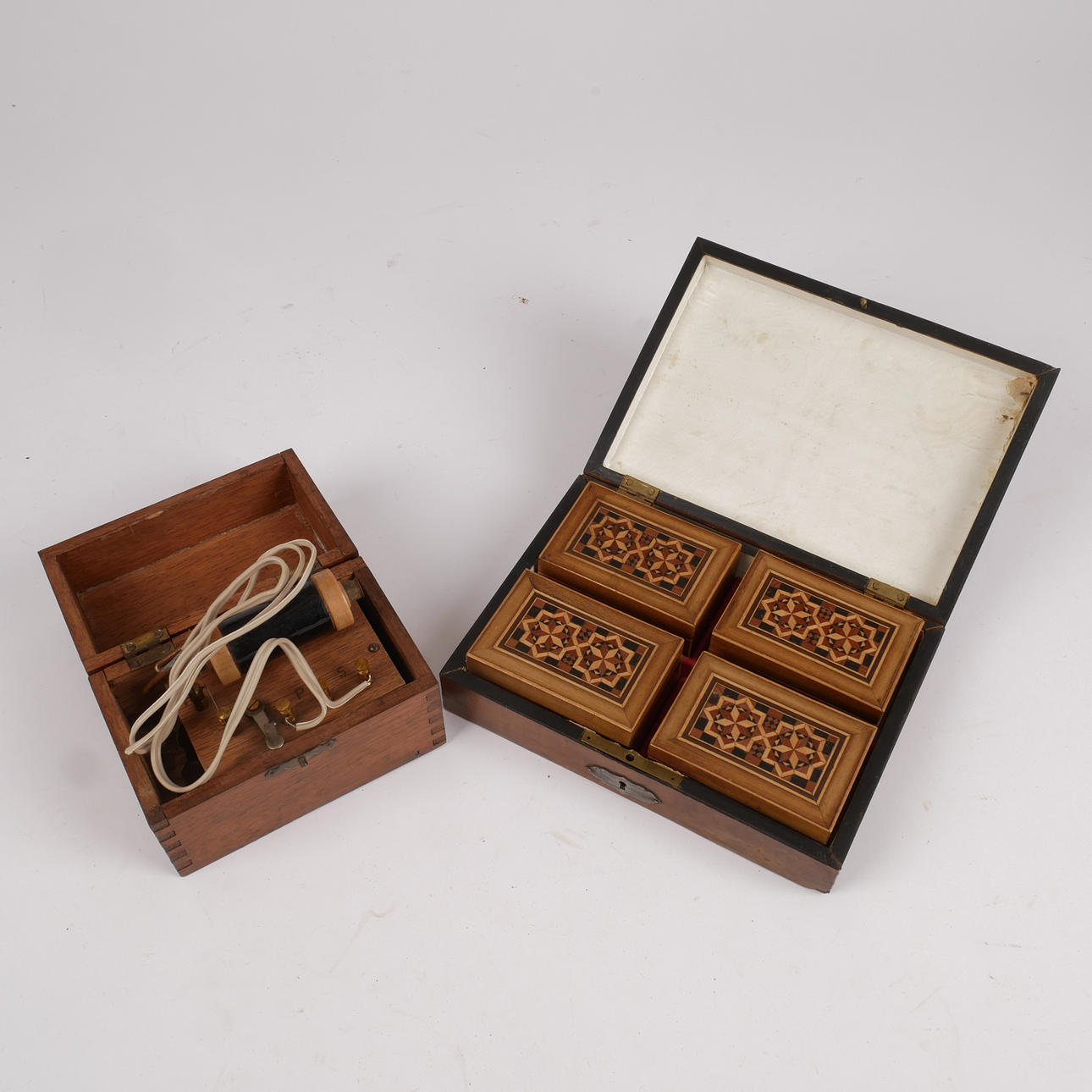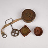 Compass in wooden case with threaded cover. Measuring tape 10 m in brass case. Games in wooden box with inlays. Dough spurs.