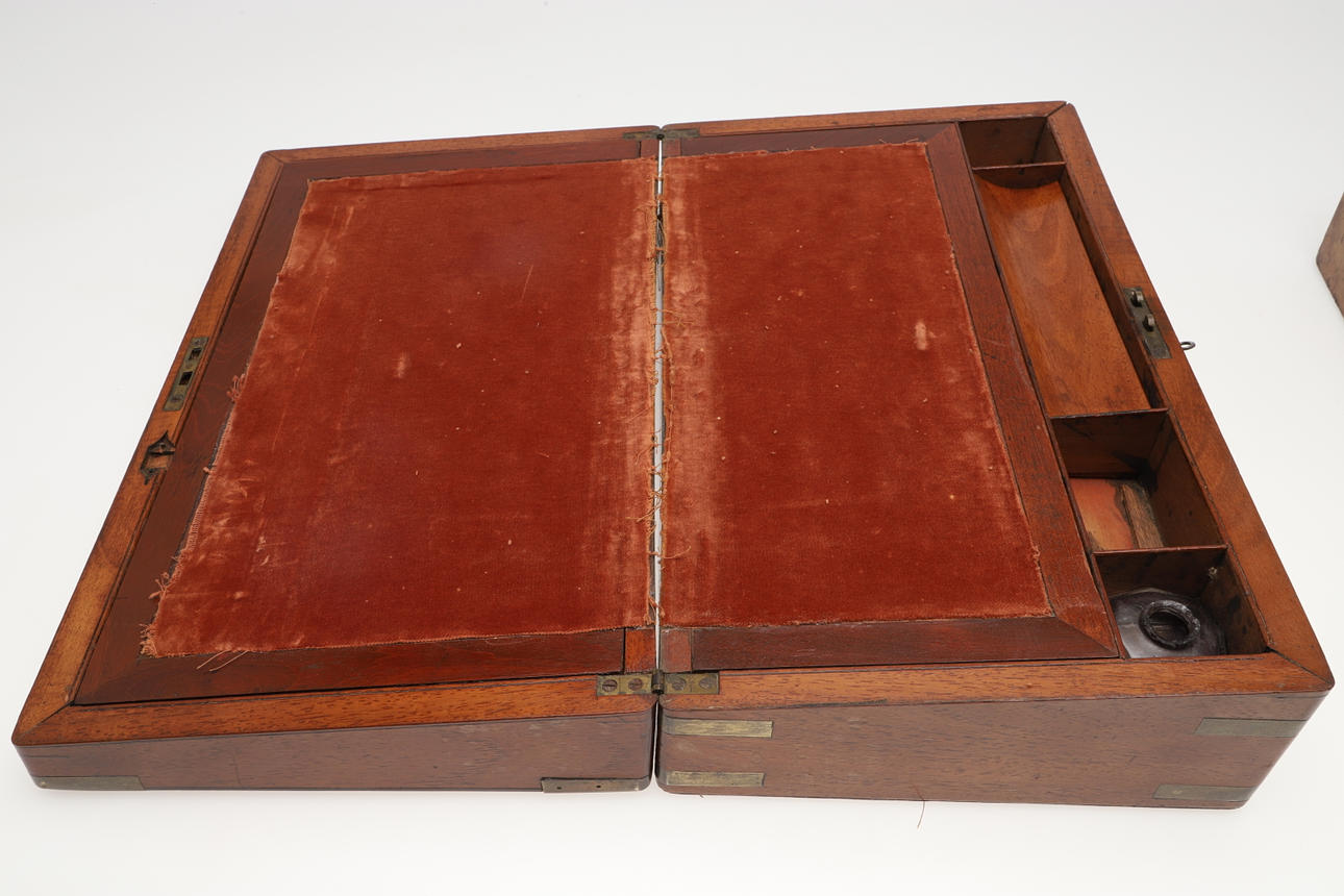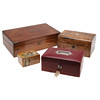 to include a brass bound mahogany lap desk, 40cm x 23.5cm, a walnut dome top work box, a decoupage box, and a Morocco covered jewellery box (4).