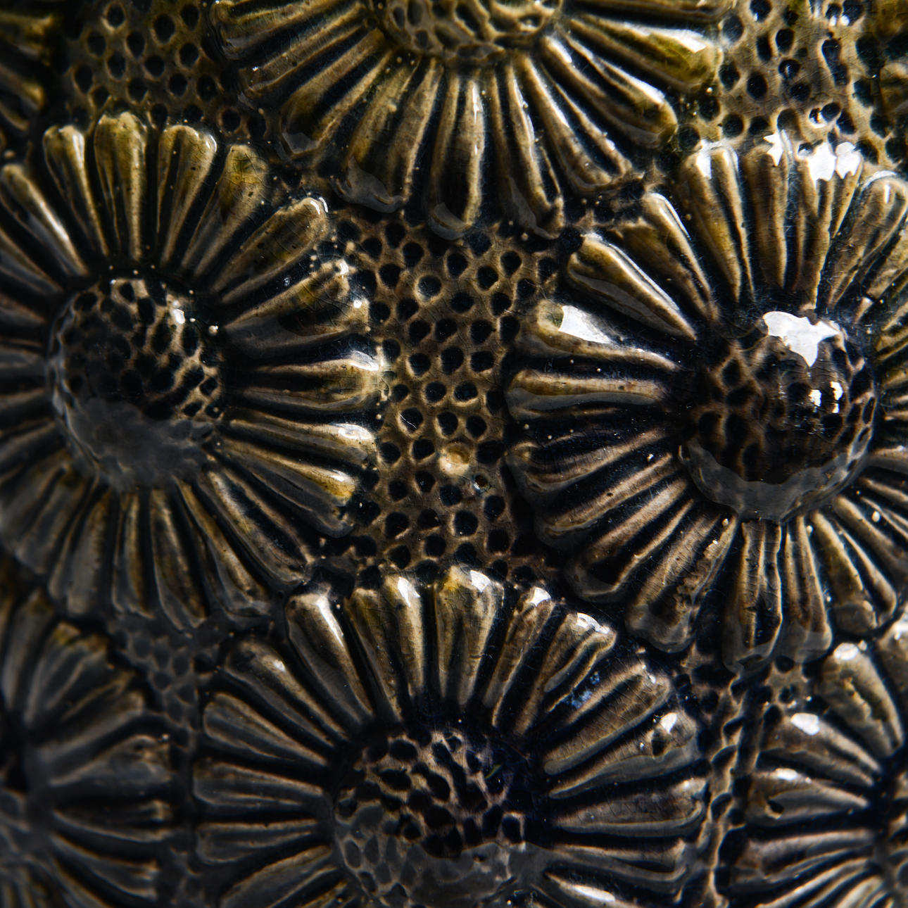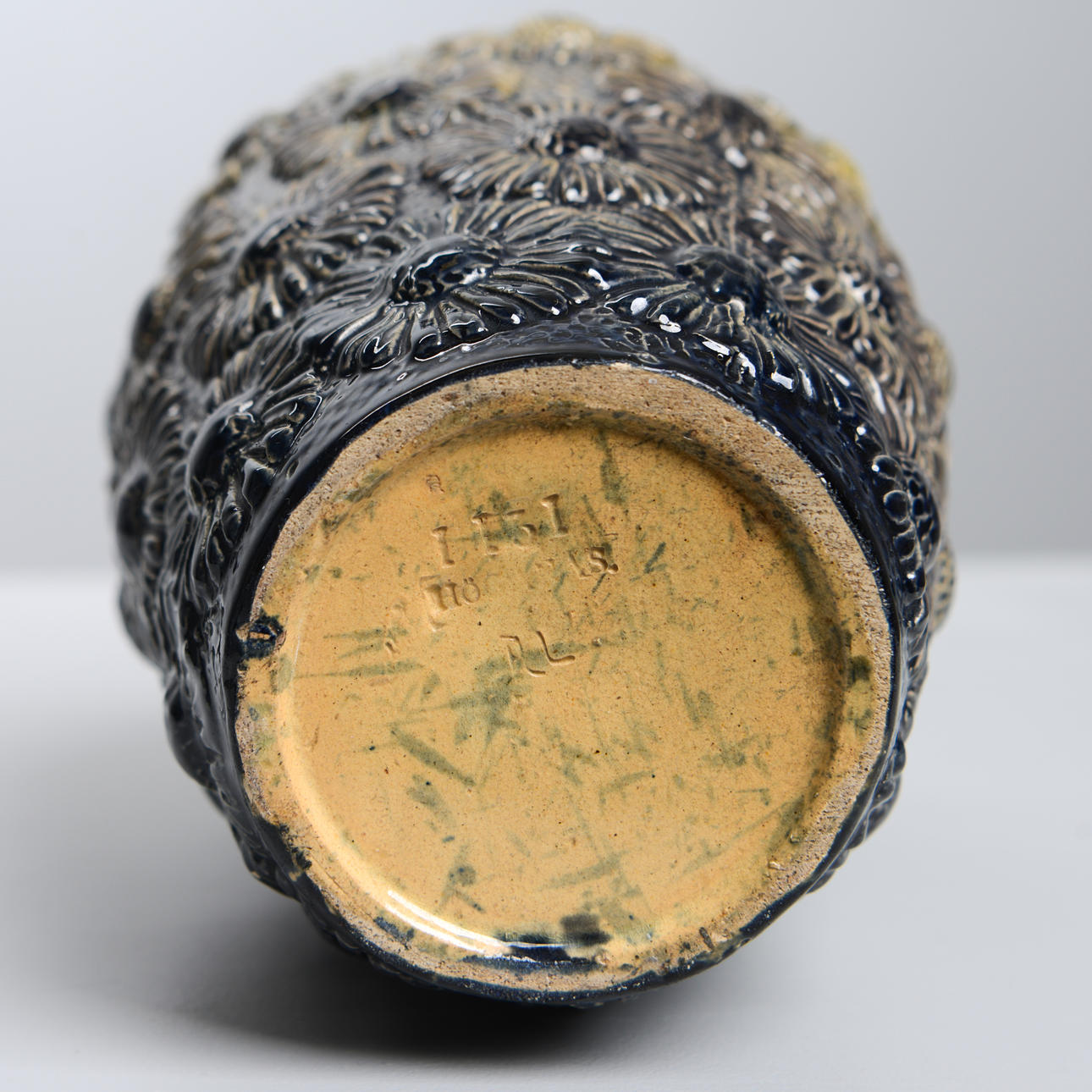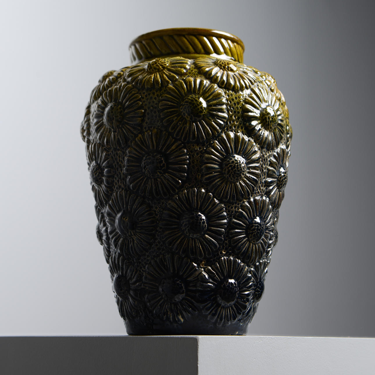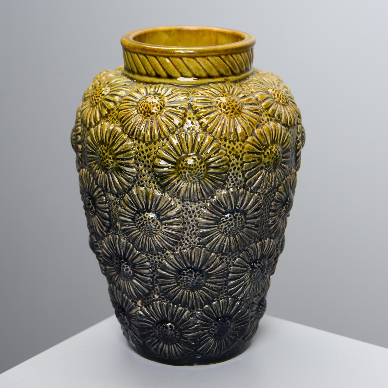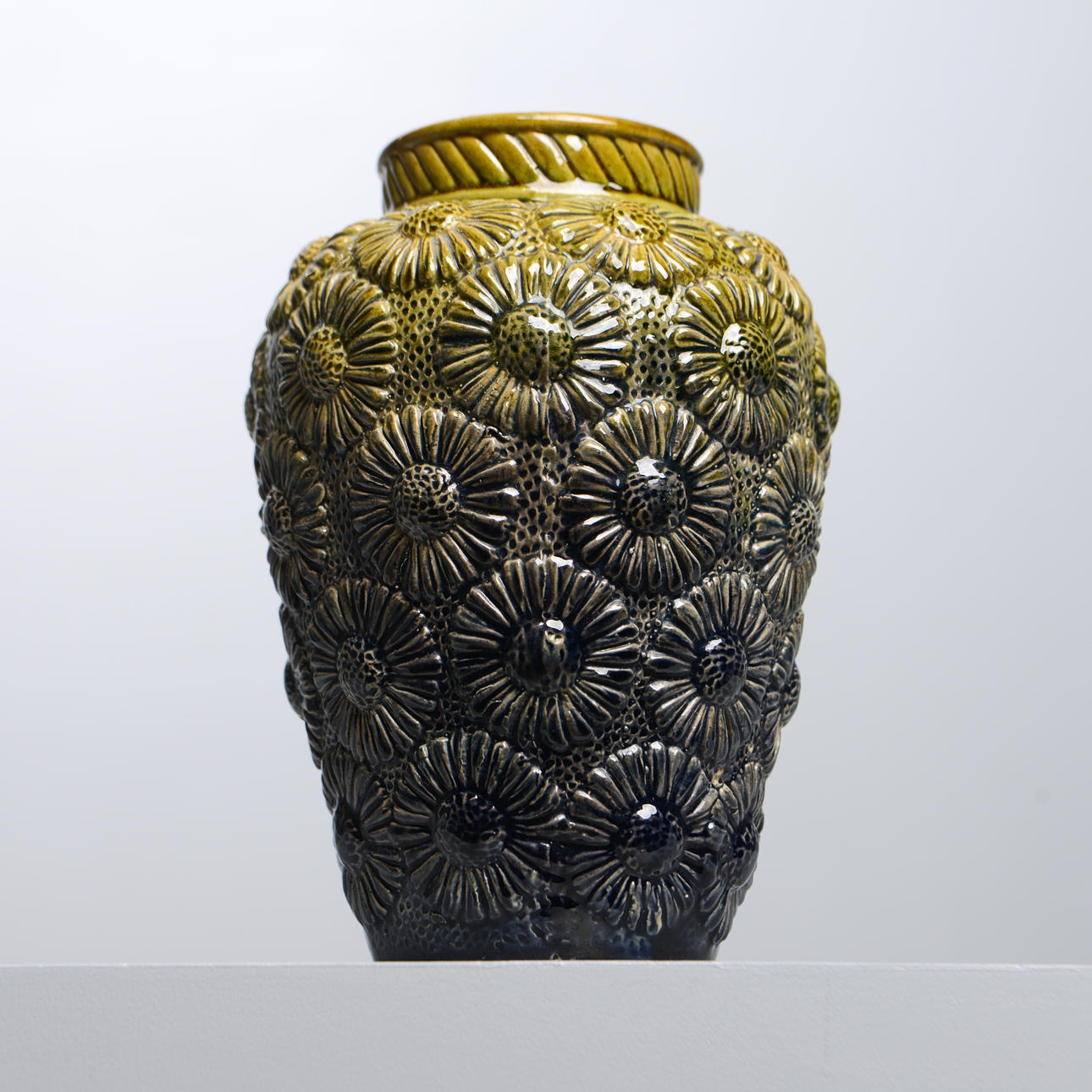 Glazed earthenware with relief decor of daisies. Model number 1131. Turner/Former Signature AL. Height approx. 22 cm.