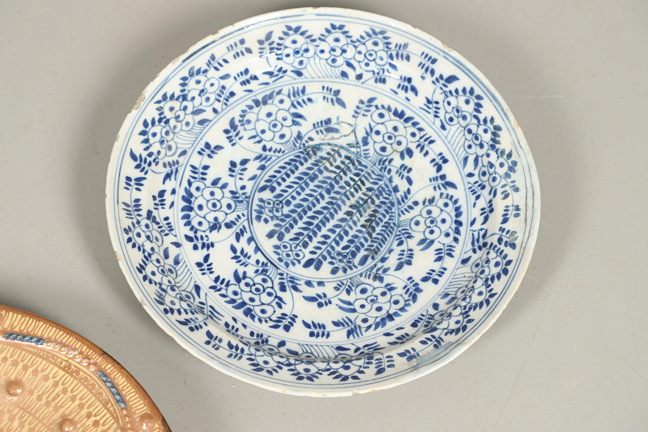 Delft dish, broken right across and restored, various chips.