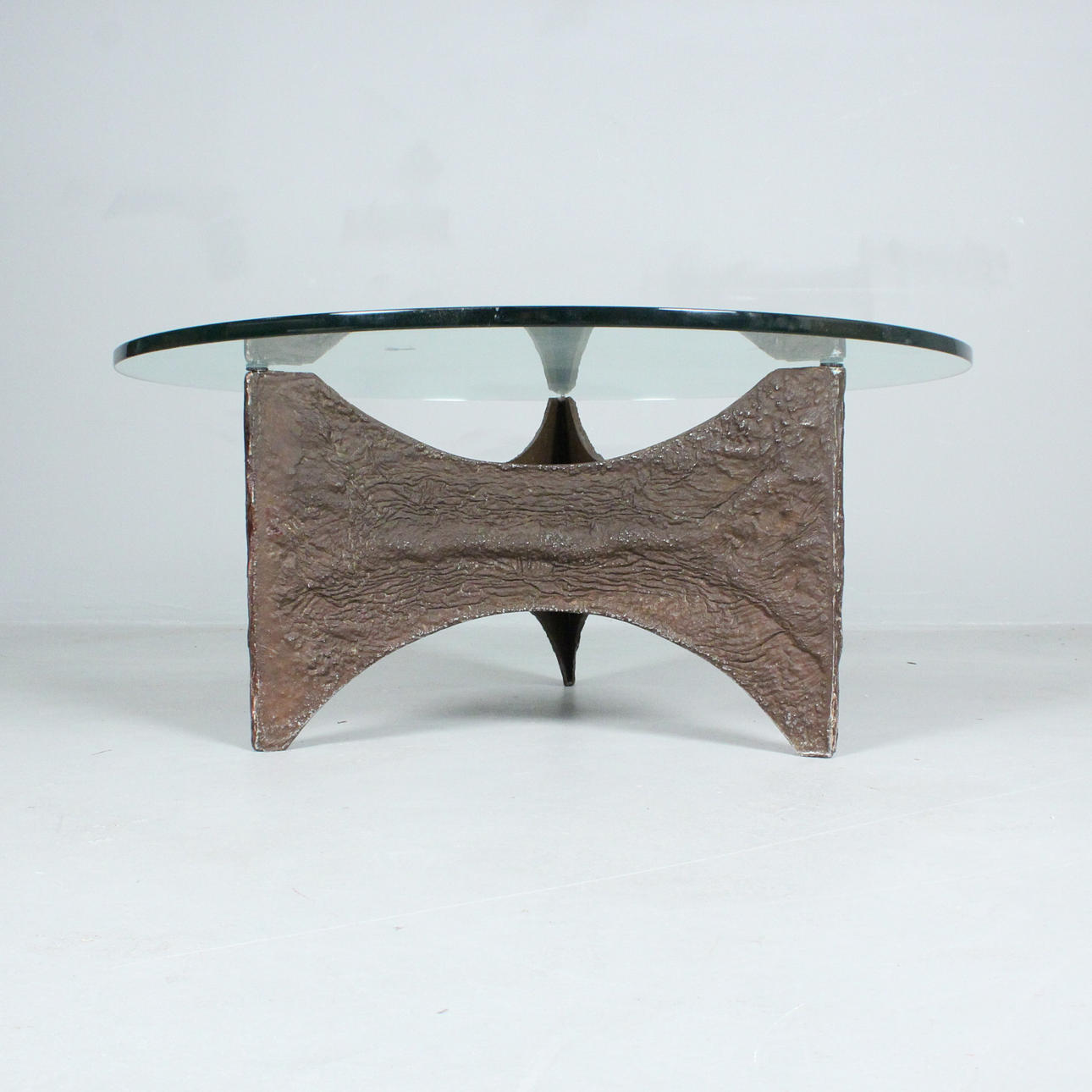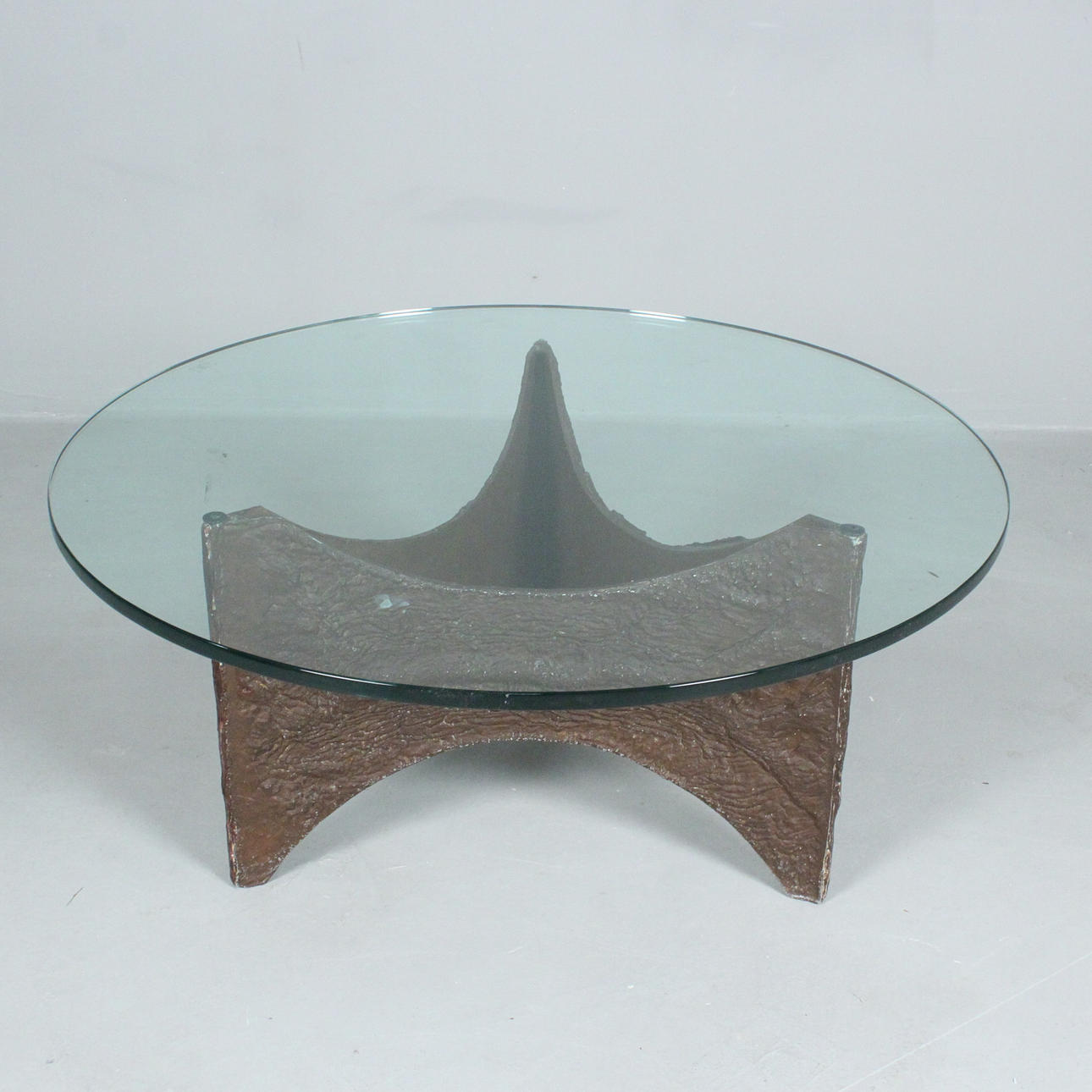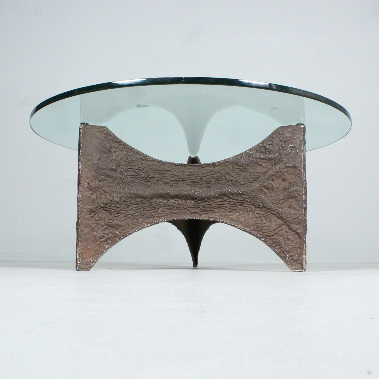 Brutalist coffee table/coffee table, 1970s, resting glass top, cast metal,