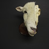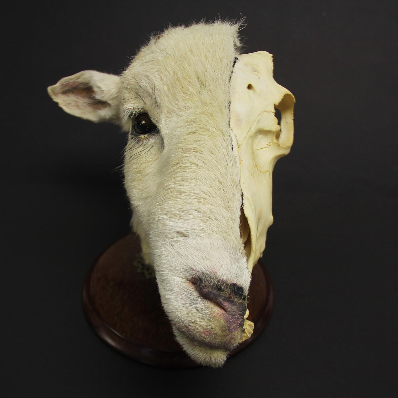 Taxidermy interest: A unique comparative anatomy sheep head comprising a complete Herdwick domestic sheep skull. Displayed with half the head prepared using the highly skilled and rarely offered process of ‘erosion casting’ by which the specimen only retains the hair and no skin, set with glass eye, H. 21cm. Set on post with hand turned wood base.