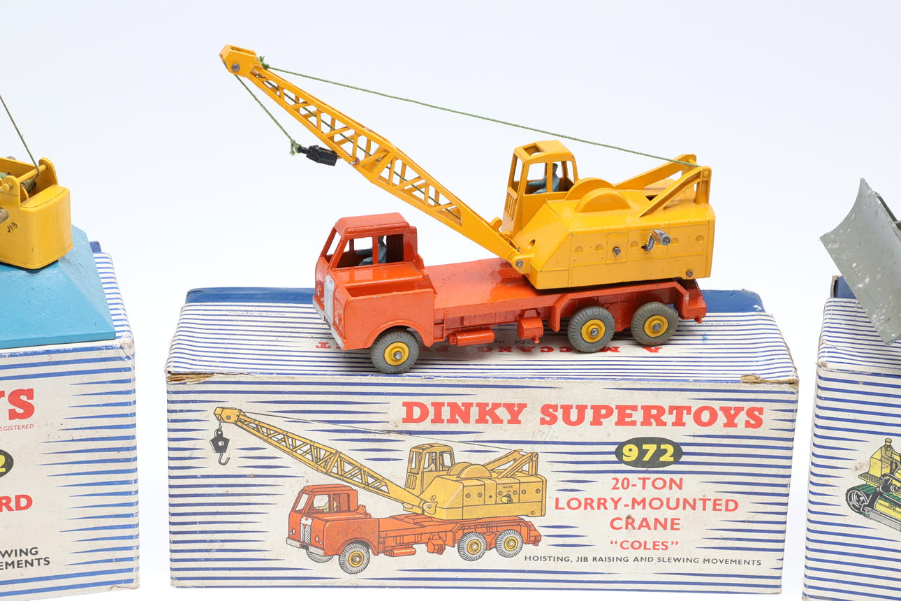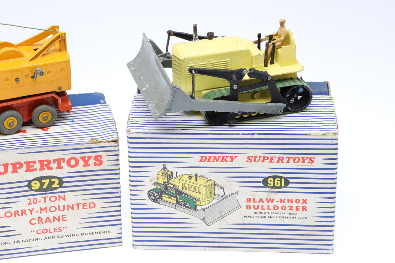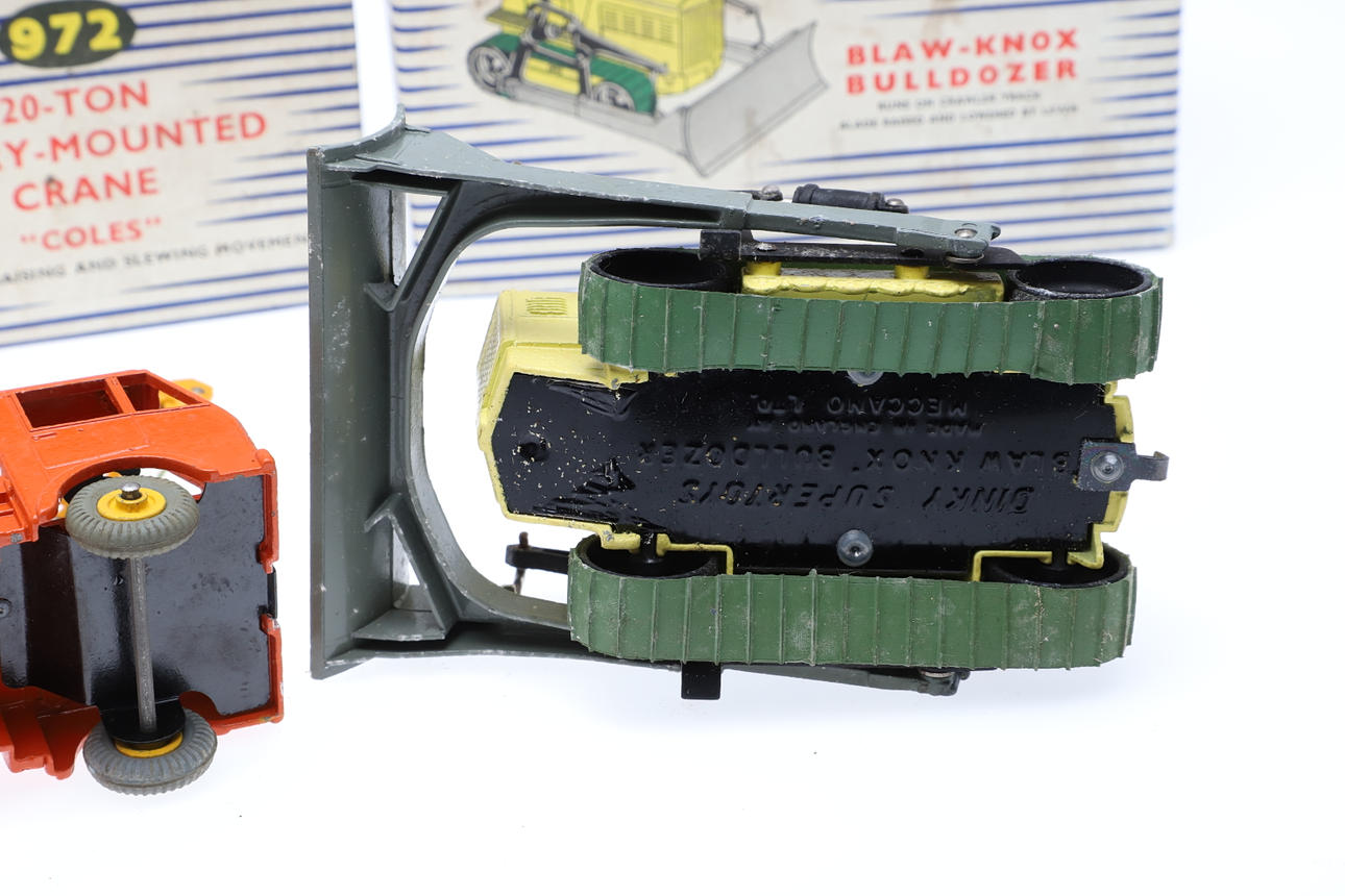 Three boxed die cast toys including 972 Lorry Mounted Crane (yellow and orange), 961 Blaw Knox Bulldozer, and 752 Goods Yard Crane. (3).