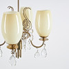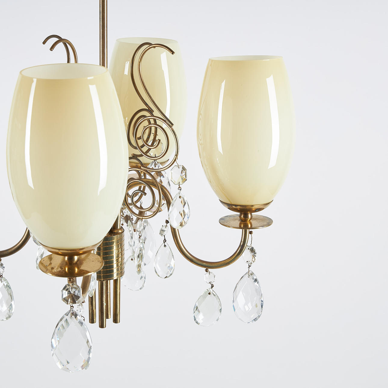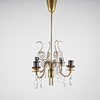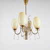Brass frame, four light points, cups in yellow-brown tinted opal glass and crystals. height 73 cm, width 51 cm.