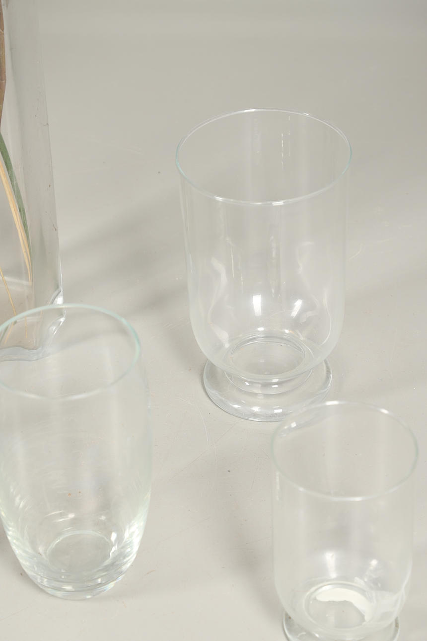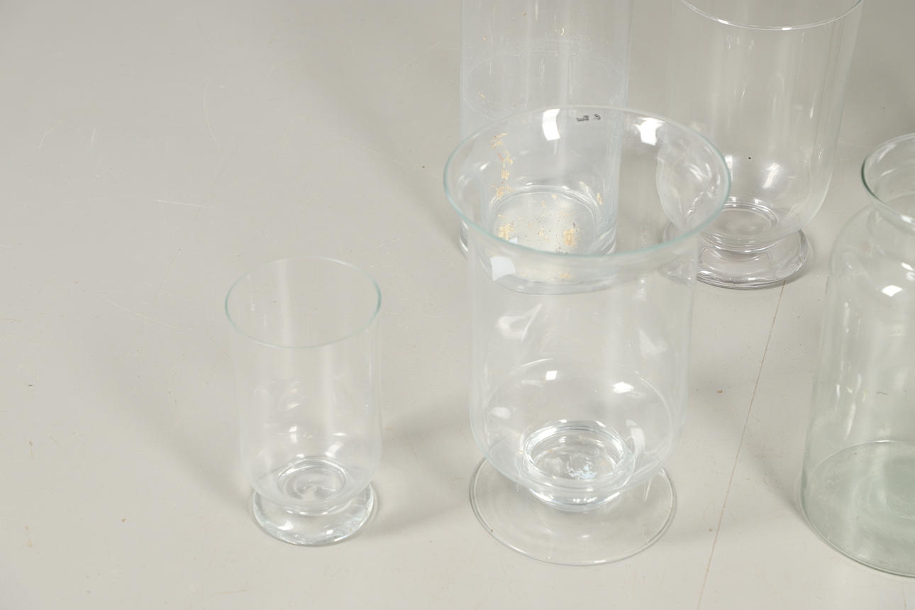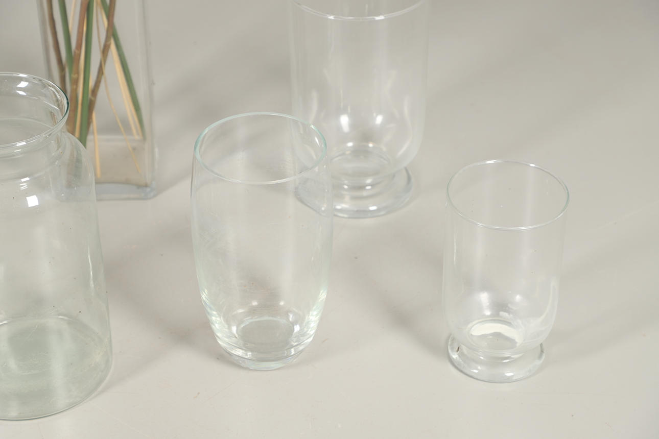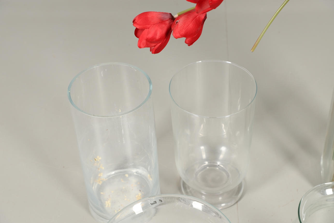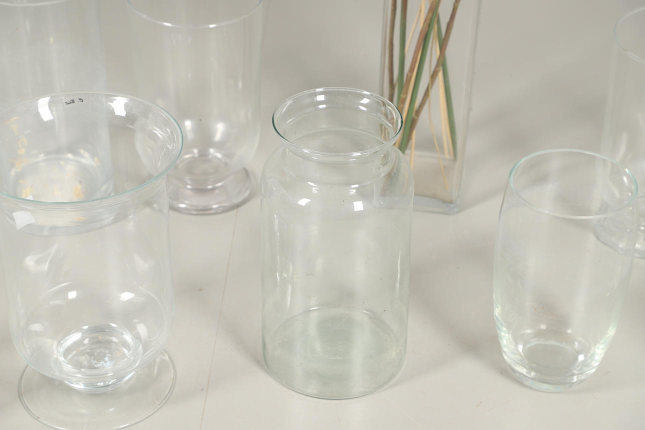 A variety of large glass vases for floral displays, including a large slender vase containing simulated flowers (50cms high). (9).