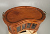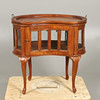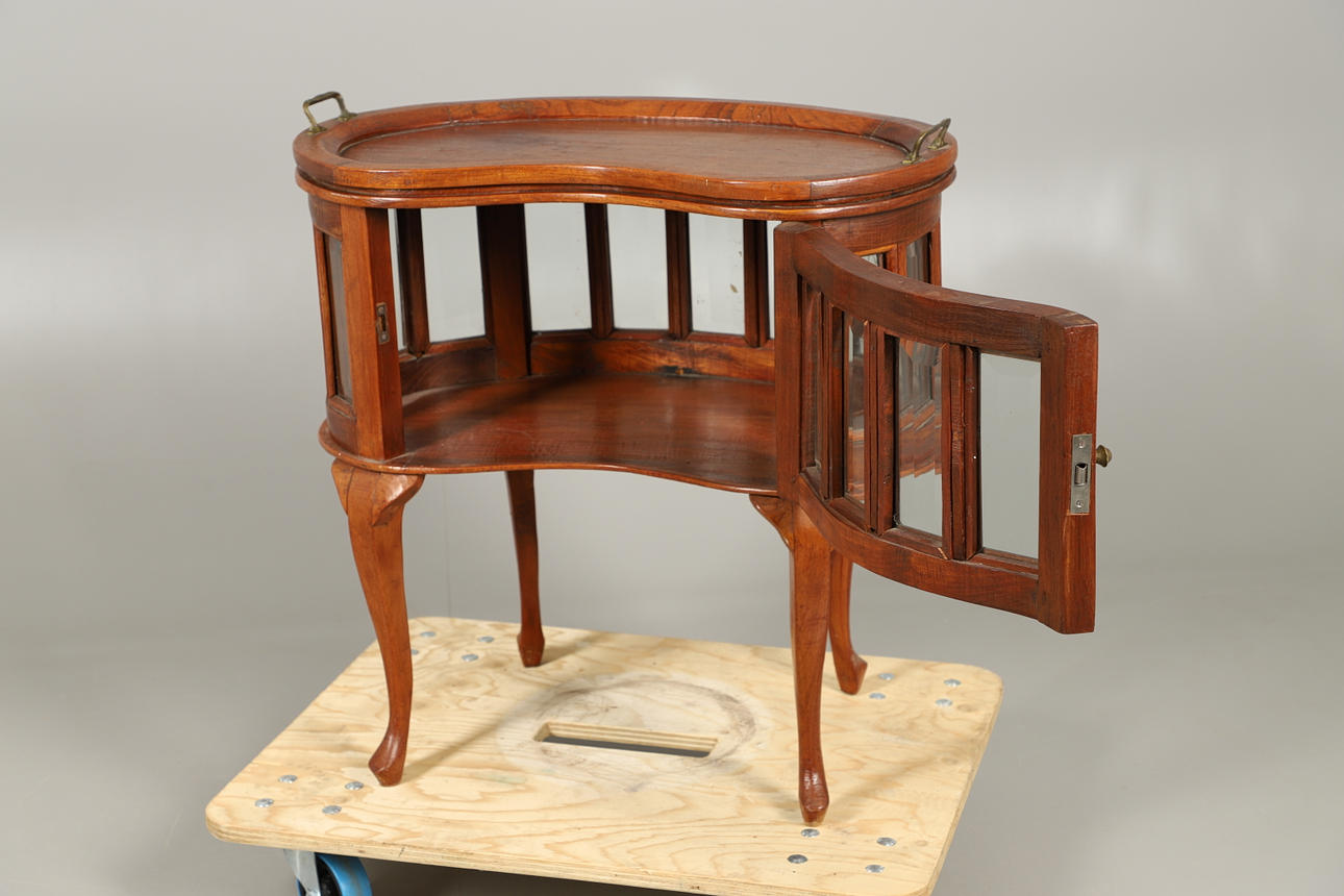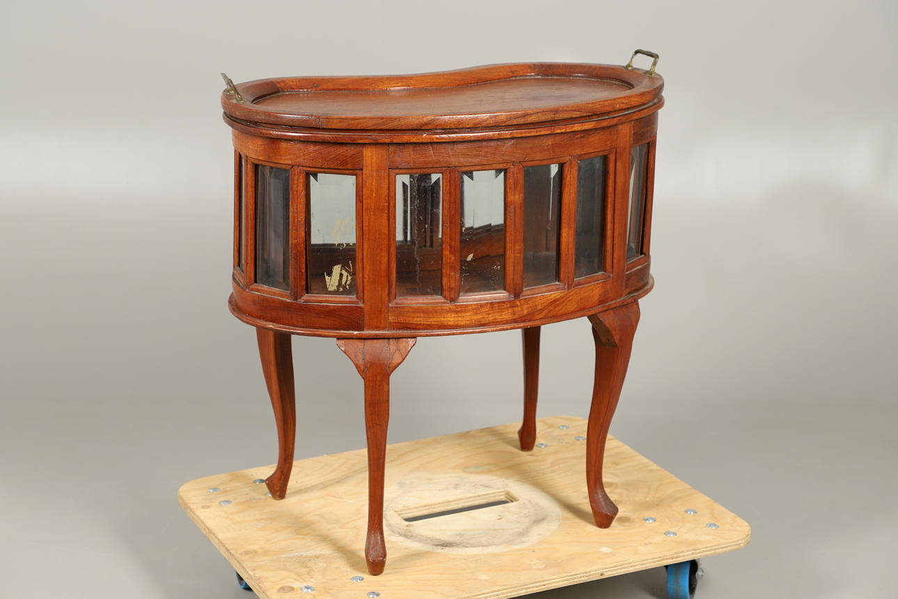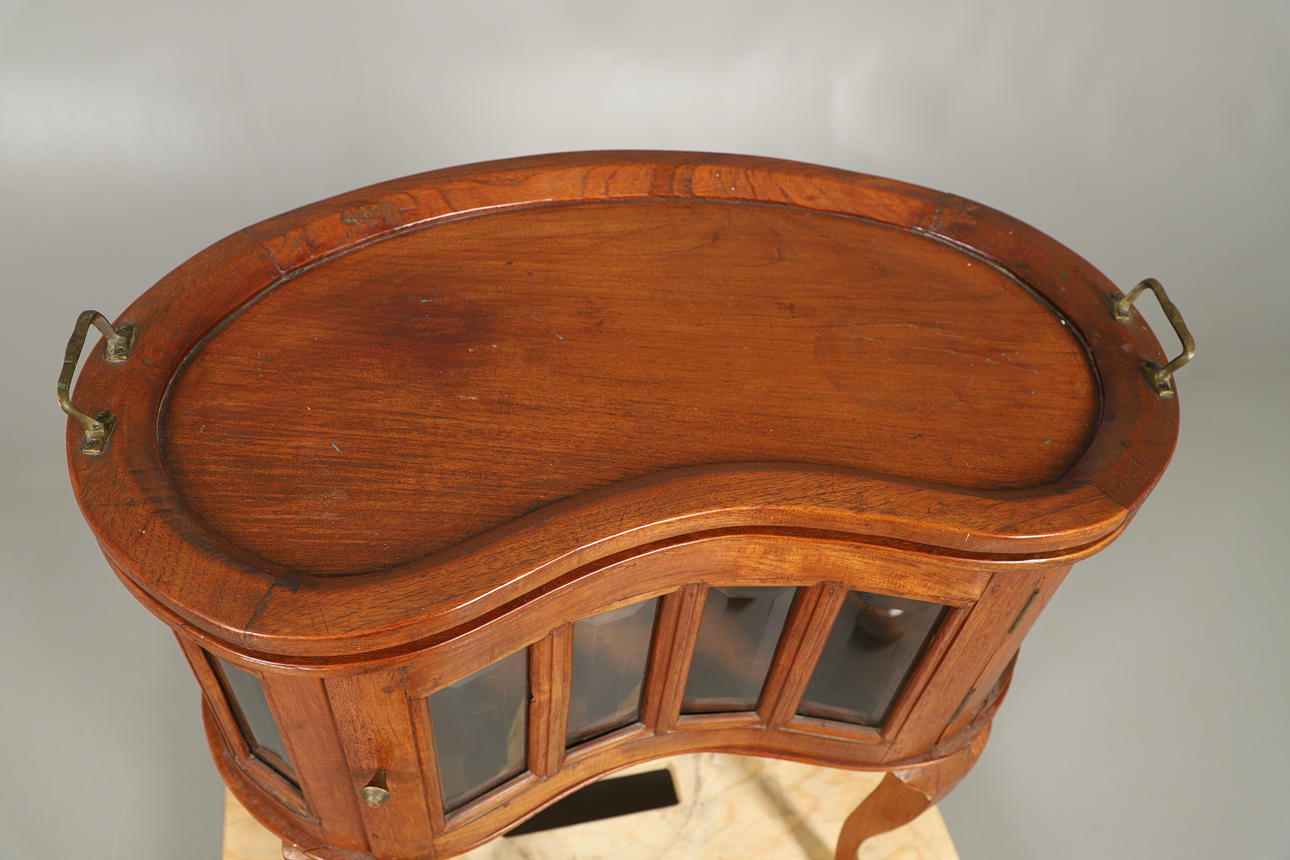 Wooden construction, with single door and bevelled edge glass panels all around the main body. Removable metal handled tray on the top, all supported by four cabriole legs. Height 74cm x Length 72cm x Depth 37cm.