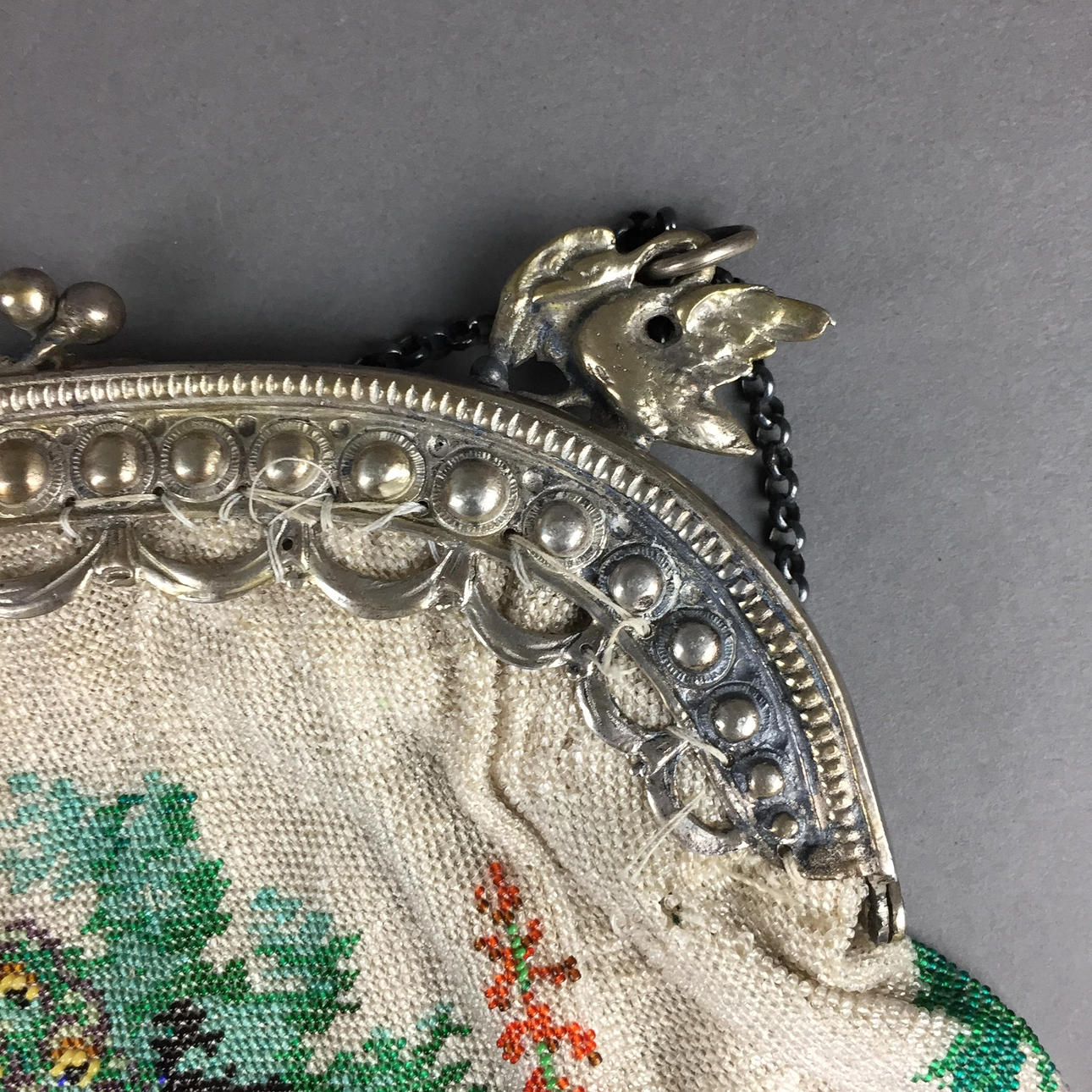 severe signs of age and use, small pearl bag with severe damage included.