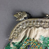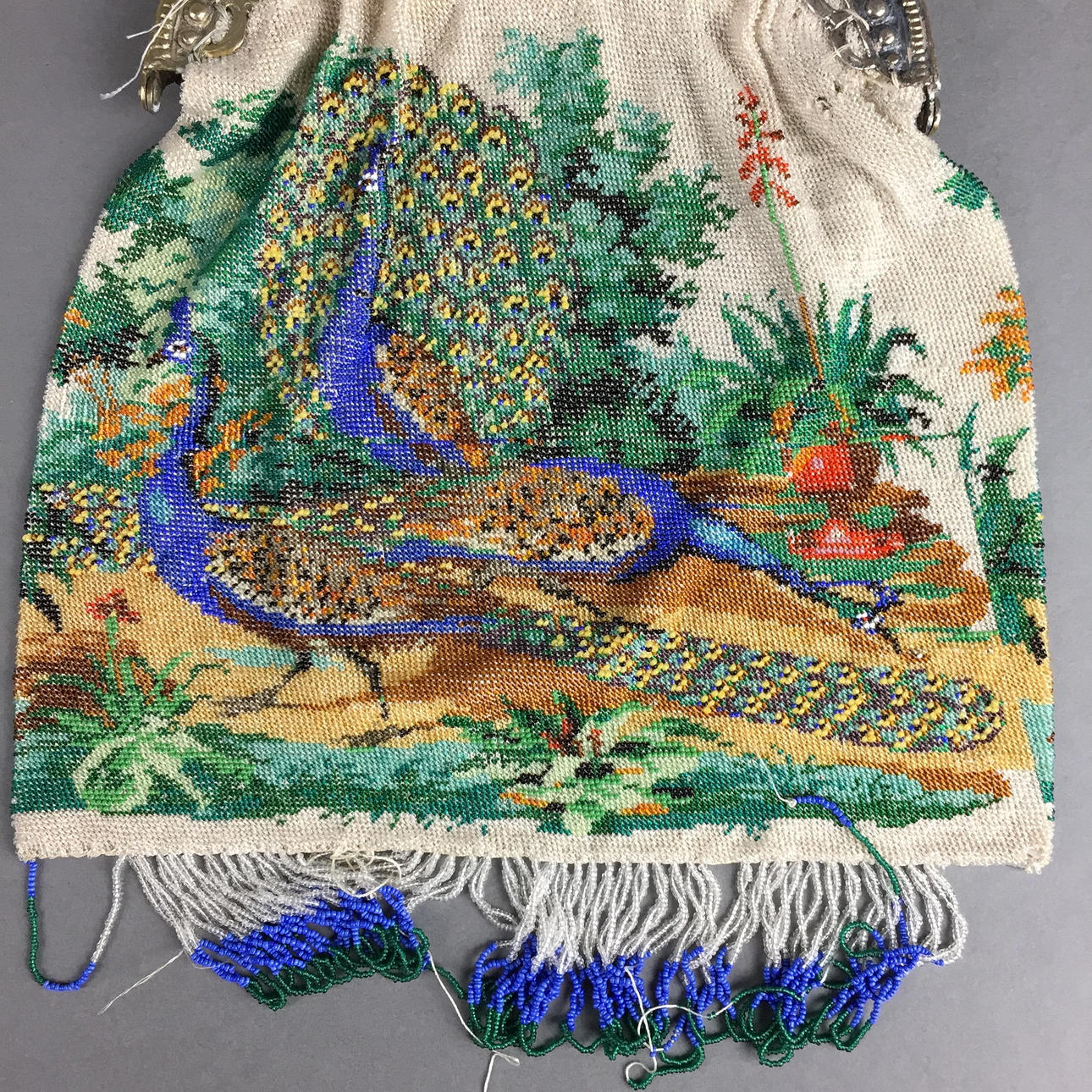 Pearl bag - with silver-plated snap fastener, embroidered on both sides with peacock, on the clasp 2 small, fully plastic swans as a chain holder, with hanging pearls as a finish (incomplete).