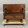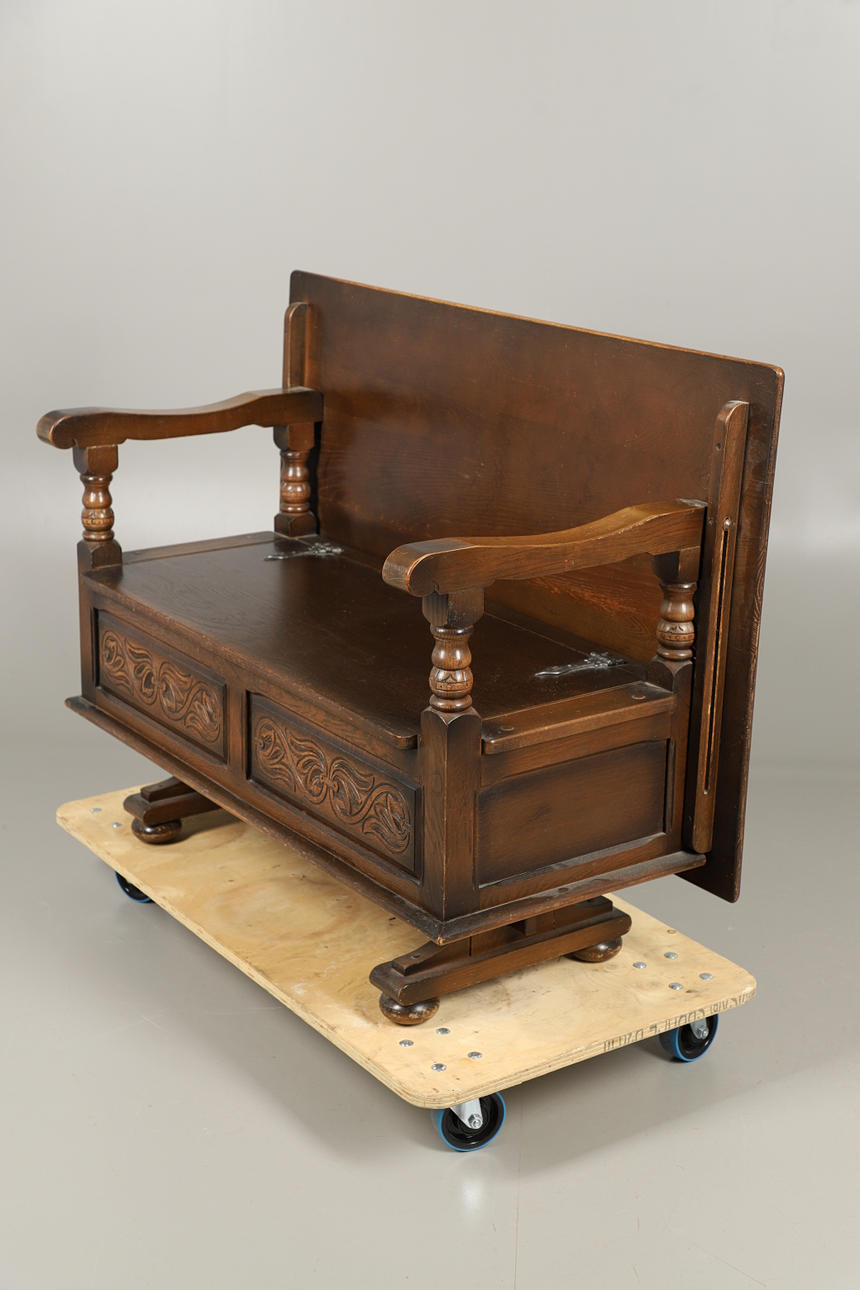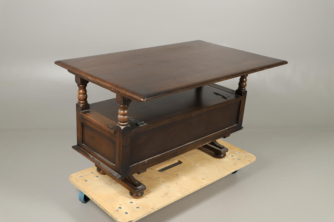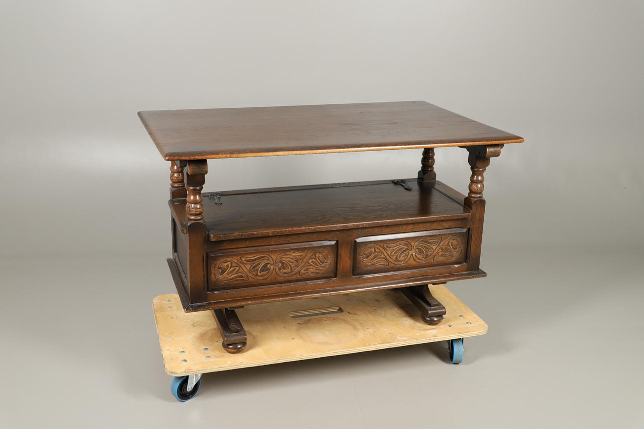 the large rectangular top converting to a table, over interior storage and twin carved panels, 90cm high x 122cm wide x 53cm deep.