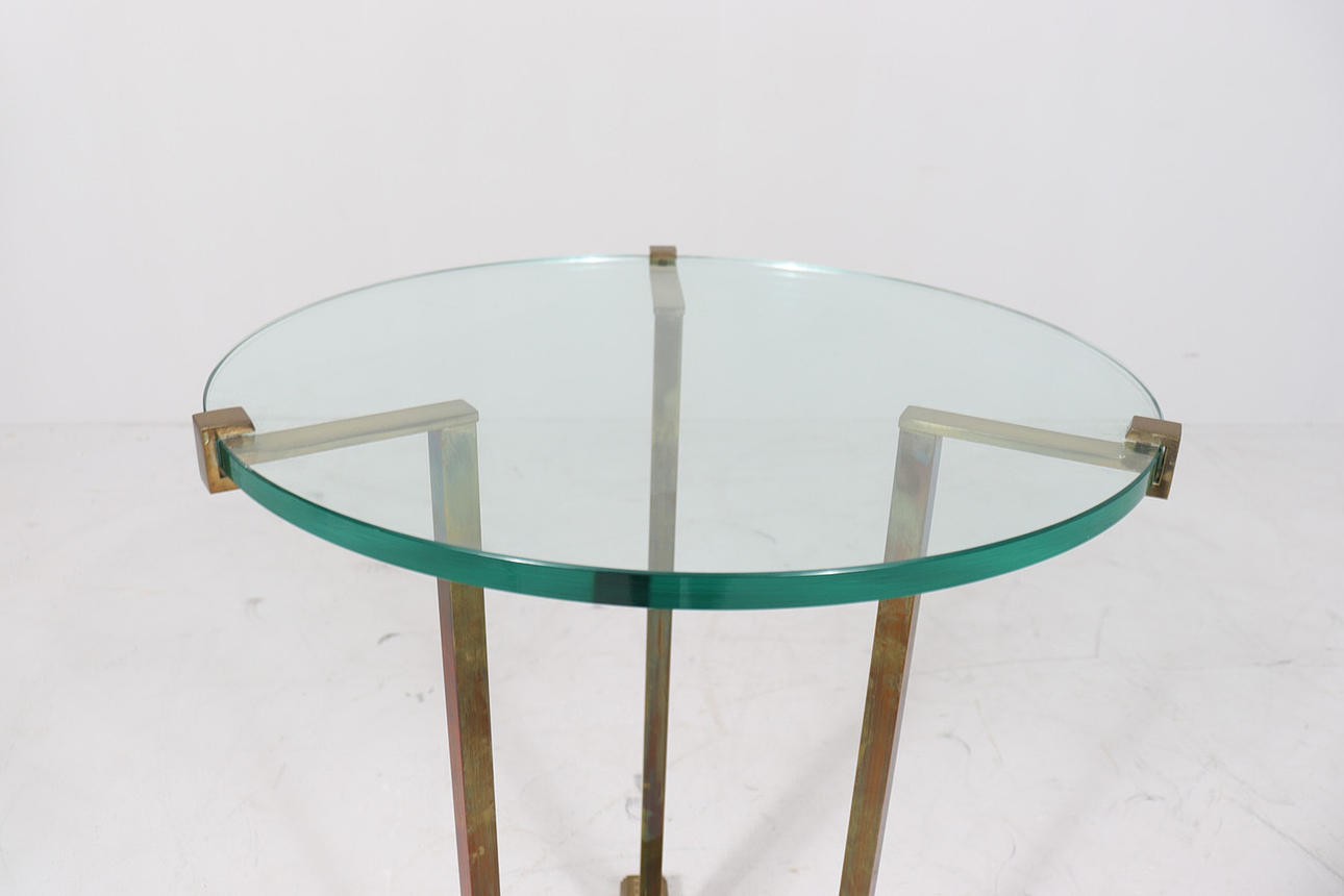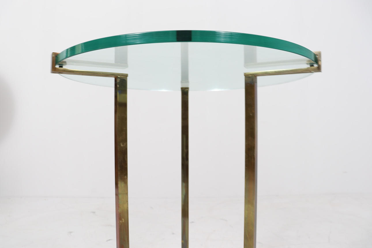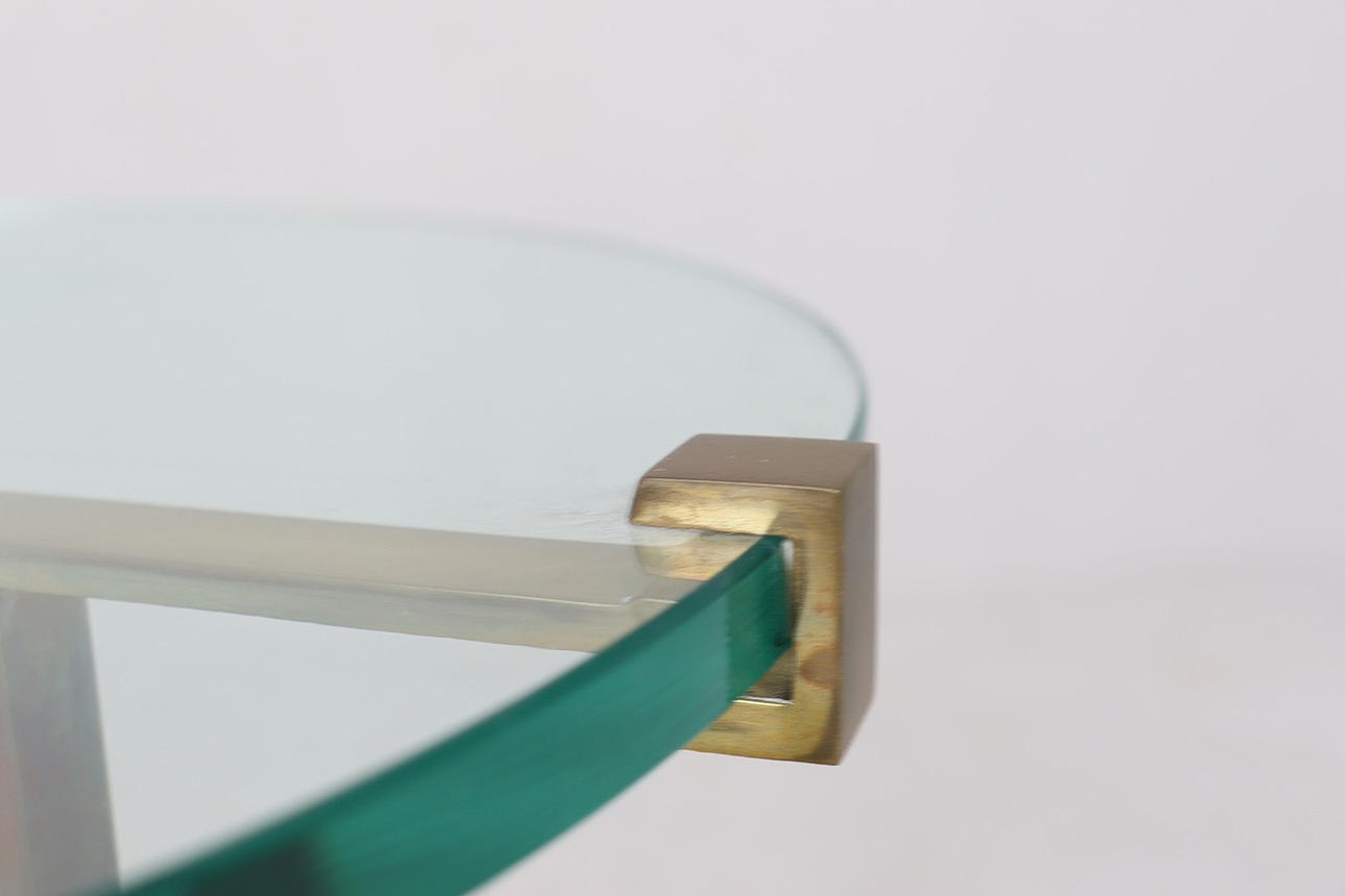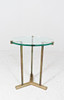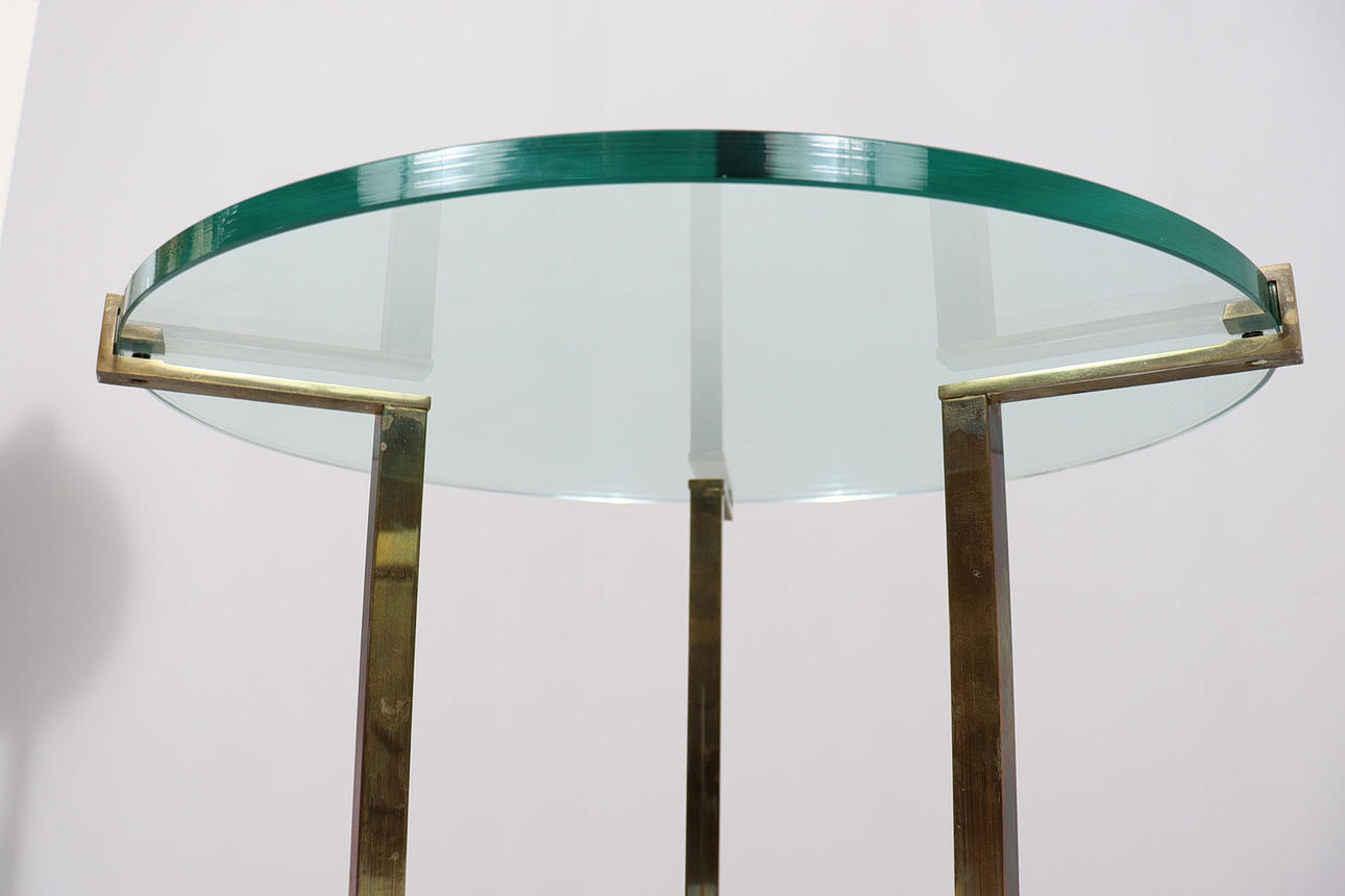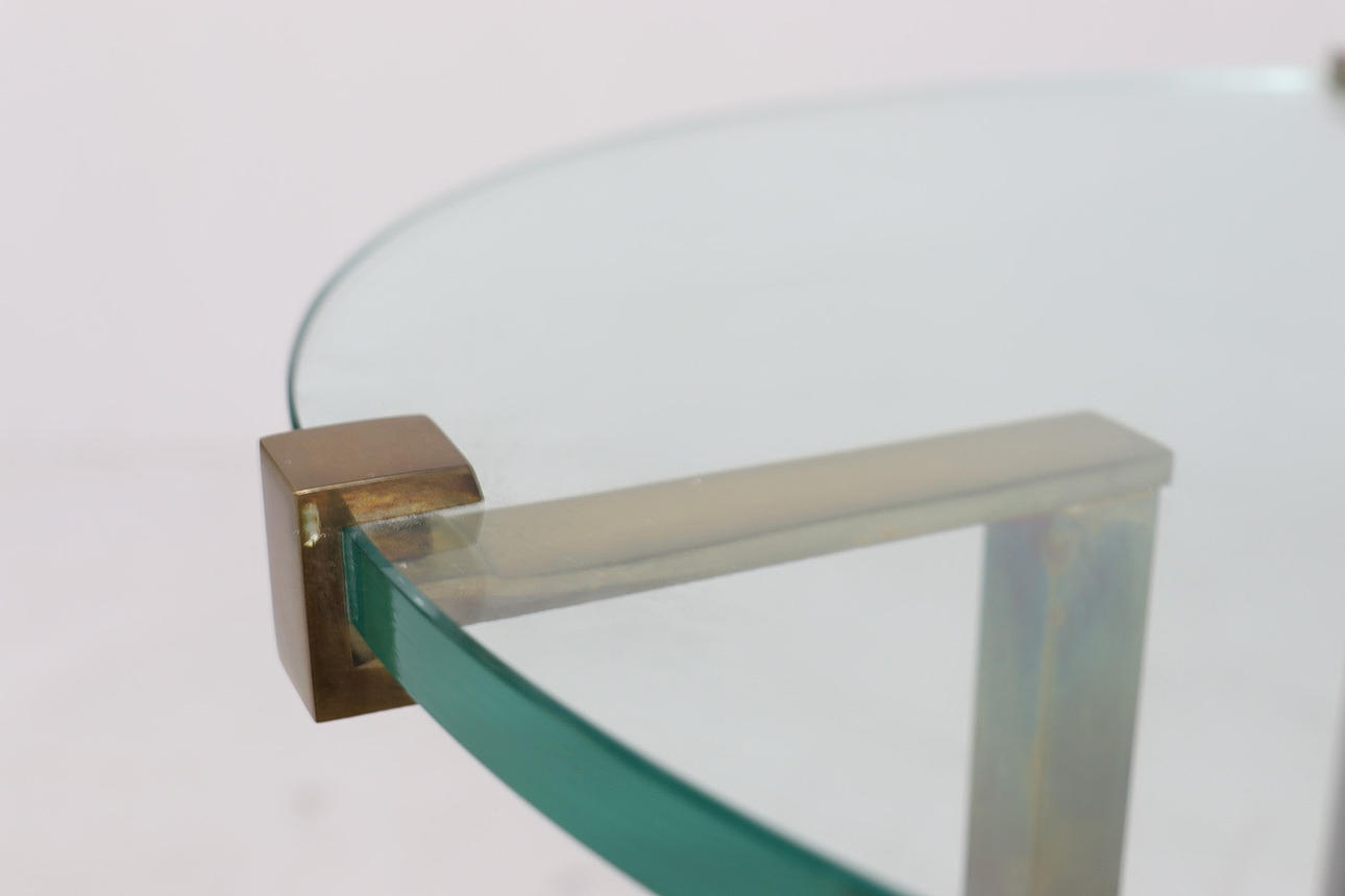 Coffee table/side table by Peter Ghyczy, model: T37, 1970s, brass construction, with a round glass top with Ghyczy monogram,