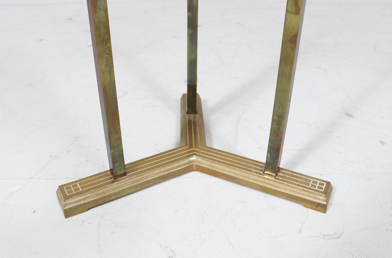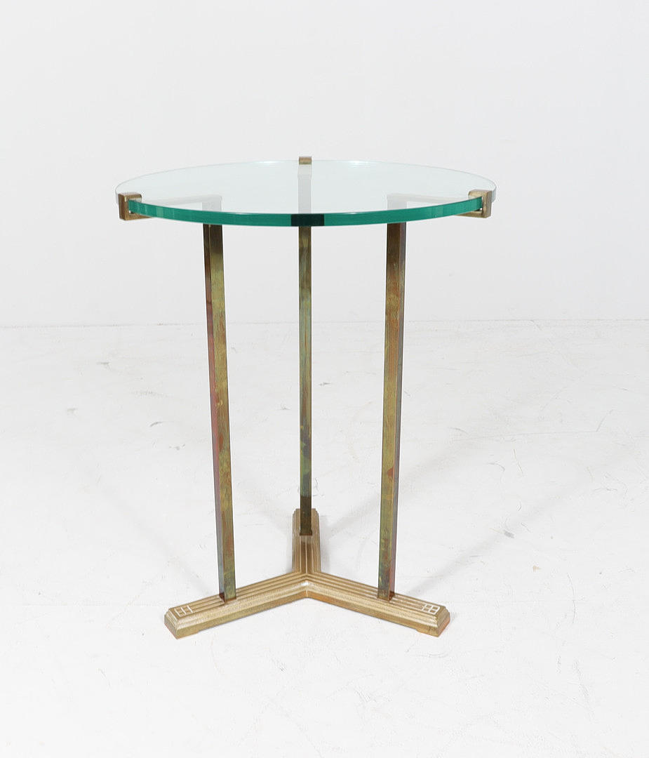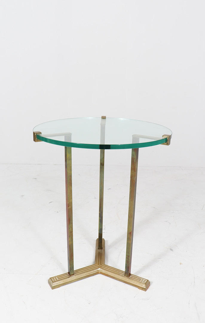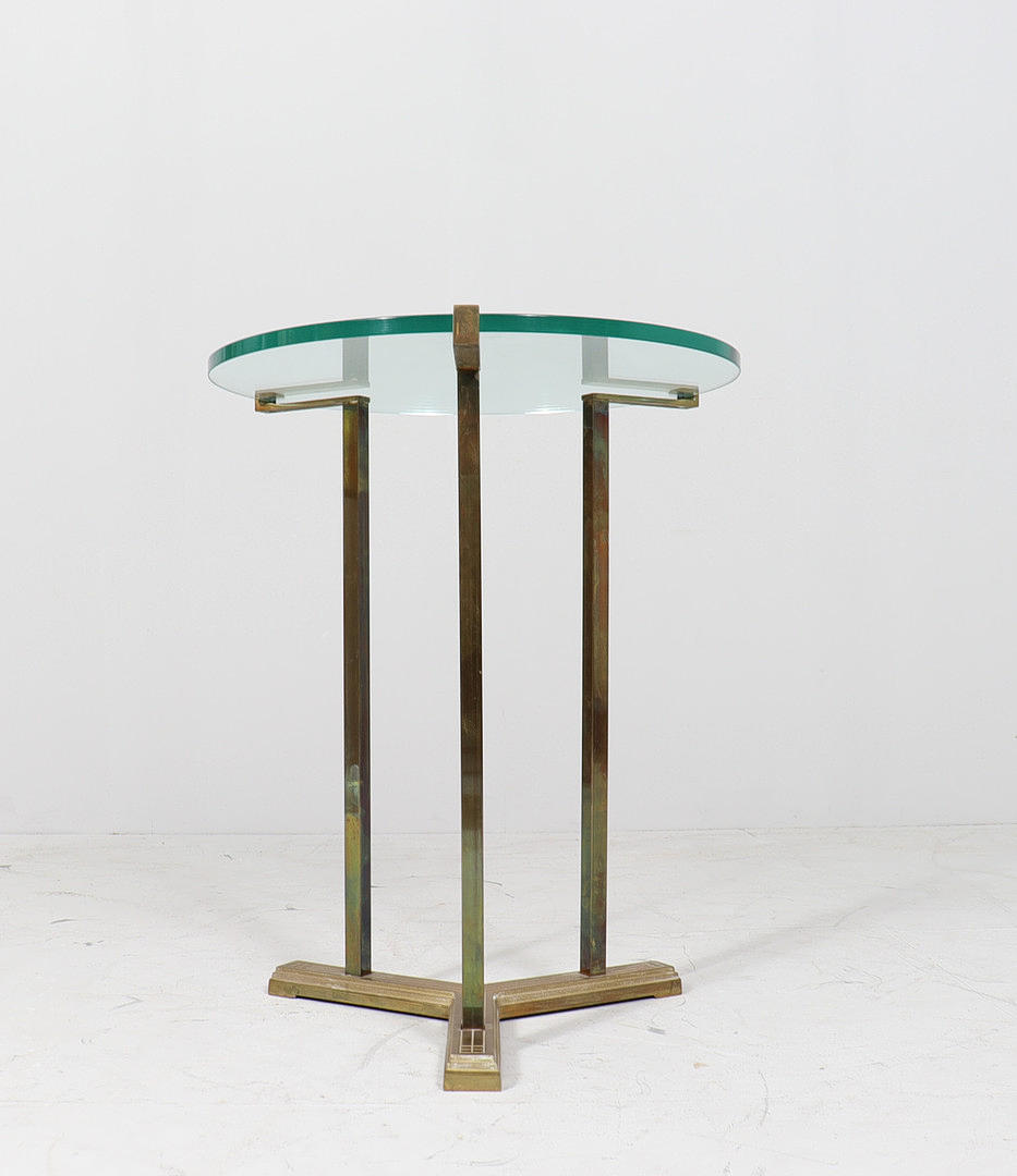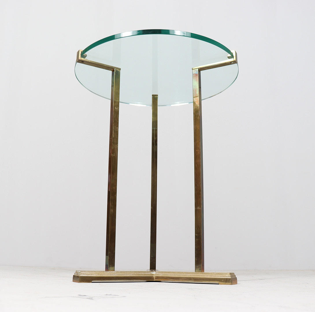 Coffee table/side table by Peter Ghyczy, model: T37, 1970s, brass construction, with a round glass top with Ghyczy monogram,