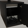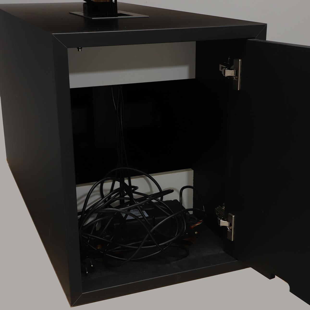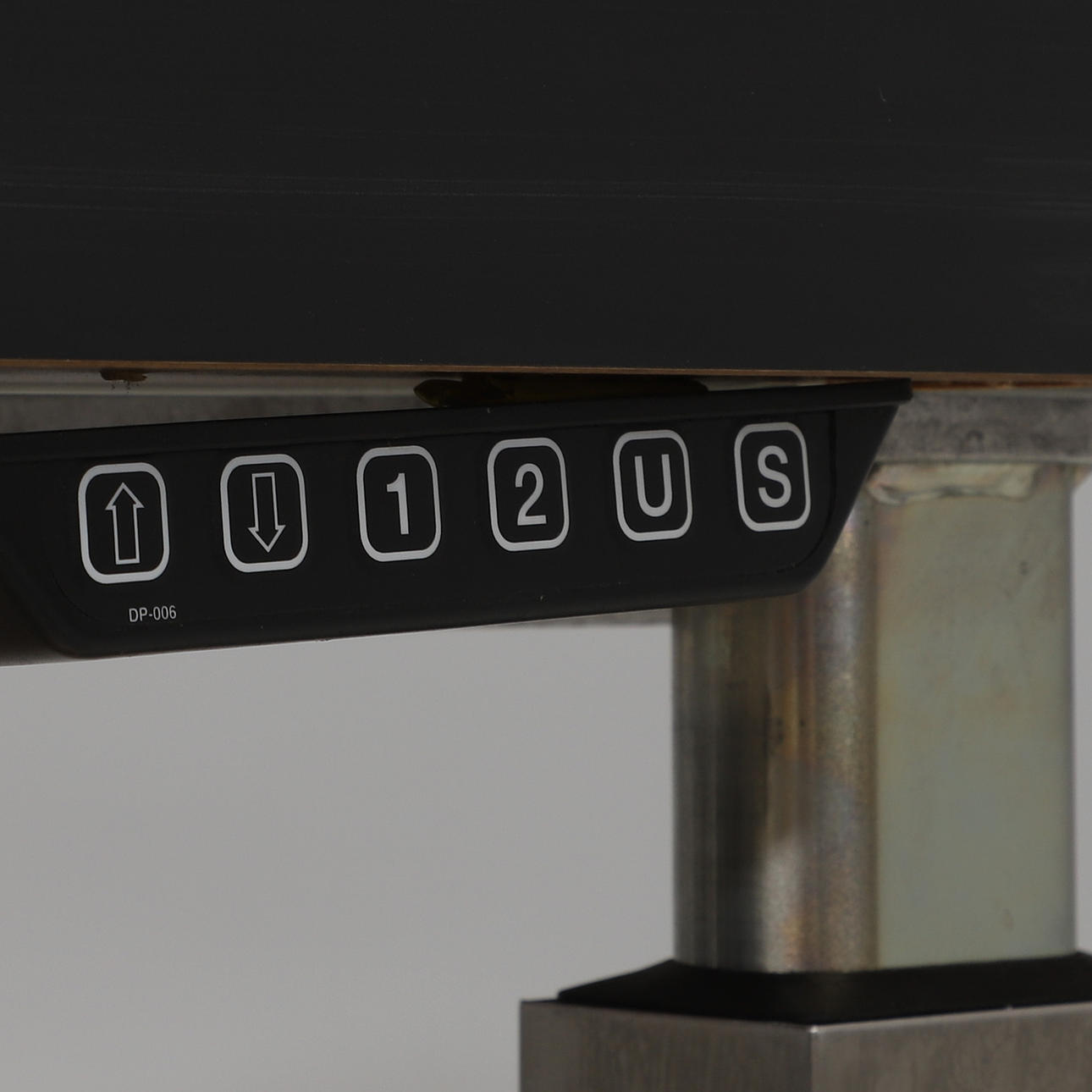 Can be raised and lowered. Black laminated matte disc on metal leg stand. One hurts with three boxes. Length 240, depth 105, adjustable height.