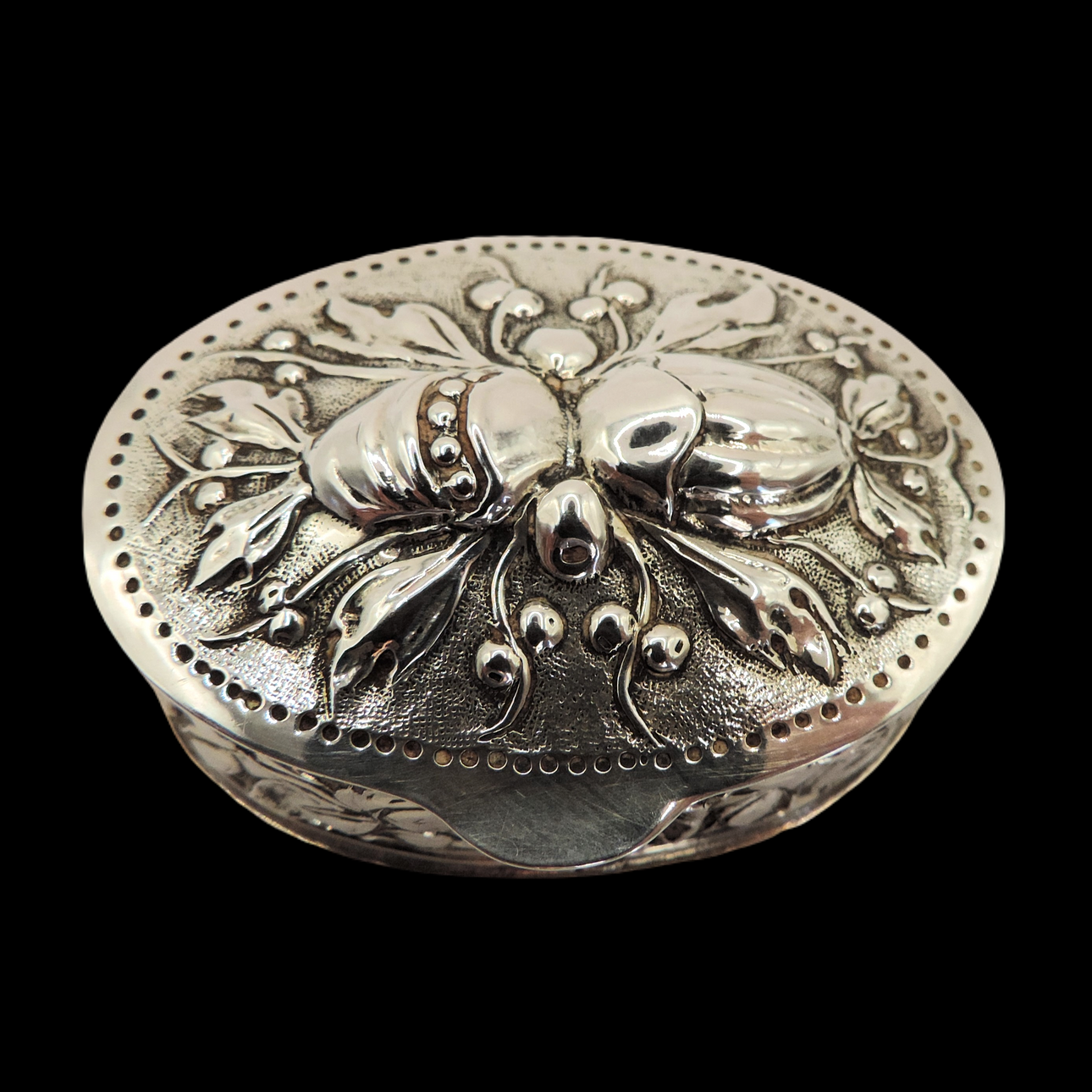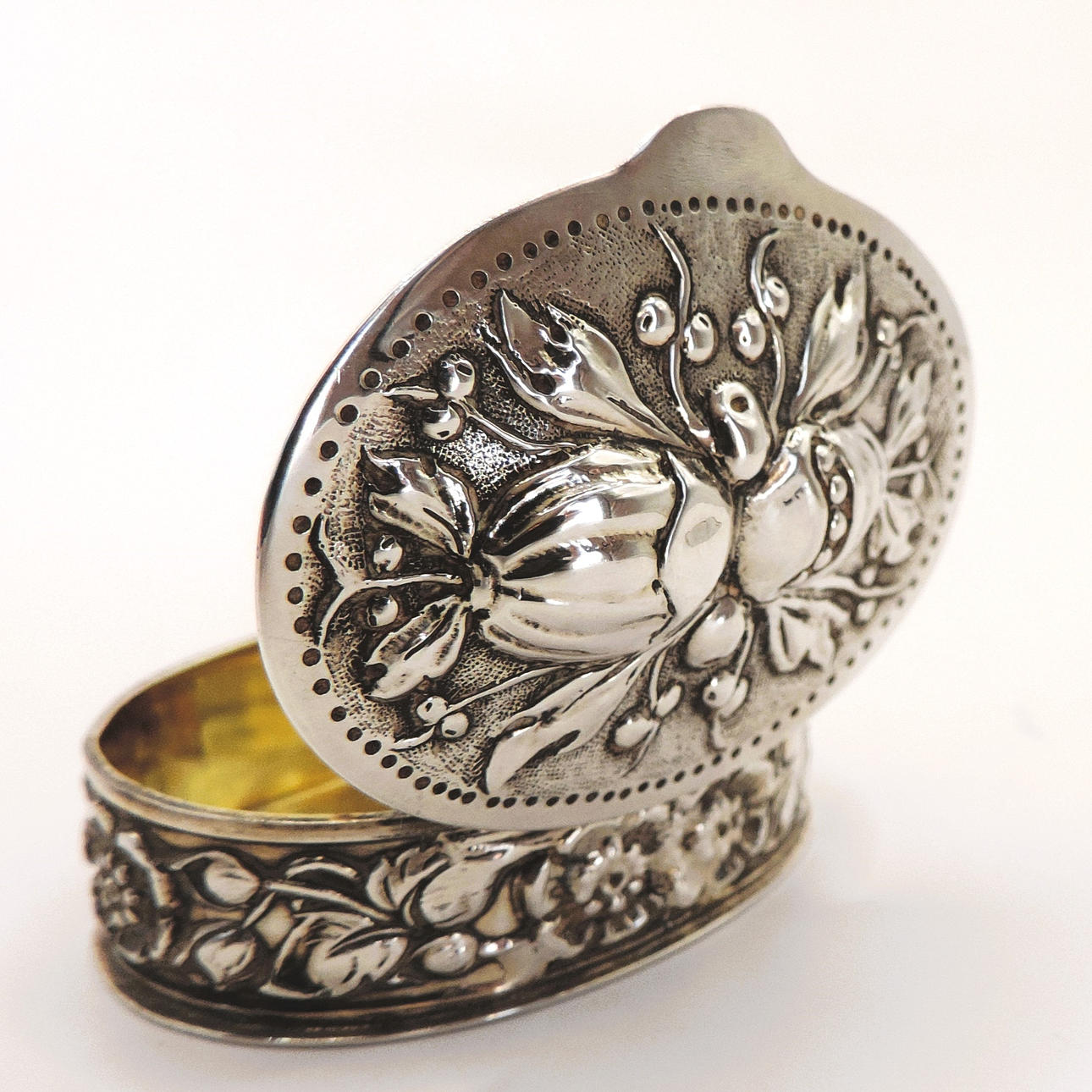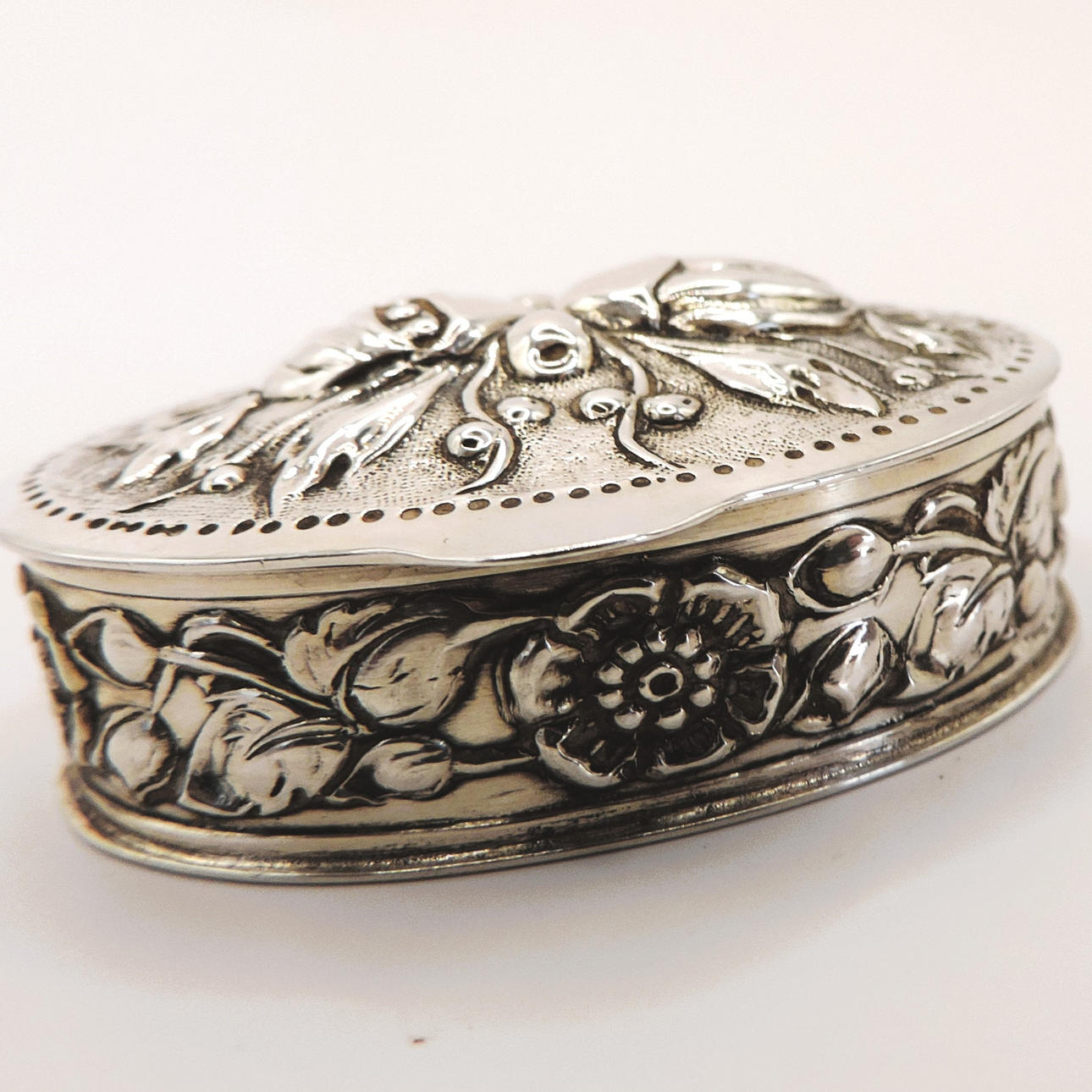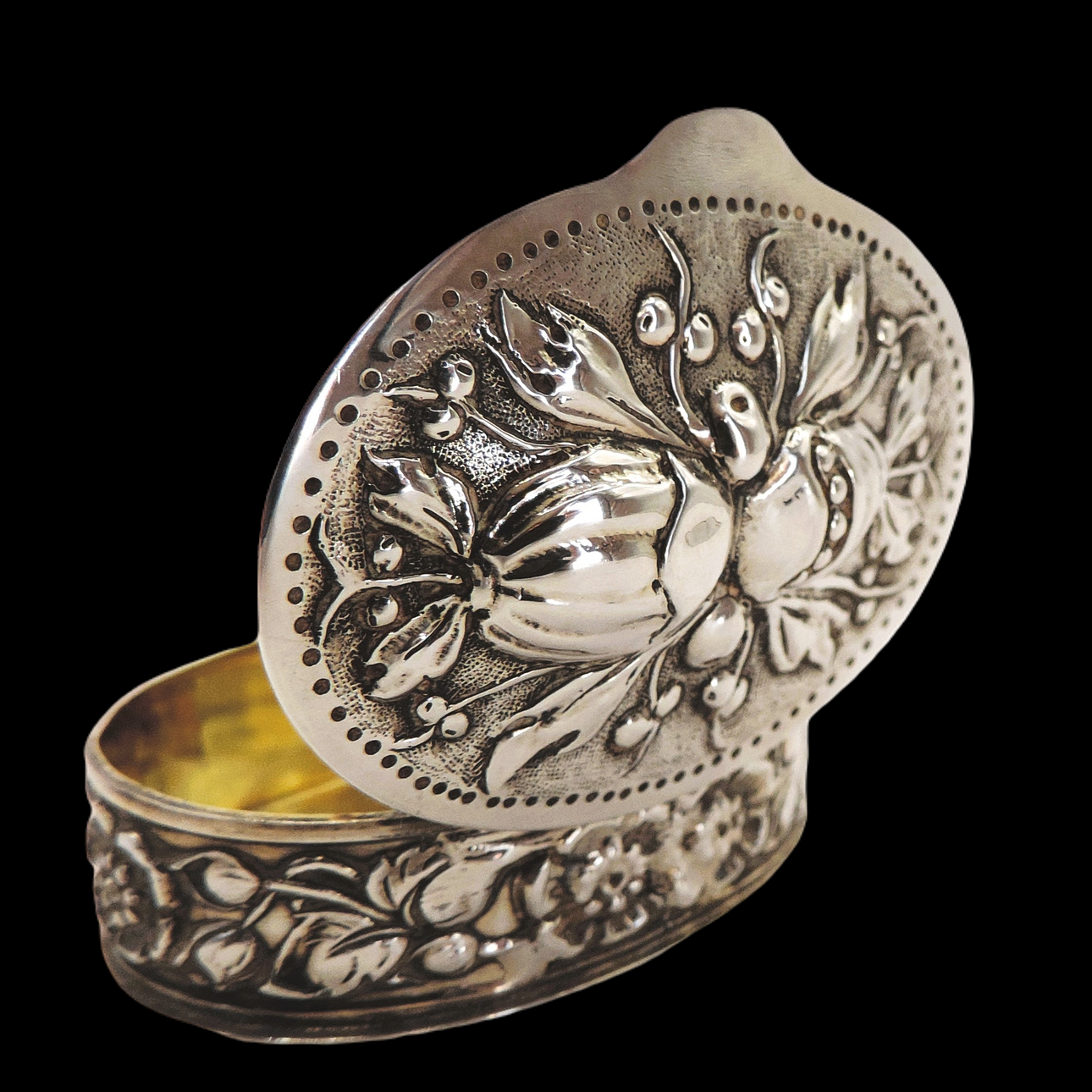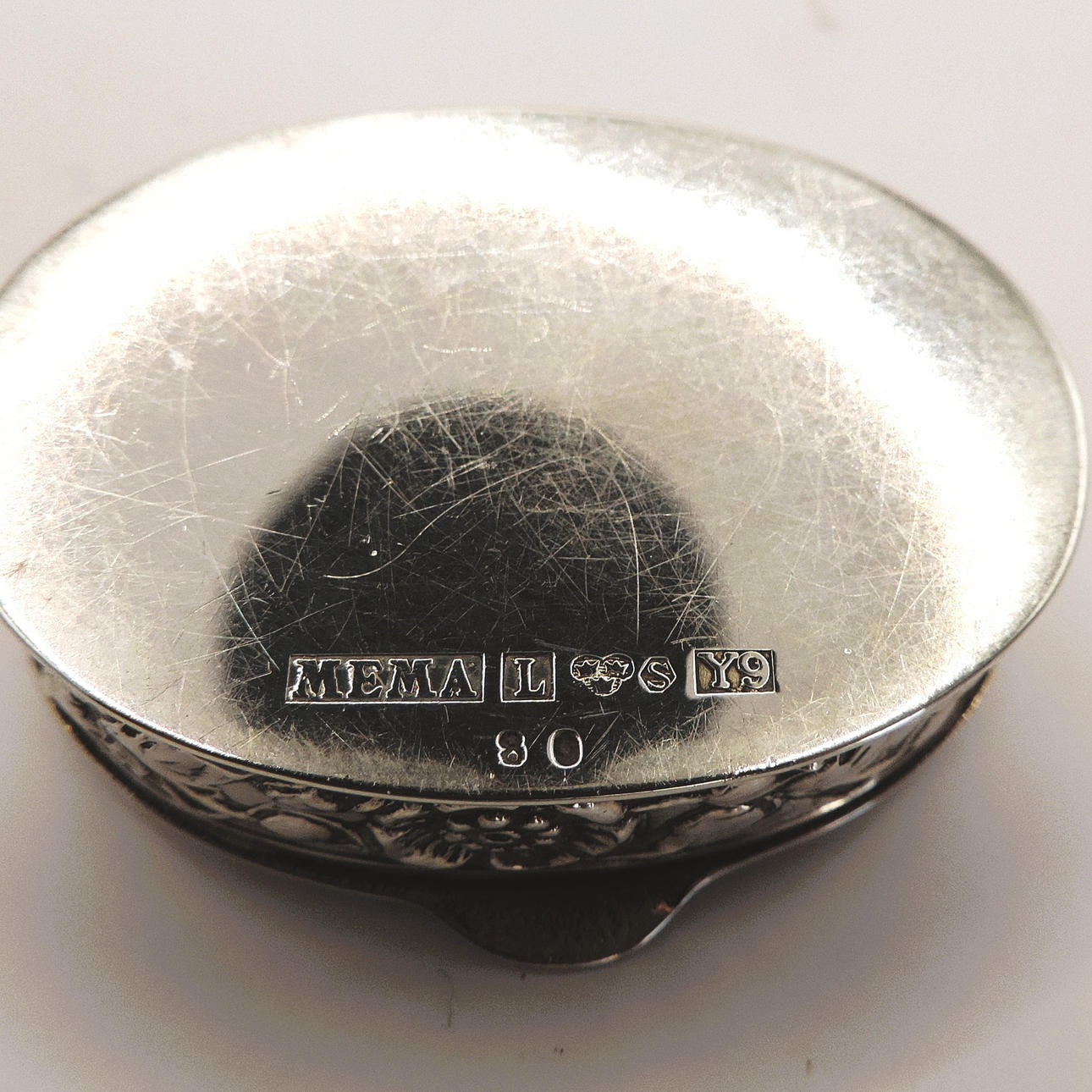 A delightful and fine quality antique Swedish silver pill box with raised decoration. The pill box measures 5cm long x 4cm wide. Makers and Swedish silver marks on base MEMA letter L which dates it to 1912 and three crowns letter S, Y9 and 80.