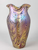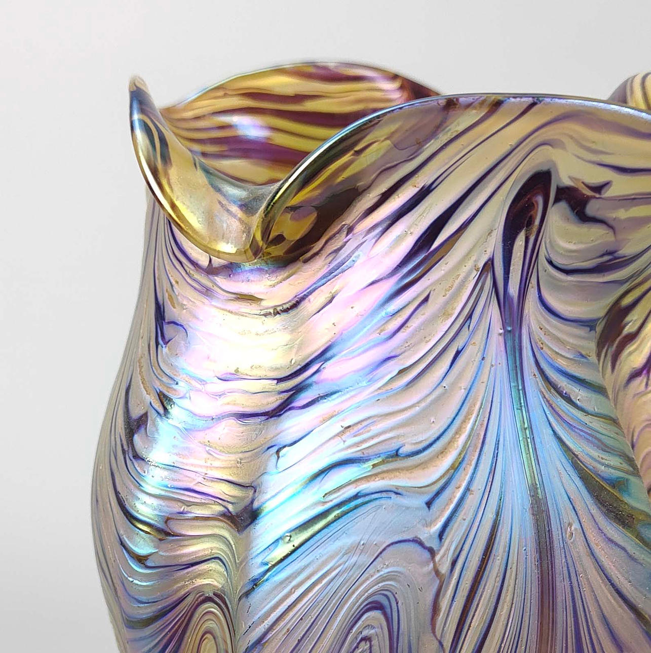colourless hand-blown glass, spherical base, ovoid quadruple recessed body with equally wavy pinched edge over slightly tapered transition, marbled, spun, irregularly warped up and down threads on iridescent surface, H ca. 27 cm, Wilhelm Kralik son Eleonorenhain Bohemia around 1900.