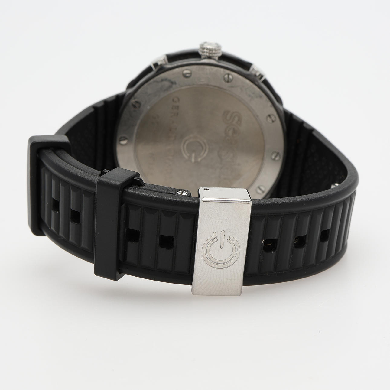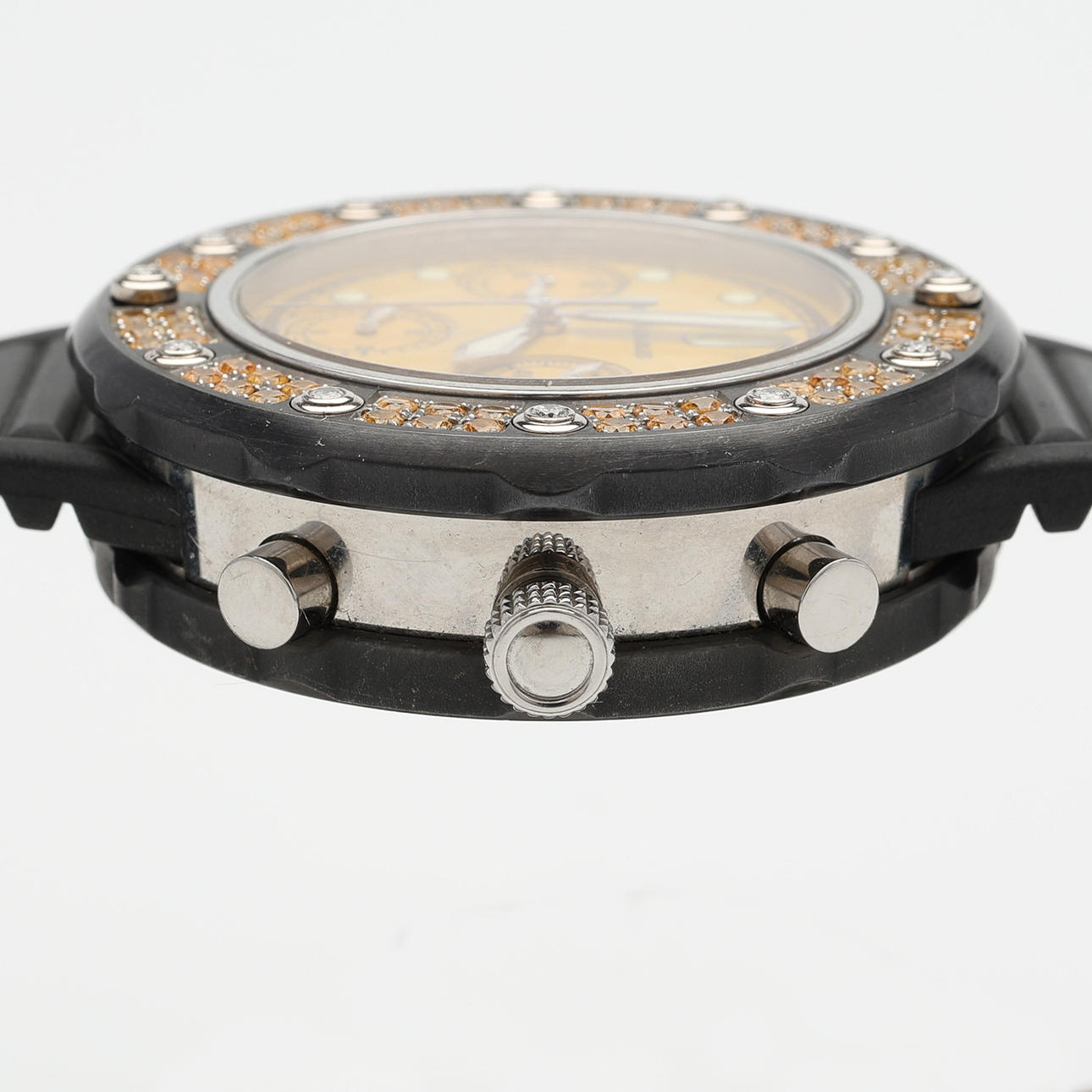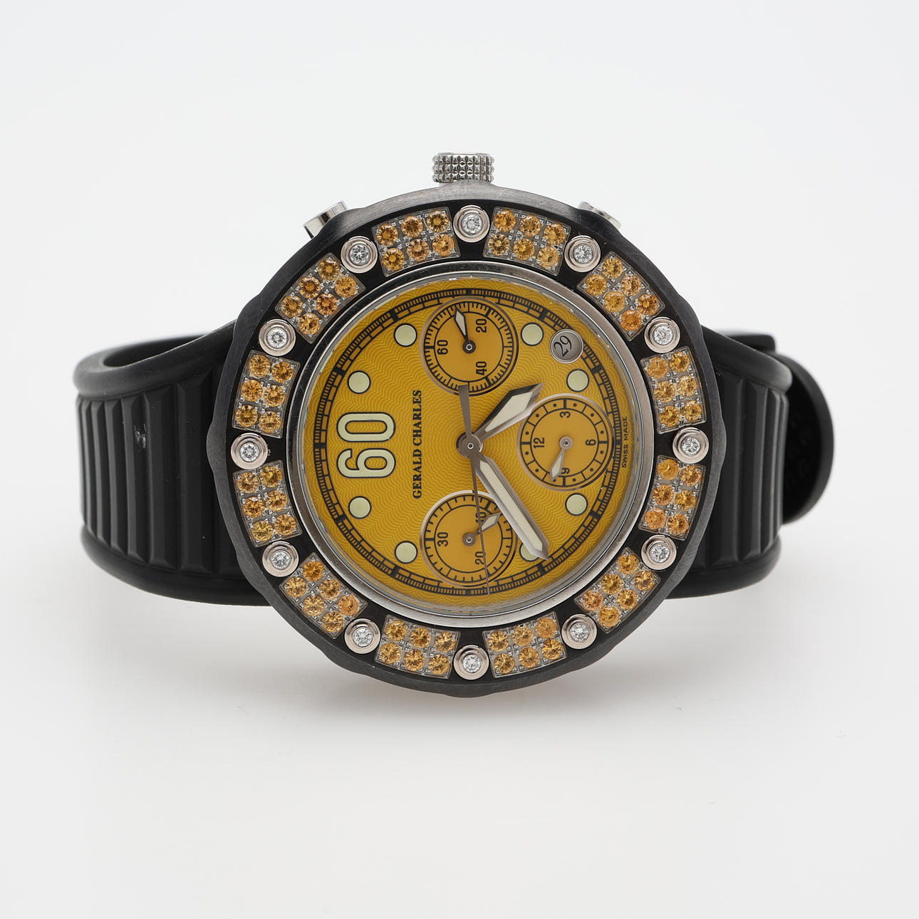 Chronograph, automatic movement with date, model GC9, no 152, steel with diamonds and yellow sapphires, dial with guilloche yellow enamel, diameter 42 mm, integral bracelet made of rubber with folding clasp made of steel.