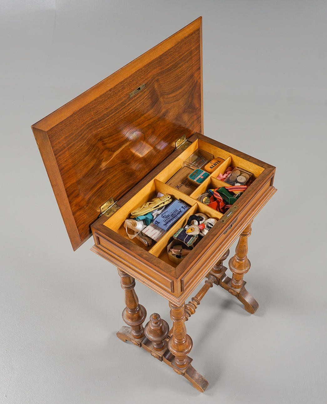 Veneered with walnut, turned leg stand, includes various sewing accessories.