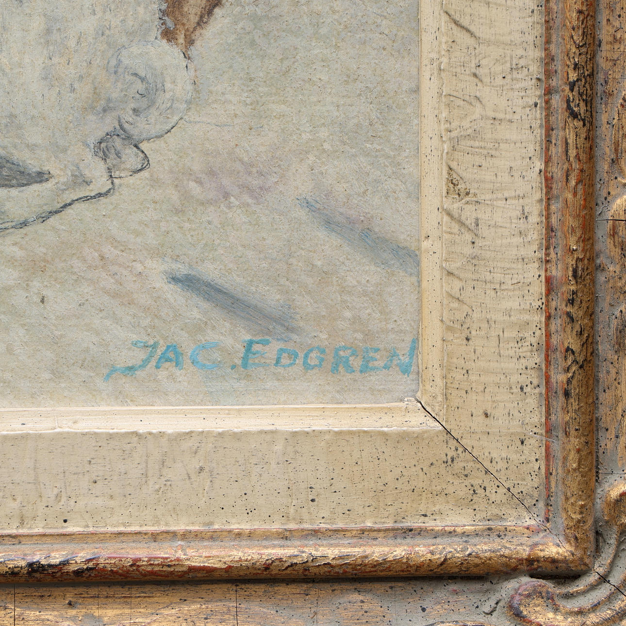3302294. JAC EDGREN. Mixed media, hunter with hungry hare, signed.