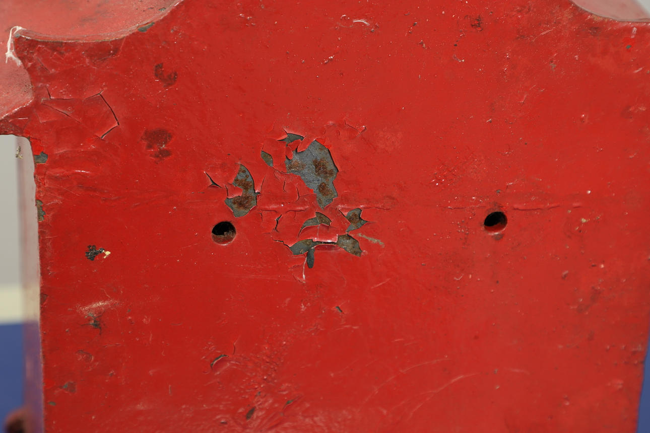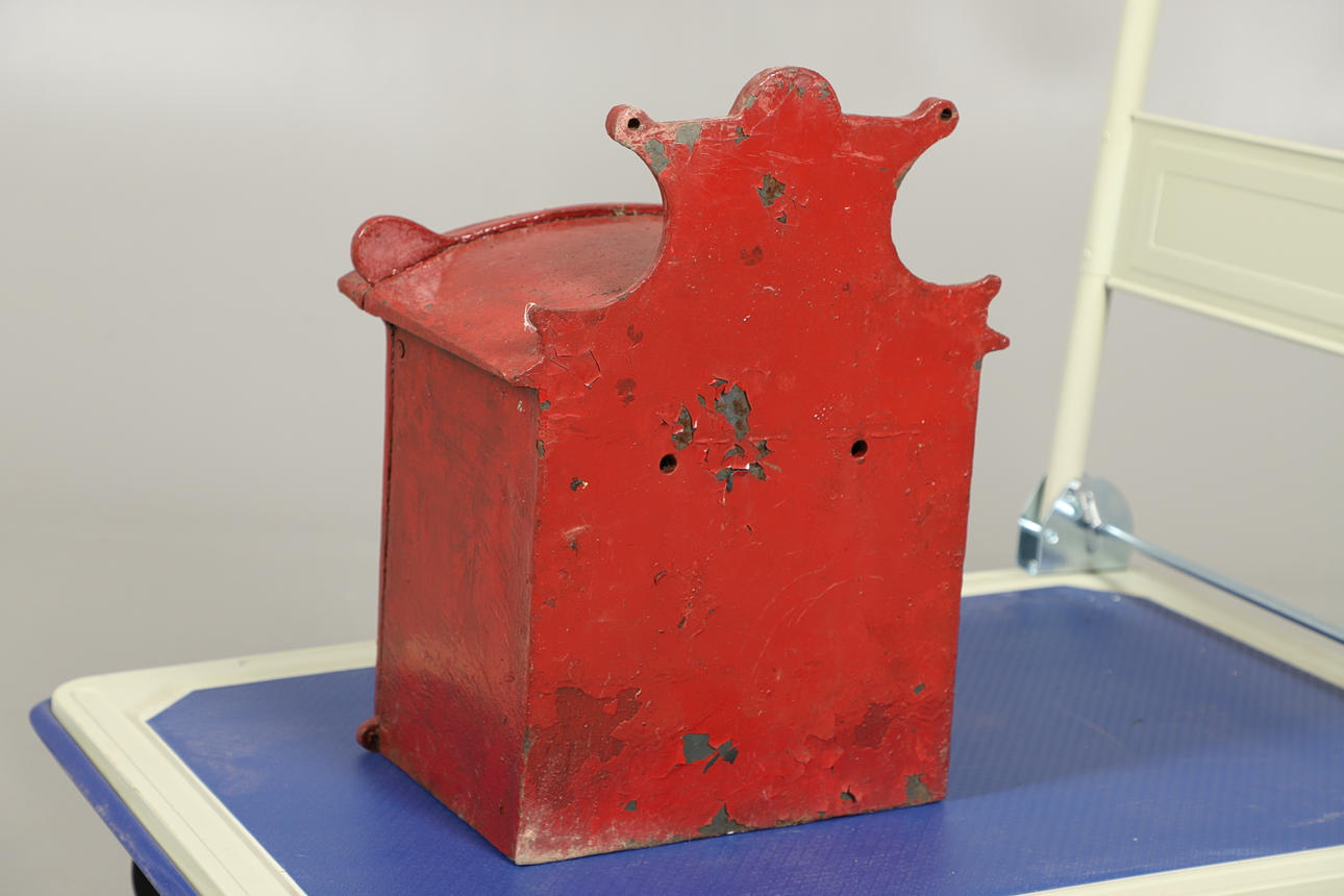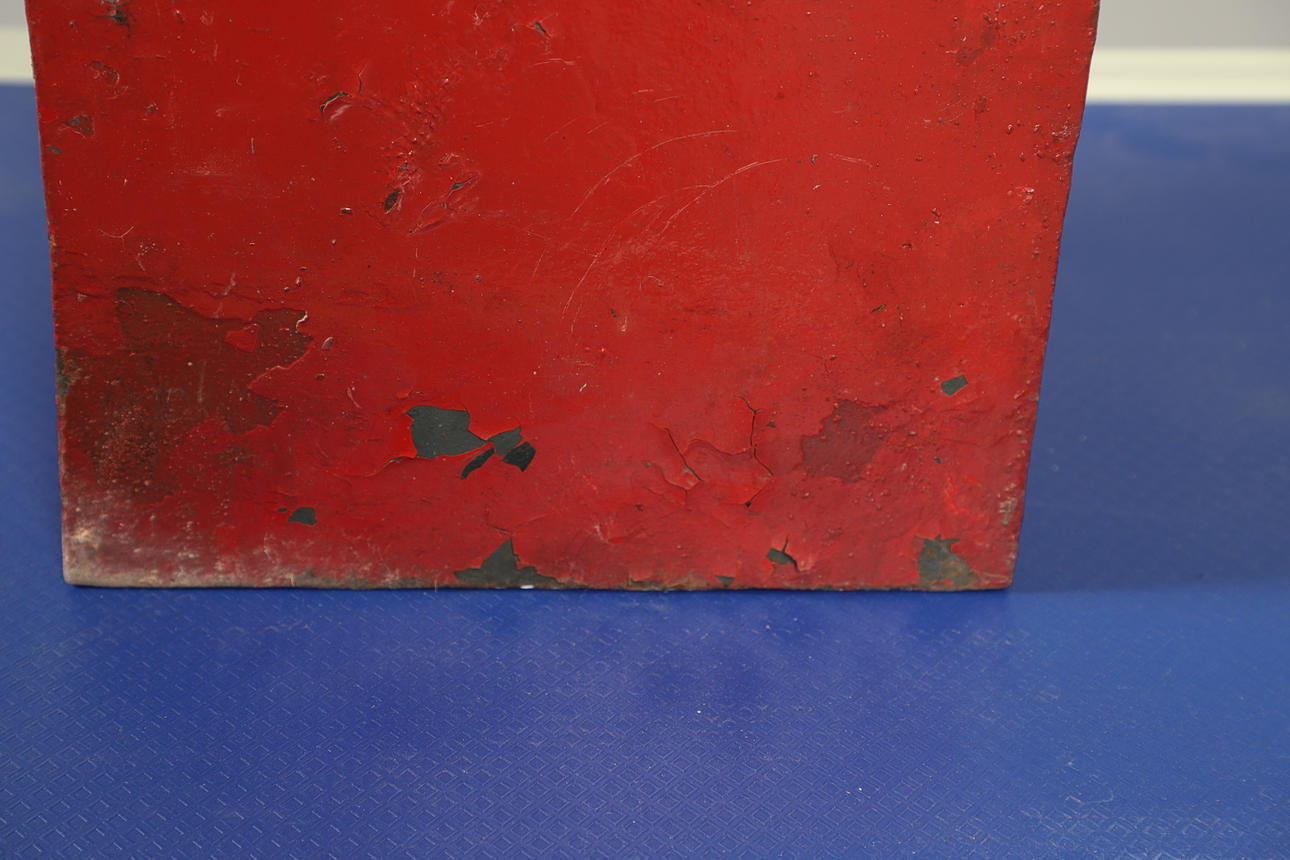 Originally made for outdoor use, painted red and decorative with "Letters" and Post Bugle in relief. Door opens with assistance, no lock. Height 45cm x Width 33.5cm x Depth 24cm.