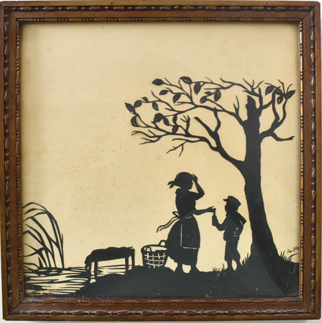 Carl Michael Bellman, Swedish skald, 1740-1795). Schmidt, Henric. Bellman's Gallery. Silhouettes by Henric Schmidt. If. Seligmann & C:ni, Stockholm, 1880. Large 4th in a contemporary half-parchment band with gilt back text on red label and binders marbled in red and green. Decorated cover sheets. Front cover bound. Illustrated with 40 plates with silhouettes of Fredman's epistles and songs.