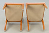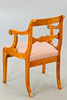 Solid ash. Conical square legs on the front. Trapezoidal frame, padded and covered with rose-colored velour. Passive center brace and wide shoulder board between slightly swinging back struts. A chair with armrests. HxShxWxD: approx. 84x48x44x50cm.
