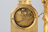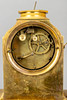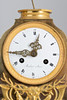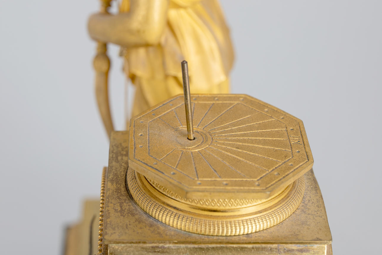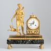 Fire-gilded bronze. Rectangular marble plinth on bell-like feet on balls. Three-sided palmette frieze on the contrasting base zone of the rectangular watch case. The narrow sides slightly slanted upwards and curved. Crowning sundial (gnomon missing). White enamel dial with Roman hours and quarter-hour display with Arabic numerals. Pendulum with key lift and half-hour bell. On the right, standing next to it is the figure of Diana with a bow and arrow accompanied by a hunting dog. The dial inscribed 'Barberi á Paris'. HxWxD: 40 x 32.5 x 12 cm.