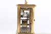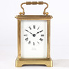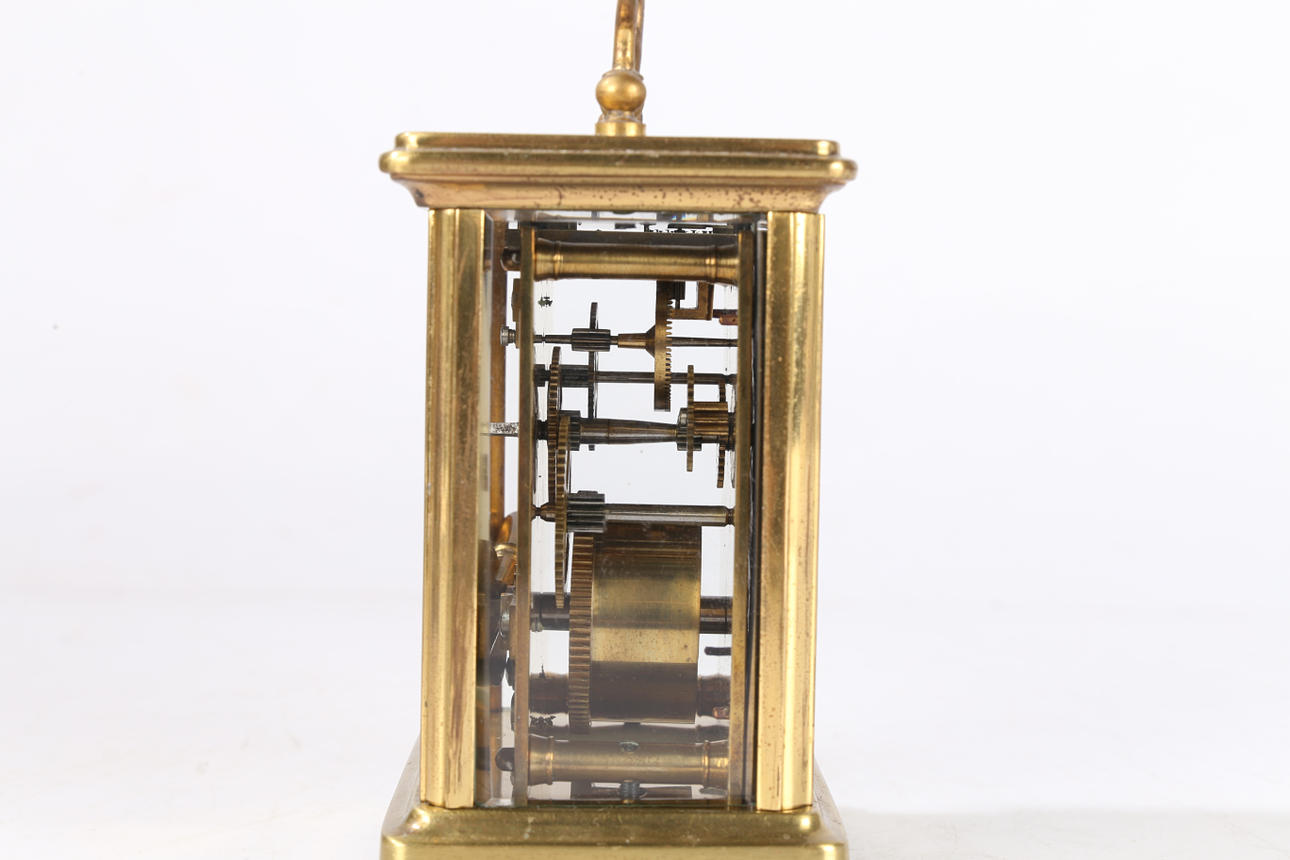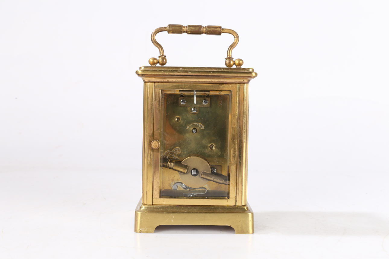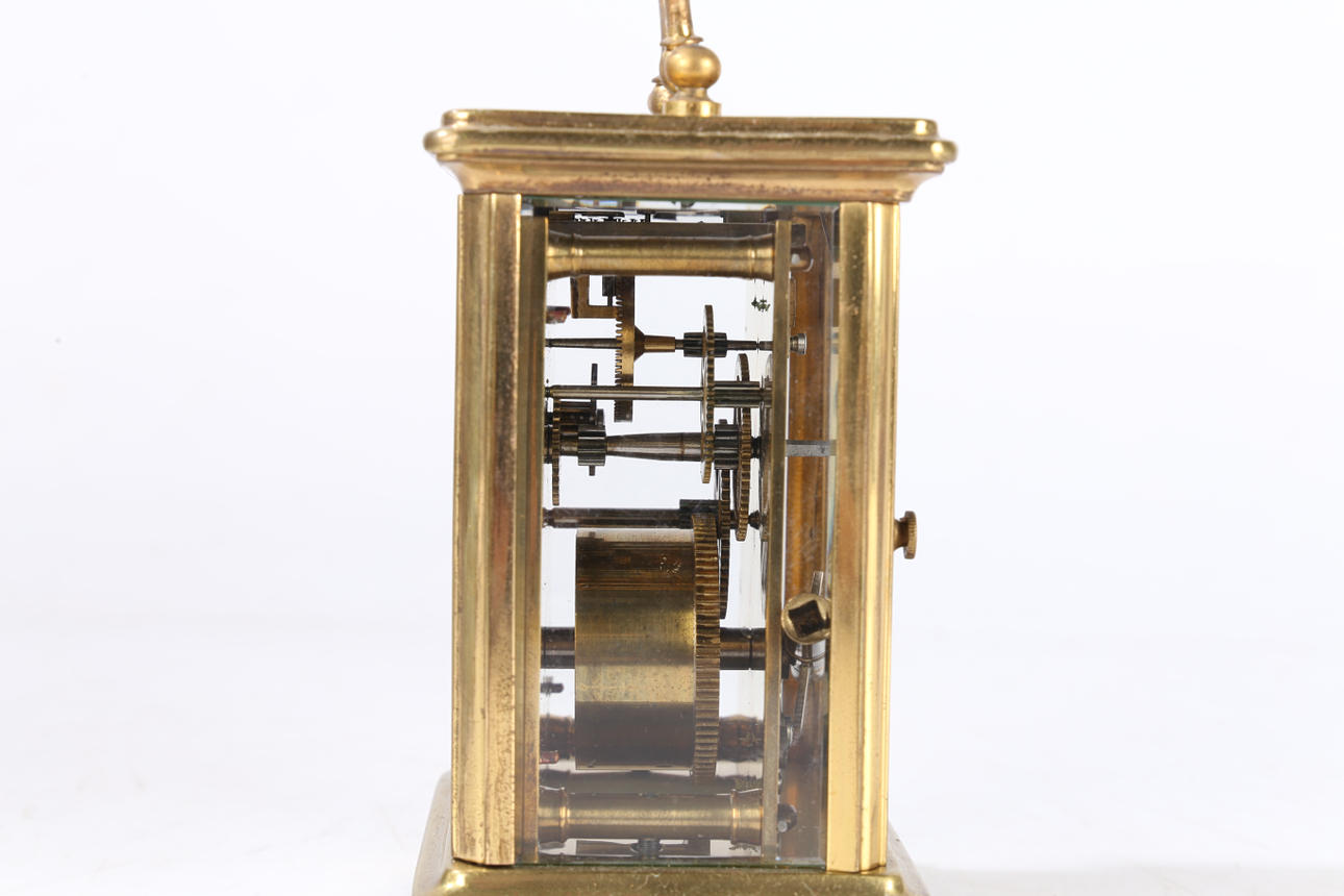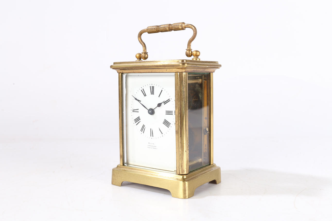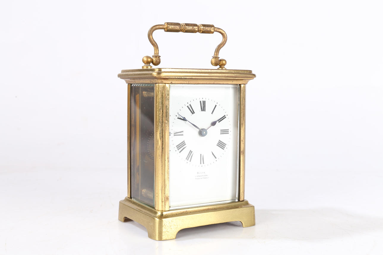 A 20th century brass carriage clock by Biggs, France, having a visible escarpment above a signed white dial with Roman numerals, the movement marked with Lion, 14cm high.