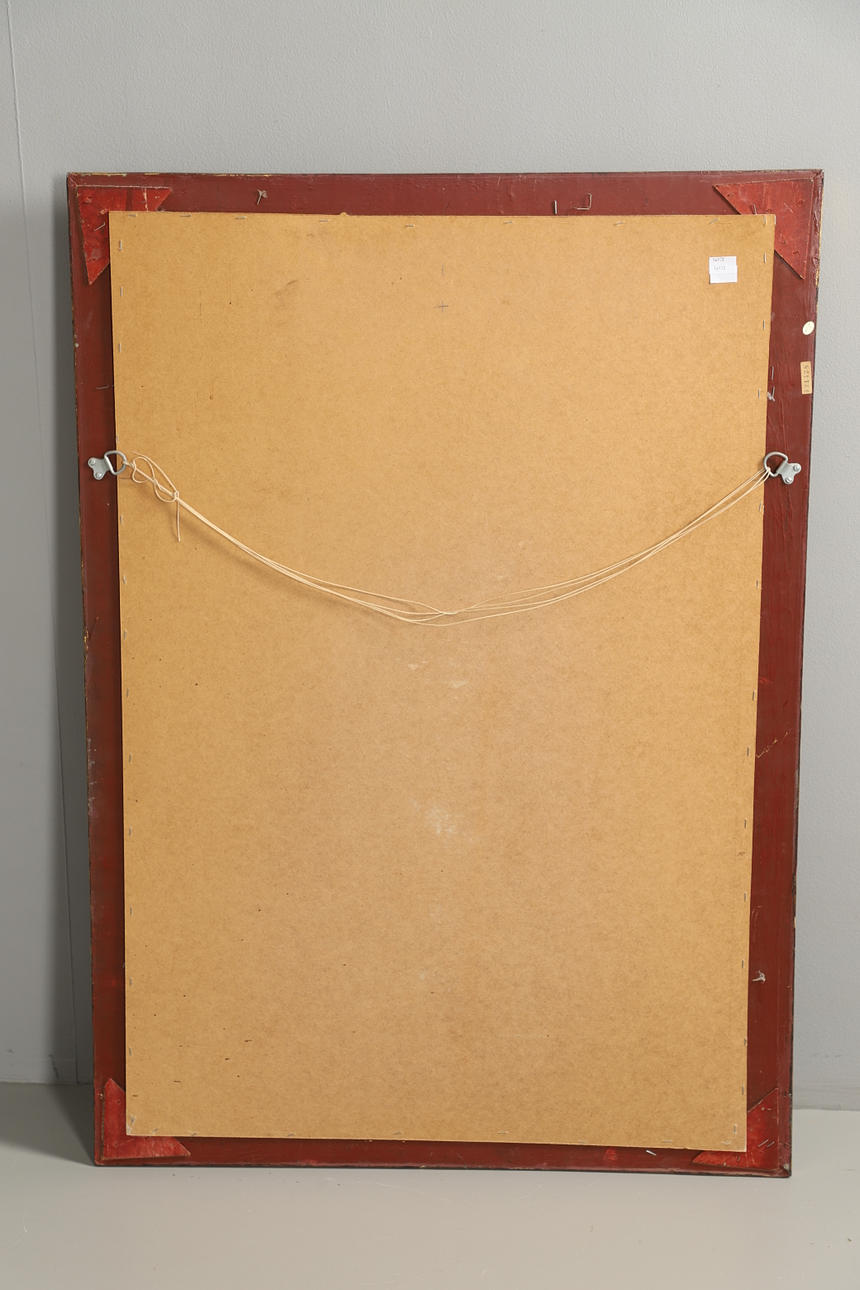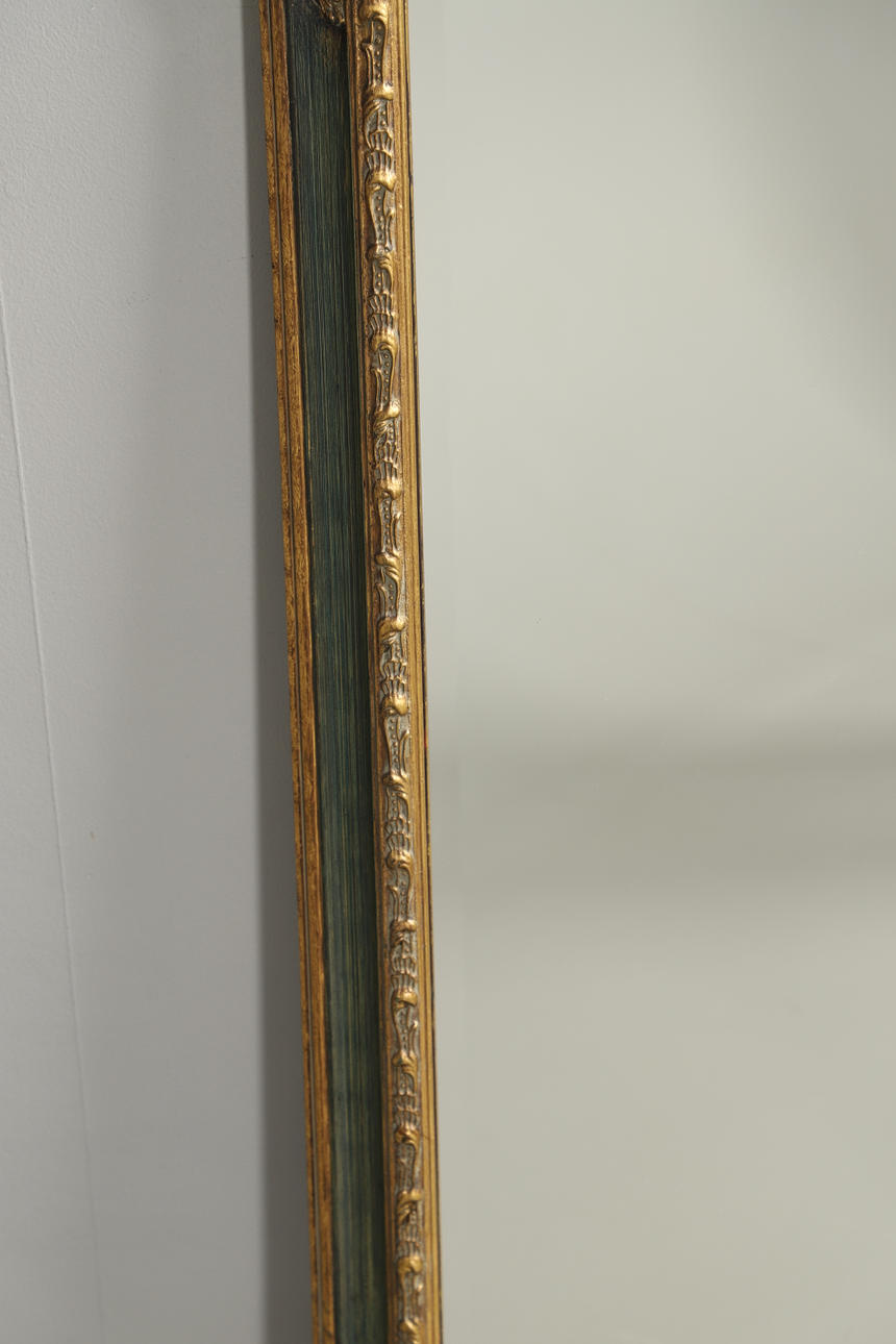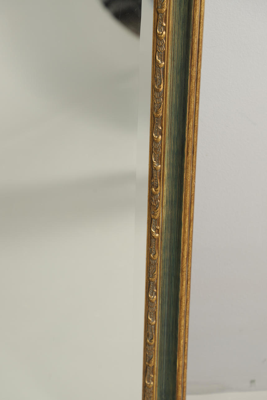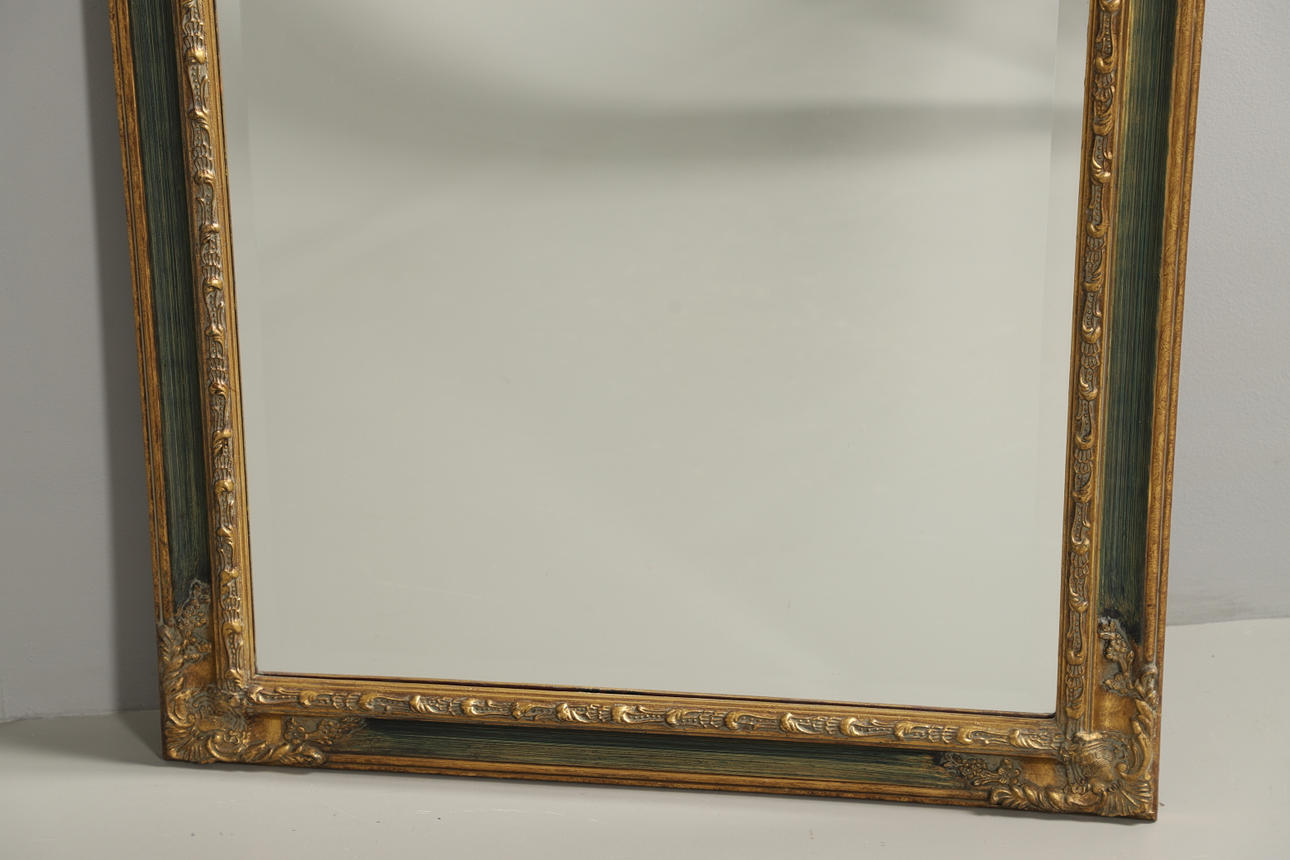 With antique style gold and green painted frame and bevelled edge mirror plate. 104cm x 74cm.