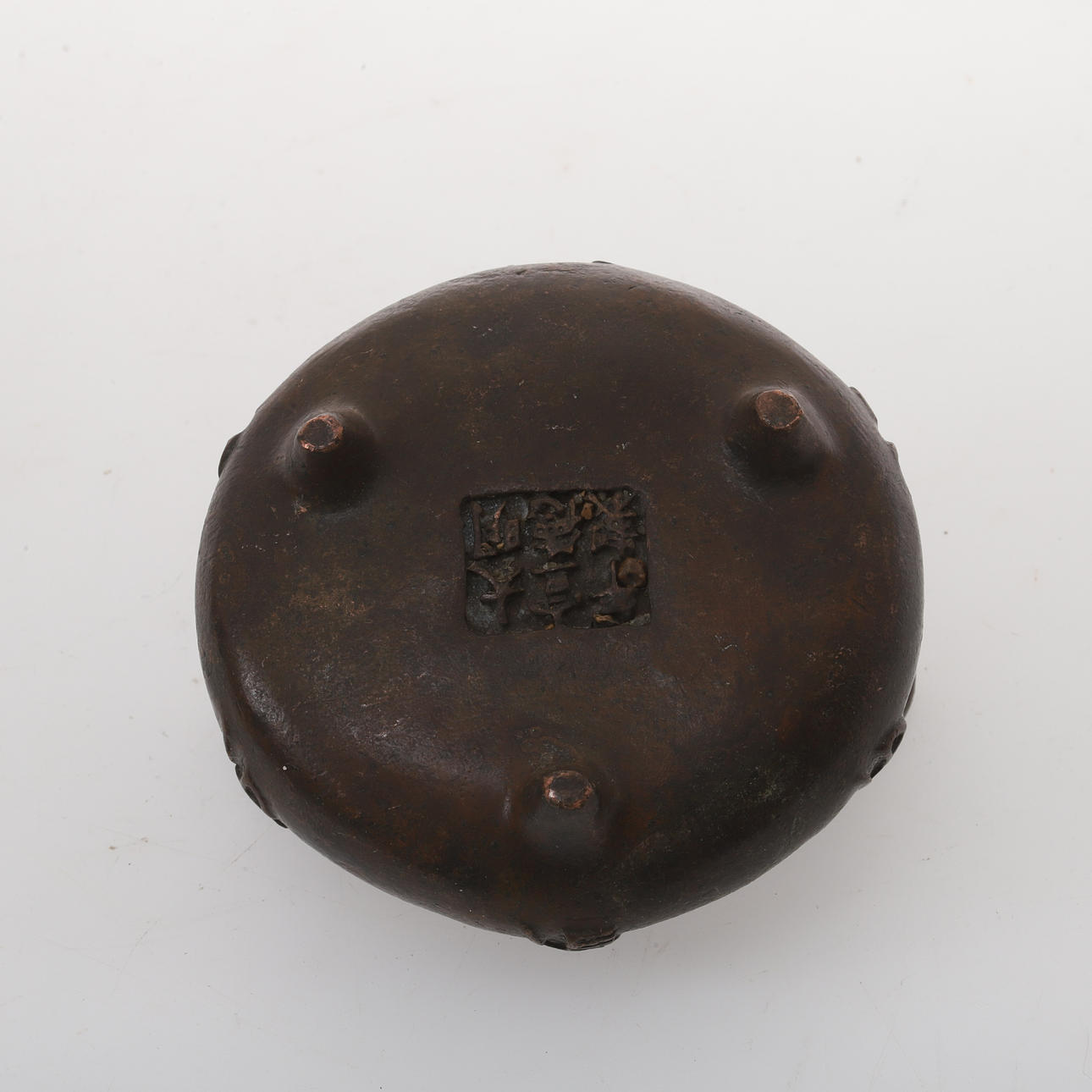 The bulbous sides decorated in relief with symbols, Xuande mark to base, 8.5cm diameter.