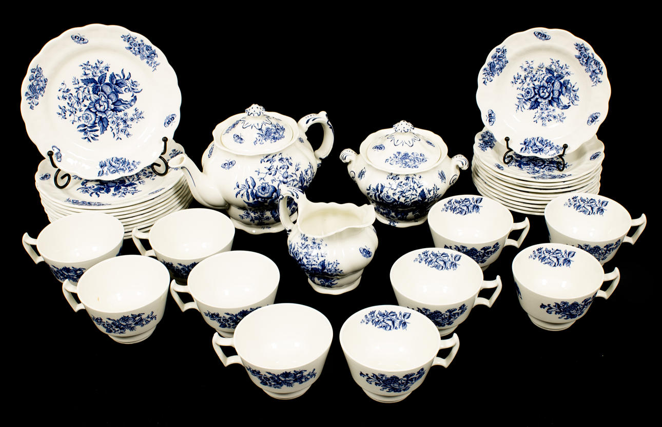 1 Creamer, height 10 cm 1 Sugar bowl w/ cover, height 13 cm 1 Teapot w/ cover, height 15 cm 10 Cups, height approx. 6 cm 12 Saucers, diameter 15 cm 12 Plates, diameter approx. 18 cm.